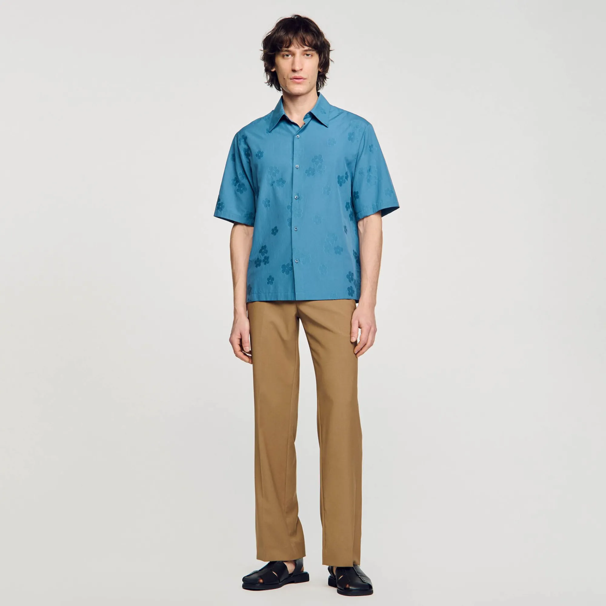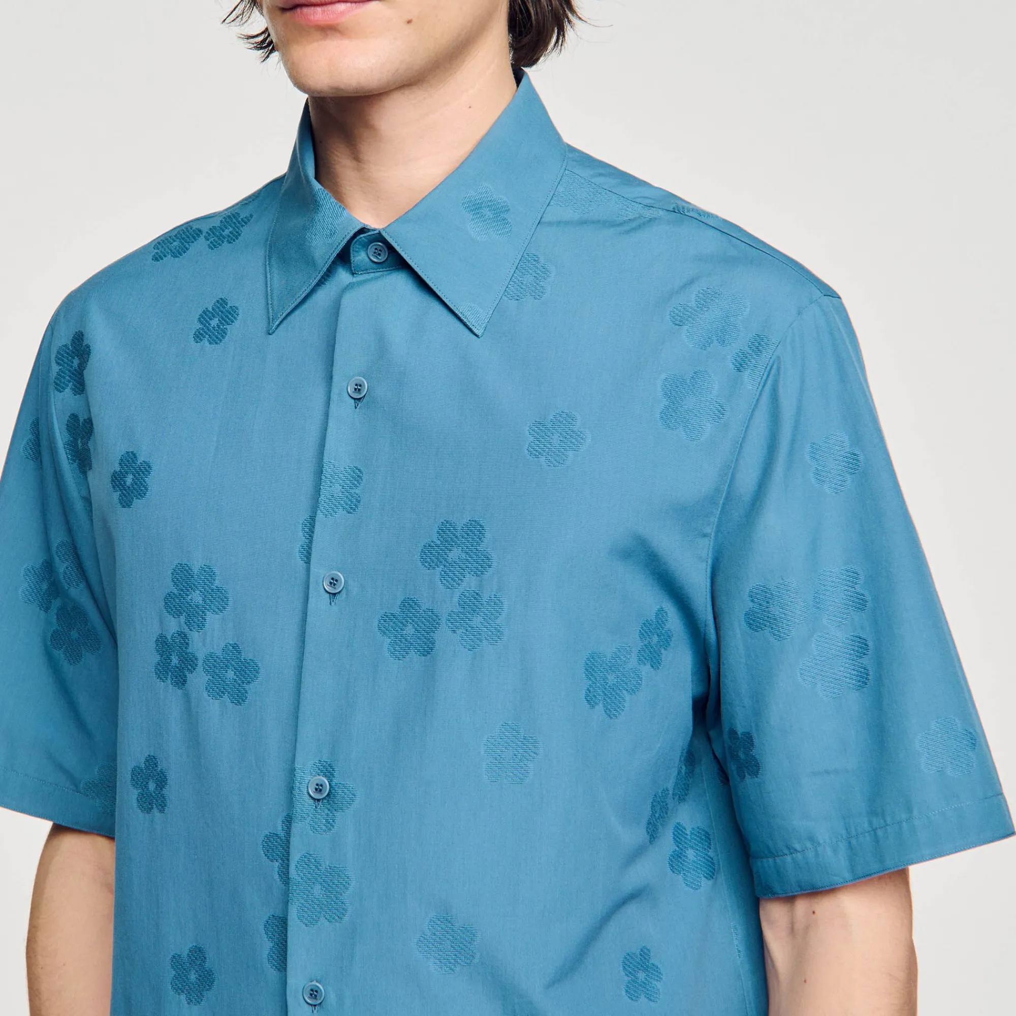 Camisa Oversized De Algodão Com Jacquard Floral, Gola, Manga Curta E Fecho De Botão. Camisa Oversized Sandro Homme Jac…