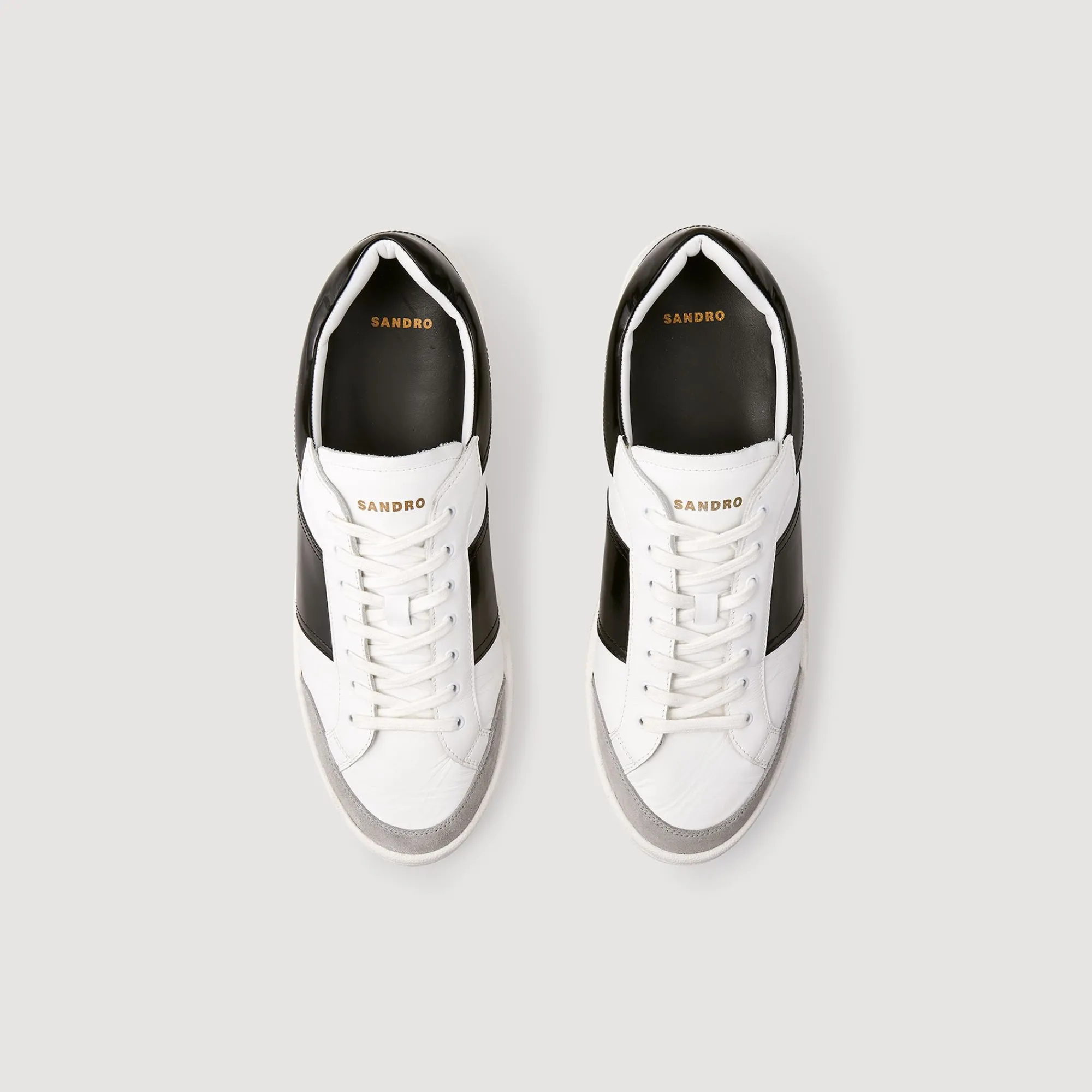 Tênis De Couro Estilo Vintage Levemente Elevado, Com Detalhe De Aplicação De Couro Envernizado Contrastante No Tornozelo E Nas Laterais, Aplicação De Camurça Na Frente, Atacadores Nos Mesmos Tons E Sola De Borracha Com Logotipo Sandro Gravado Na Lateral.