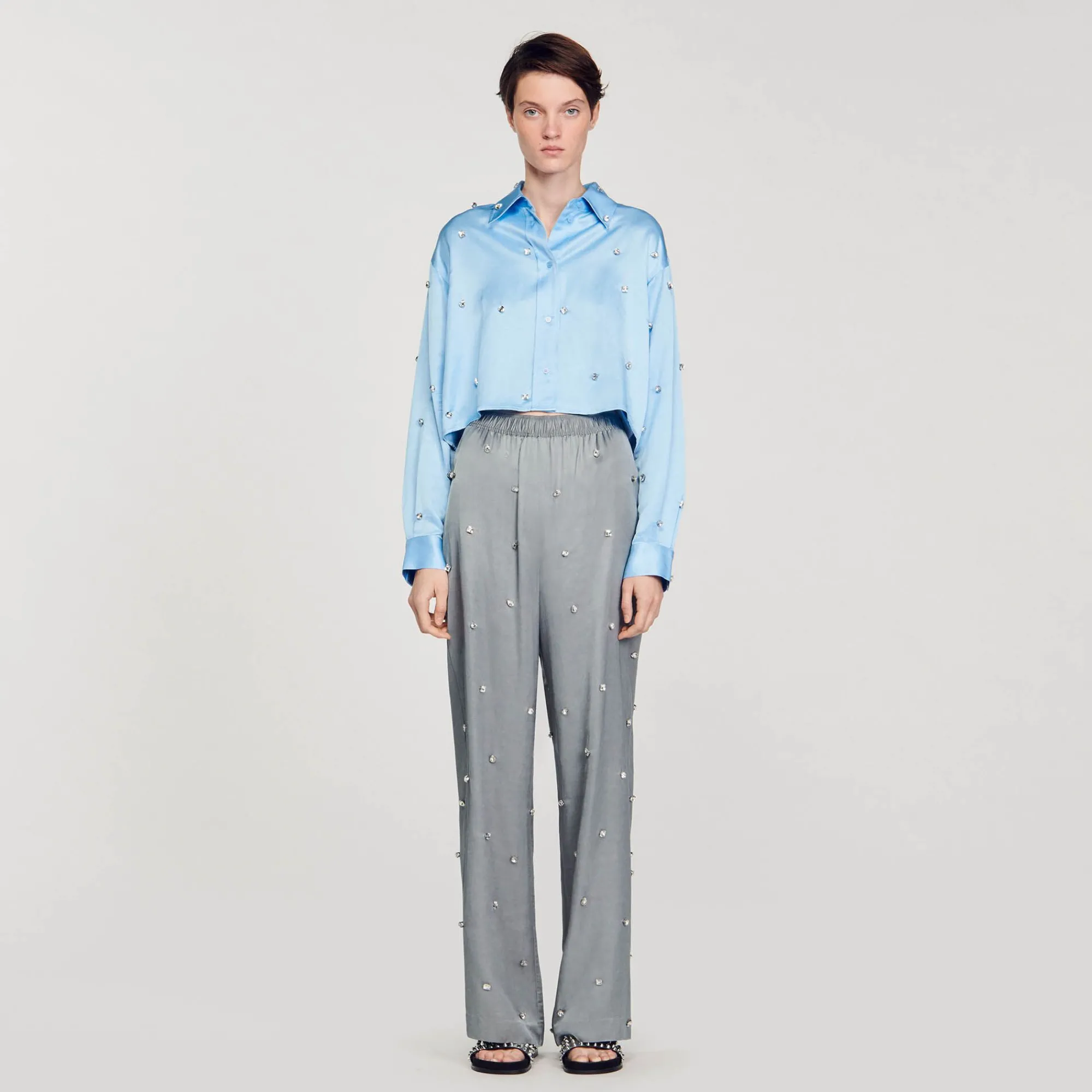 Calça Larga E Fluida Em Cetim Com Cintura Elástica E Detalhe Bordado De Strass. Sandro Calça Feminina Fluida E Cetim …