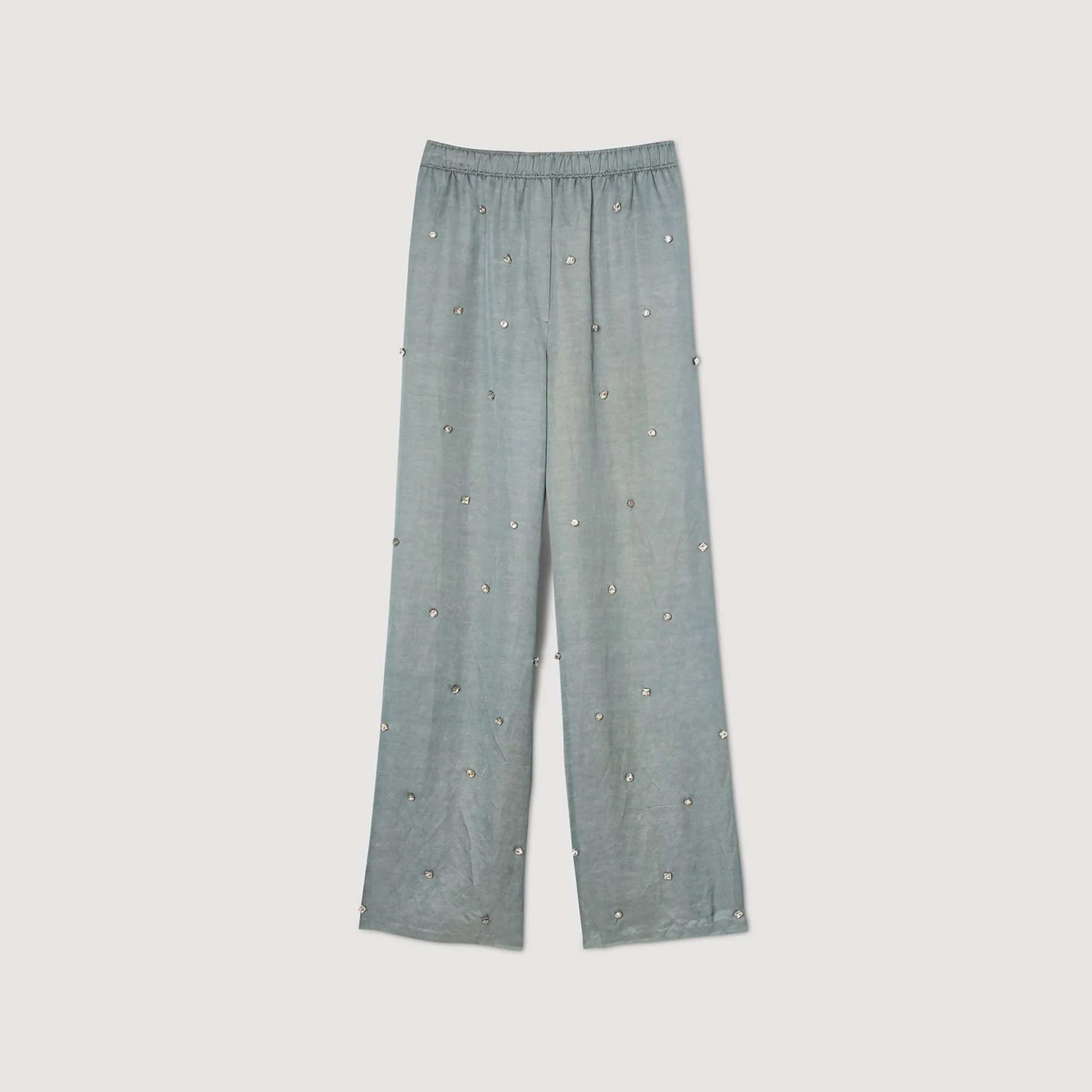 Calça Larga E Fluida Em Cetim Com Cintura Elástica E Detalhe Bordado De Strass.