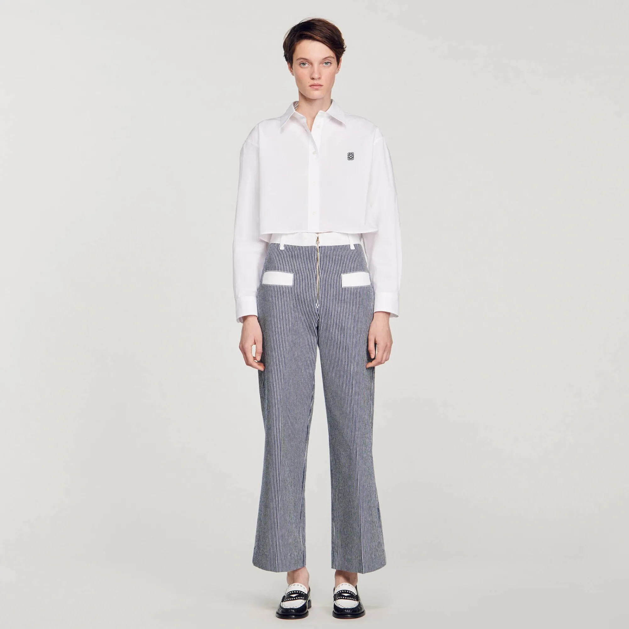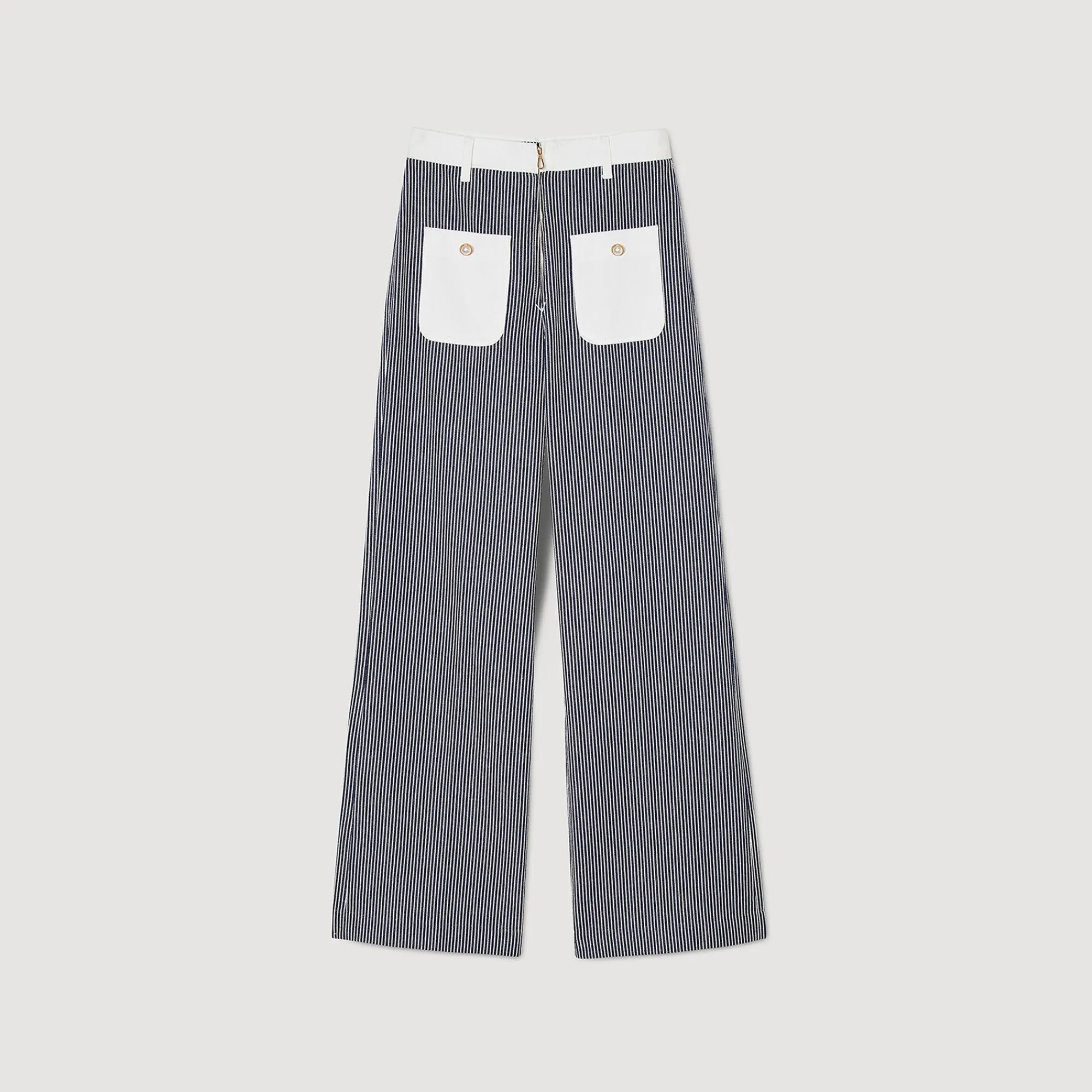 Calça Listrada Com Bolsos E Cintura Jeans Contrastante.