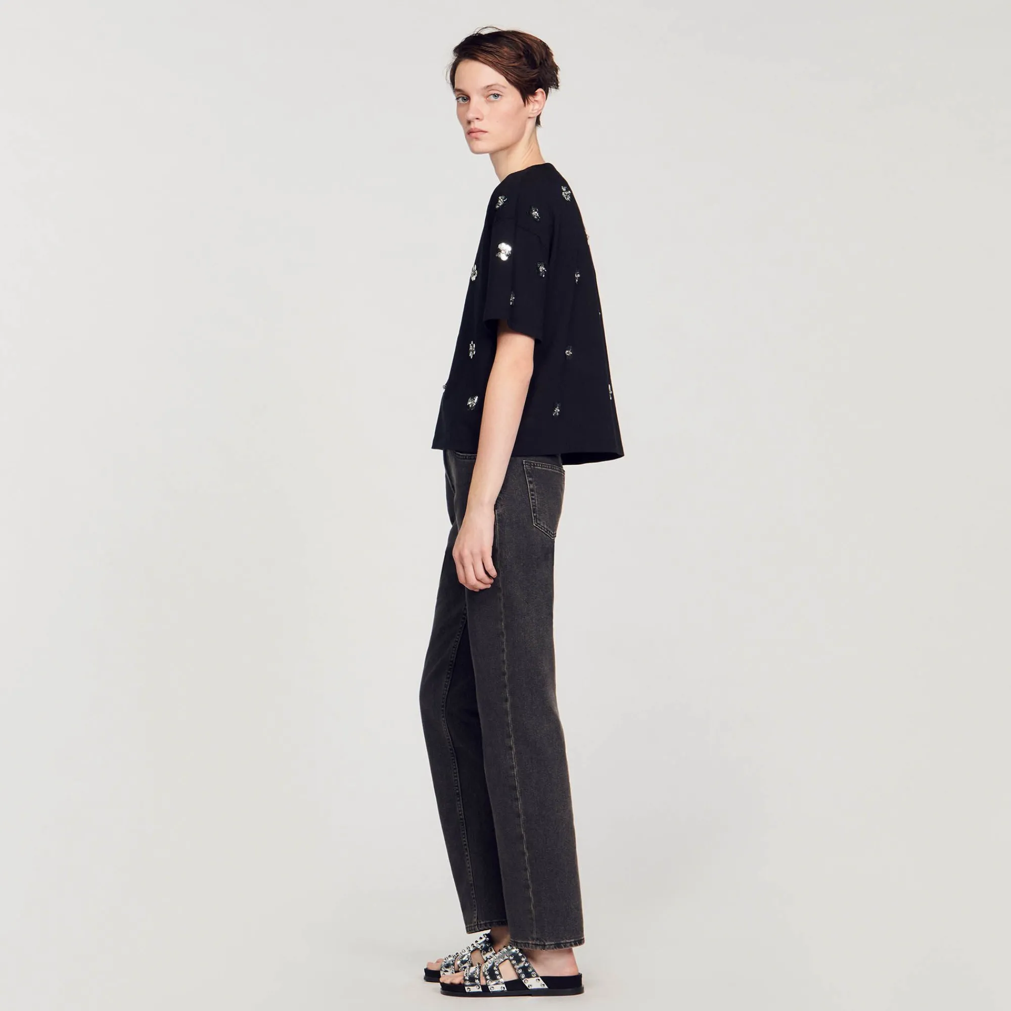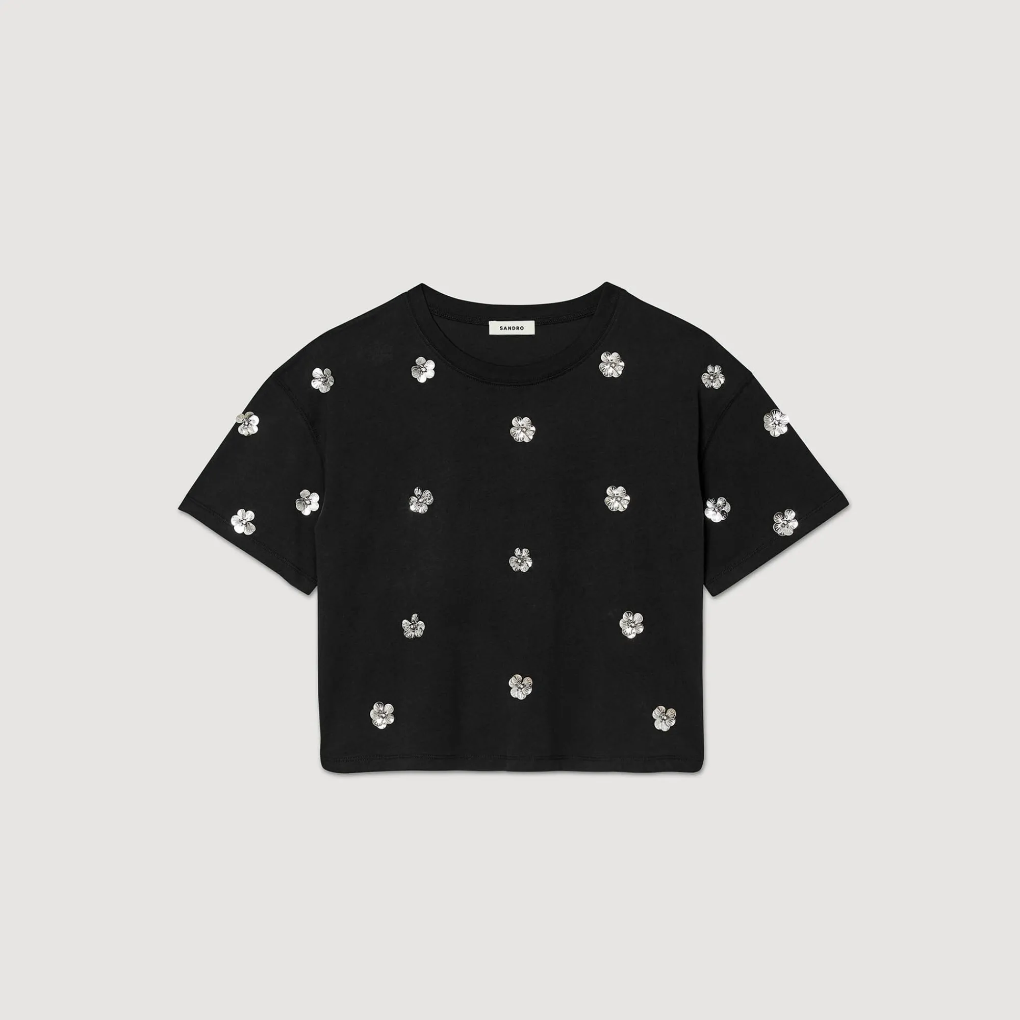 T-Shirt Curta De Algodão Com Decote Redondo, Manga Curta E Detalhe De Flor Em Lantejoulas Metálicas.