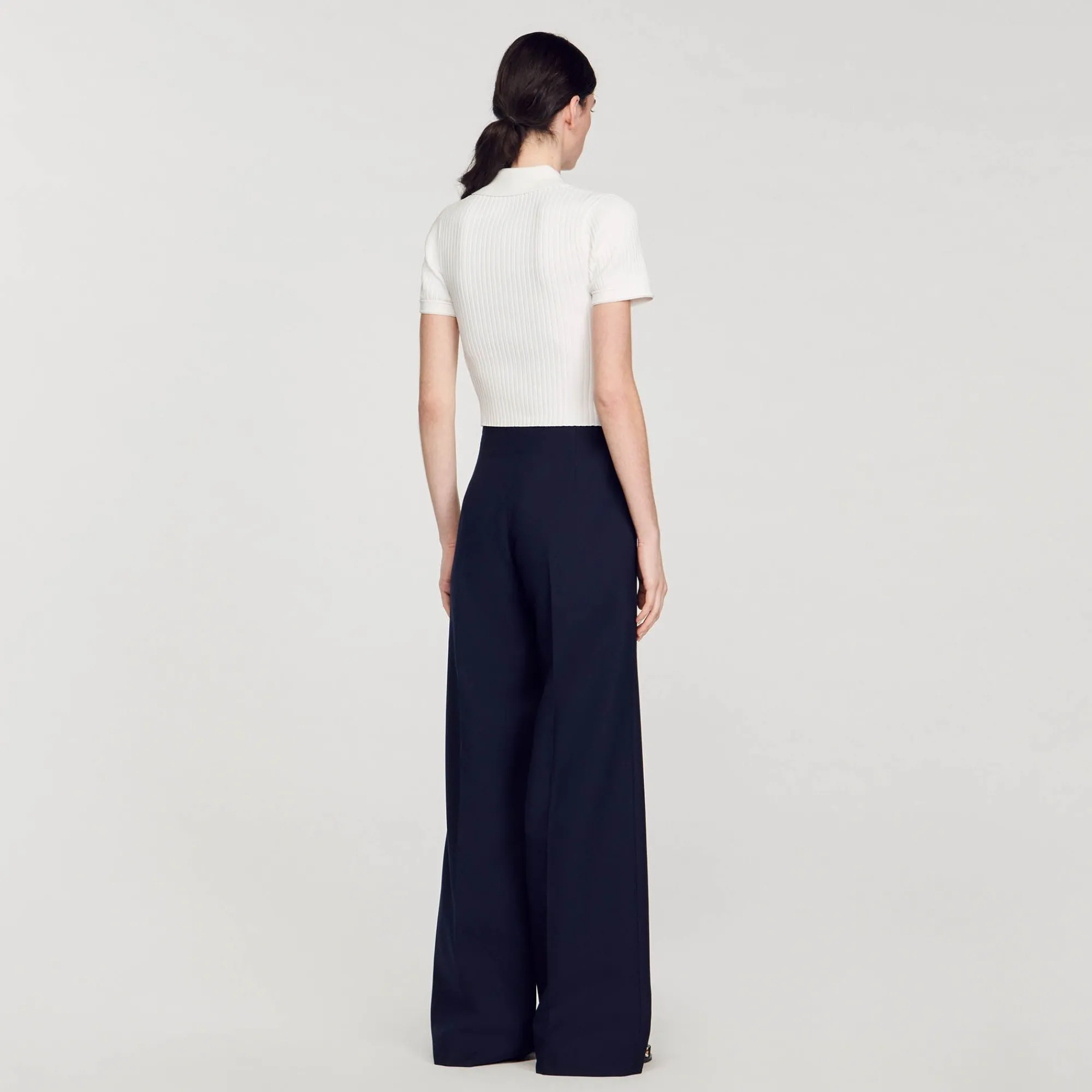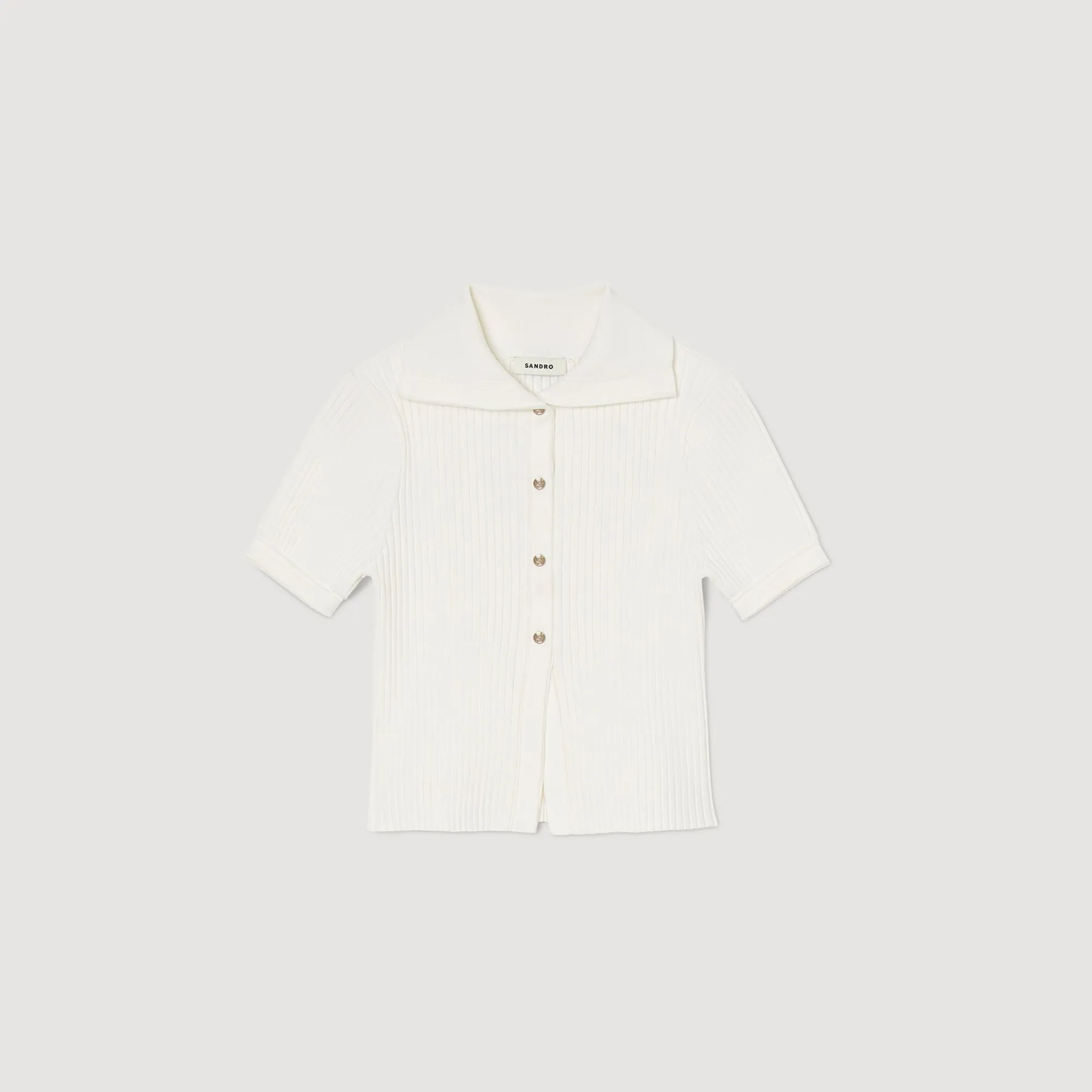 Suéter Curto De Malha Canelada Com Gola De Jaqueta, Mangas Curtas E Fecho De Botão.Sandro Suéter Feminino De Malha Cu…