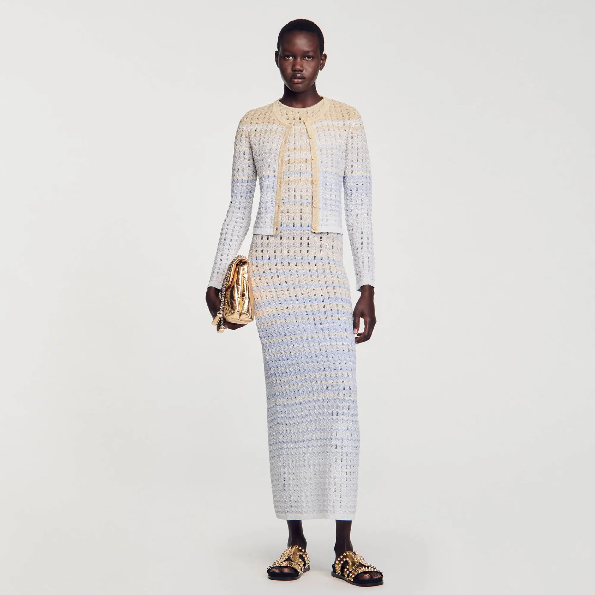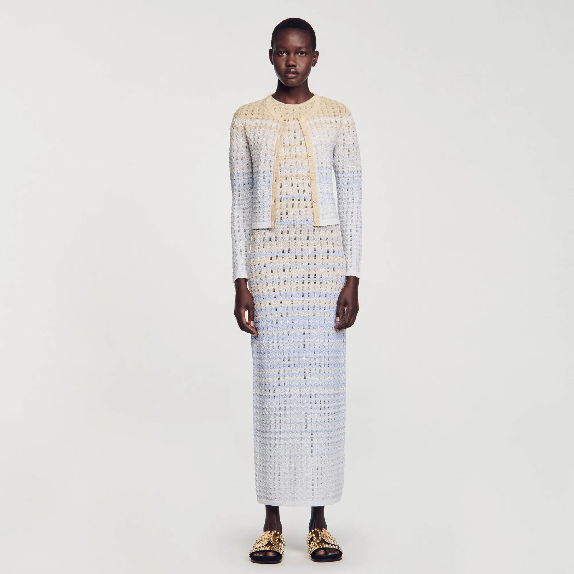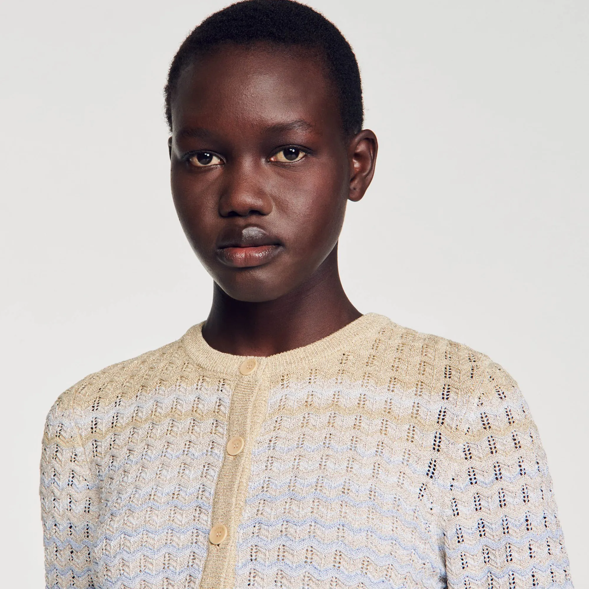 Cardigã Em Malha Pointelle Degradê Com Motivos Em Zigue-Zague, Manga Comprida, Gola Redonda E Fecho De Botão.