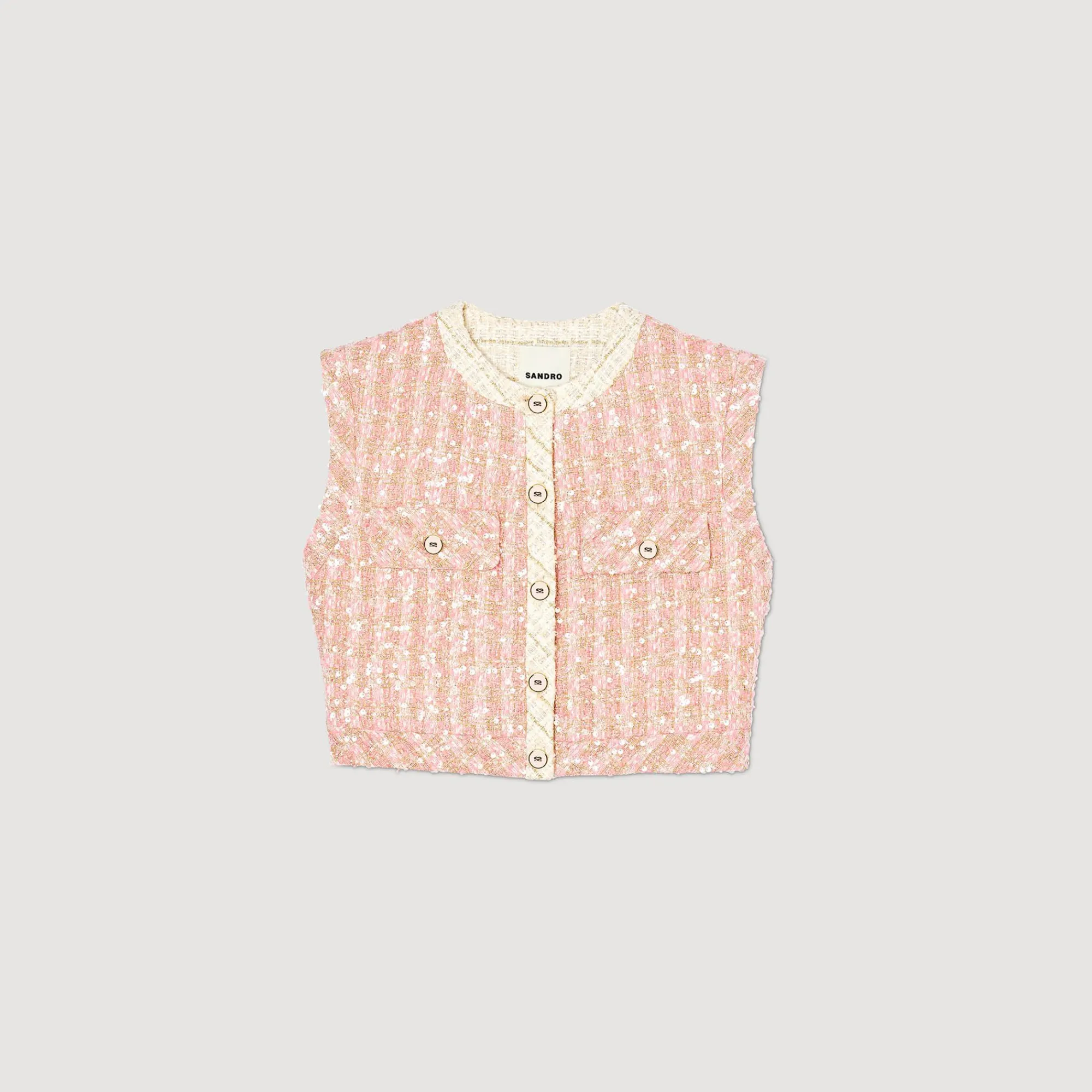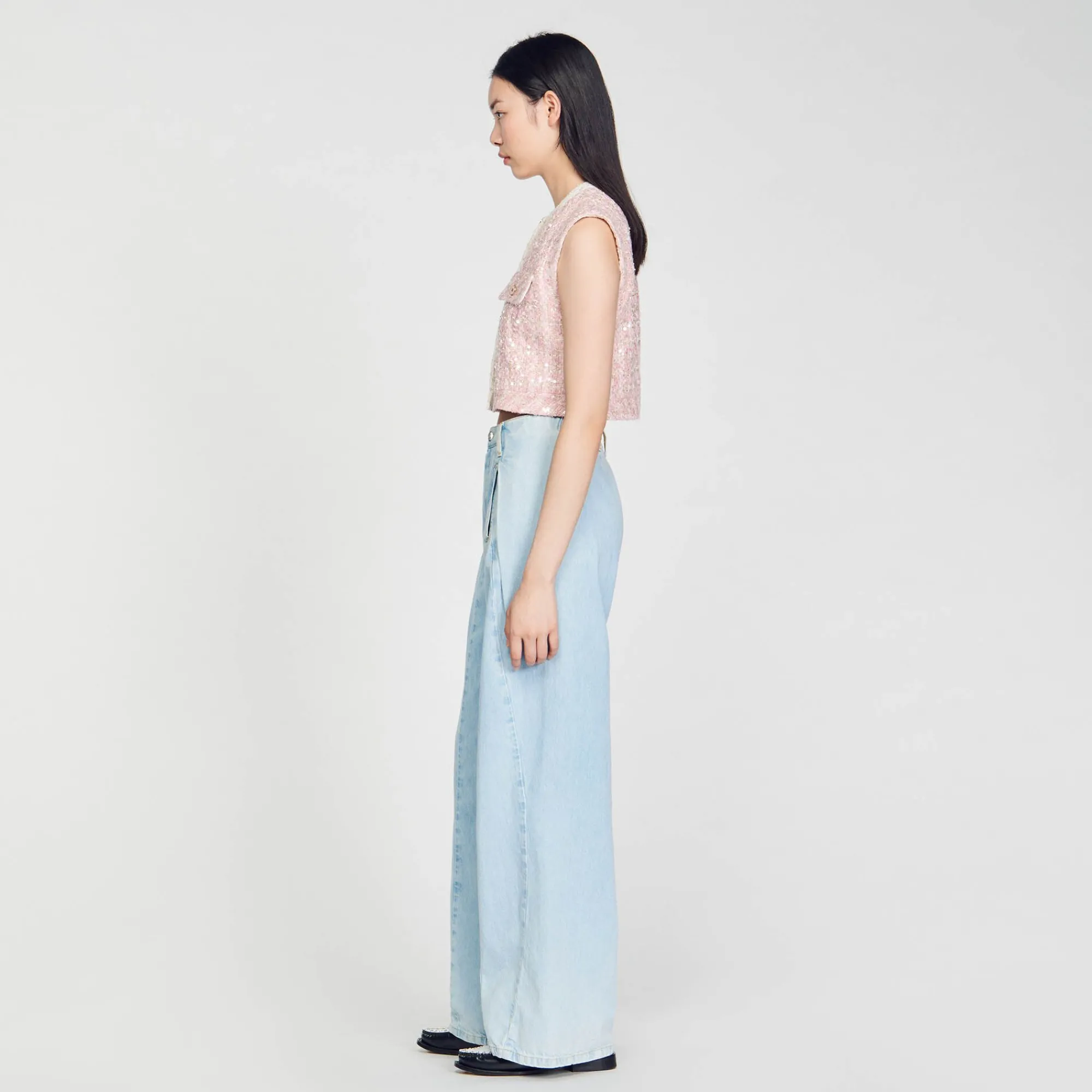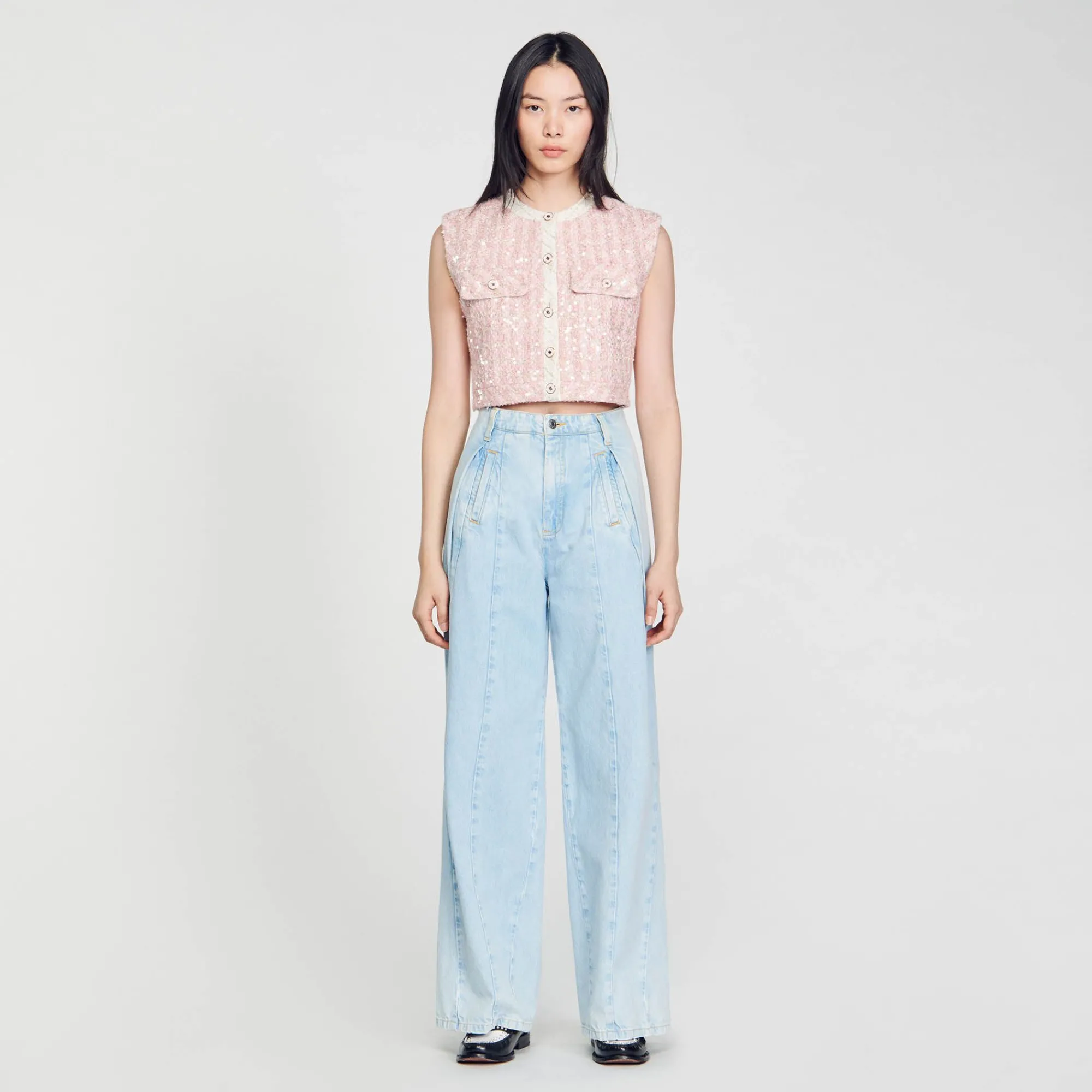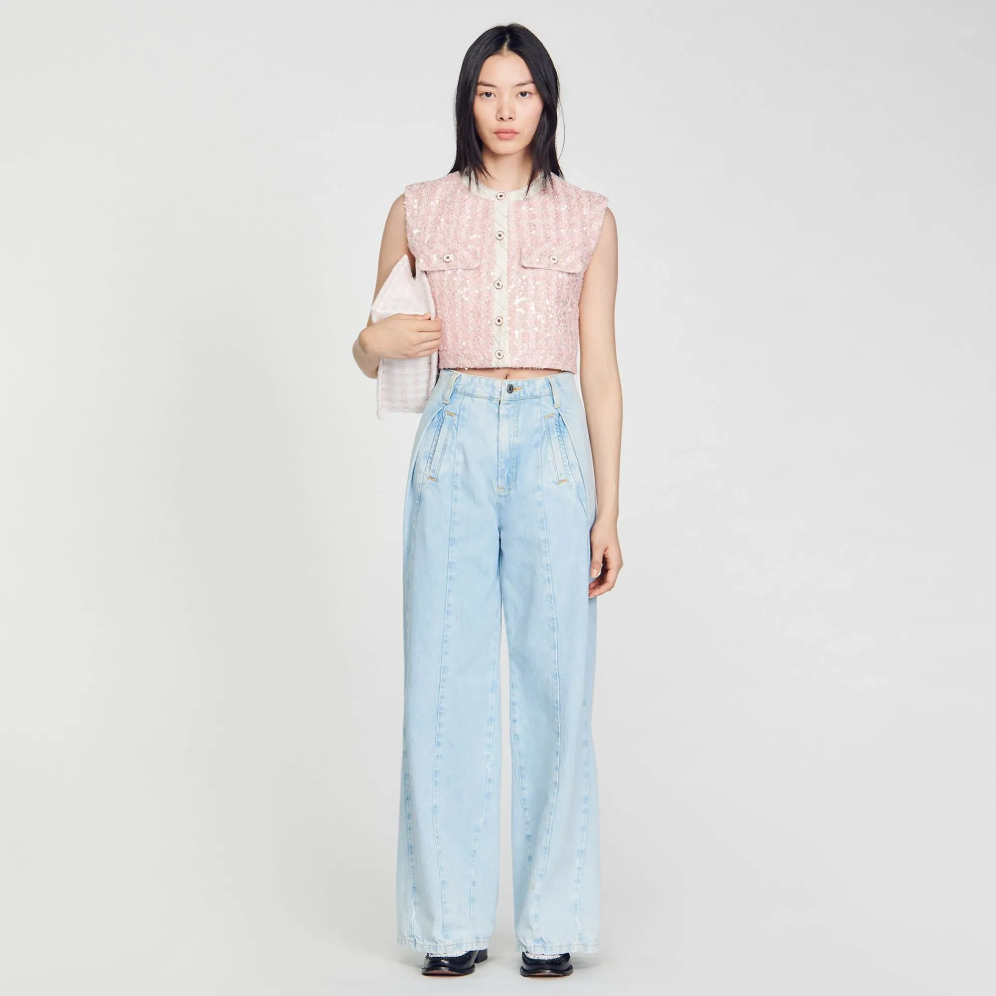 Colete De Sarja Bordado Com Lantejoulas, Gola Arredondada, Carcela De Botões Em Contraste E Bolsos No Peito Com Aba.