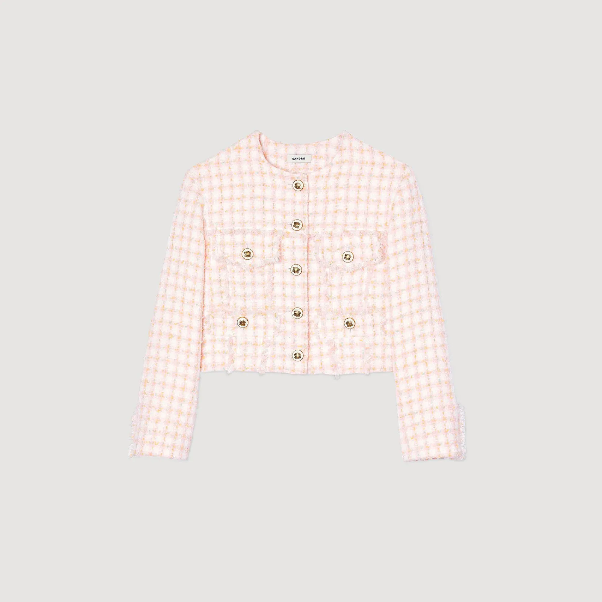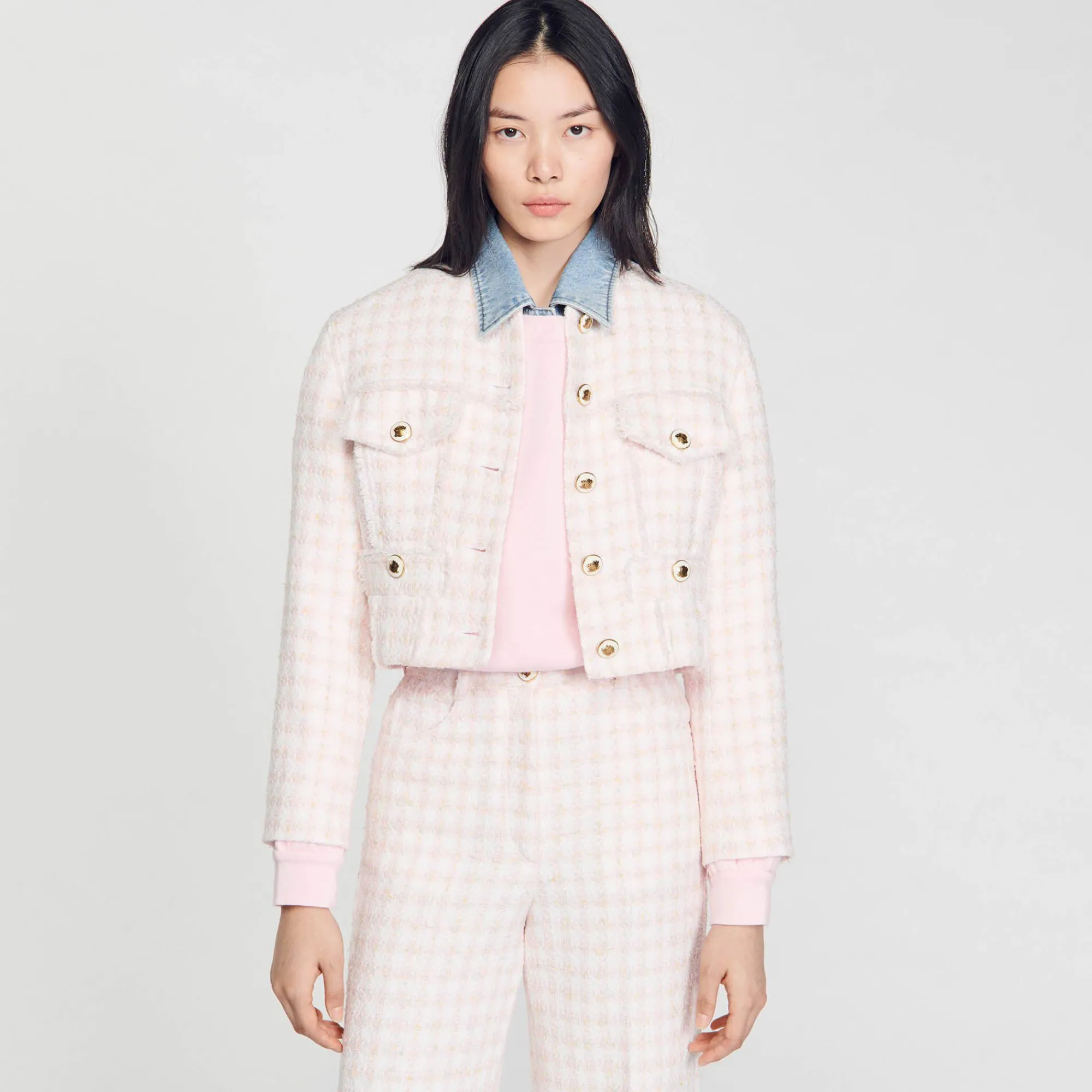 Jaqueta Curta De Sarja Elegante Com Mangas Compridas, Fecho De Botão Elegante E Detalhes Em Chevron Com Franjas.
