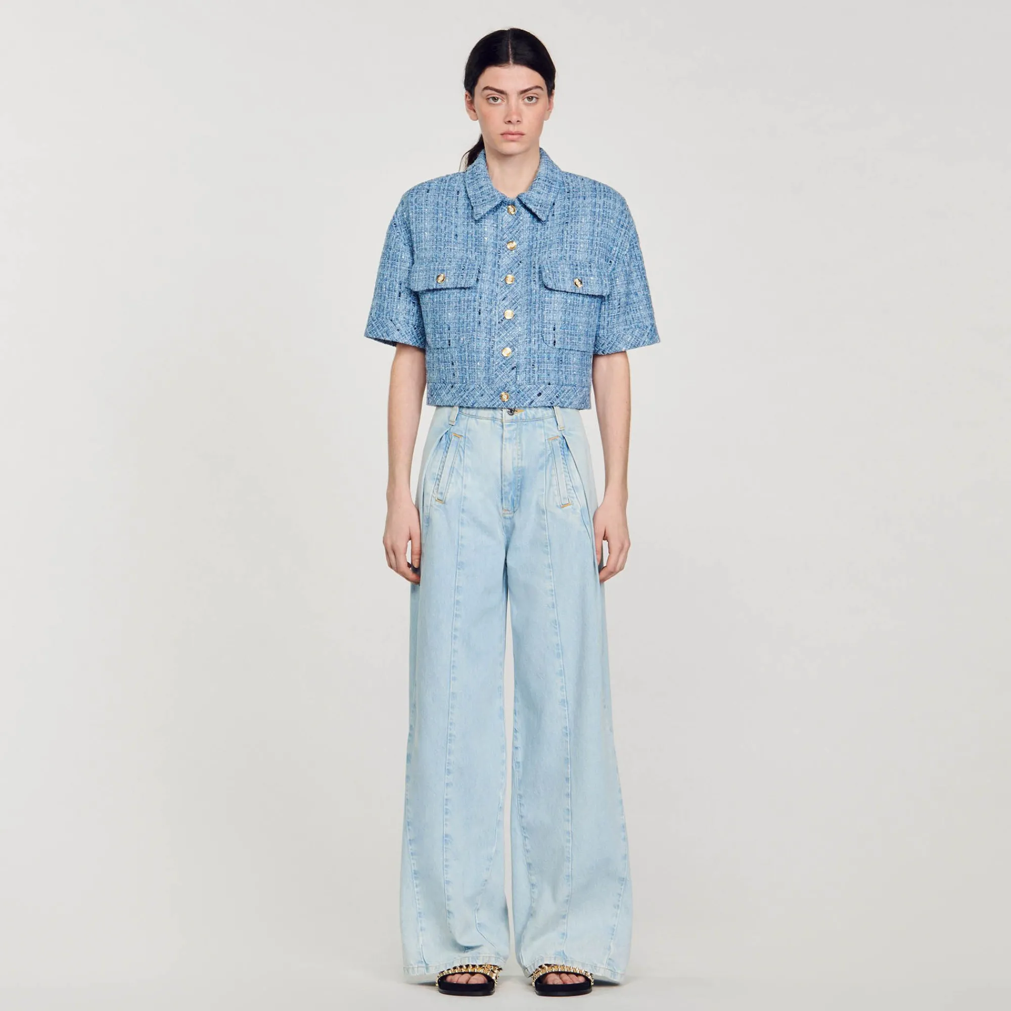 Jaqueta Curta De Tweed Fantasia Com Gola De Camisa, Mangas Curtas E Bolsos Com Aba No Peito.