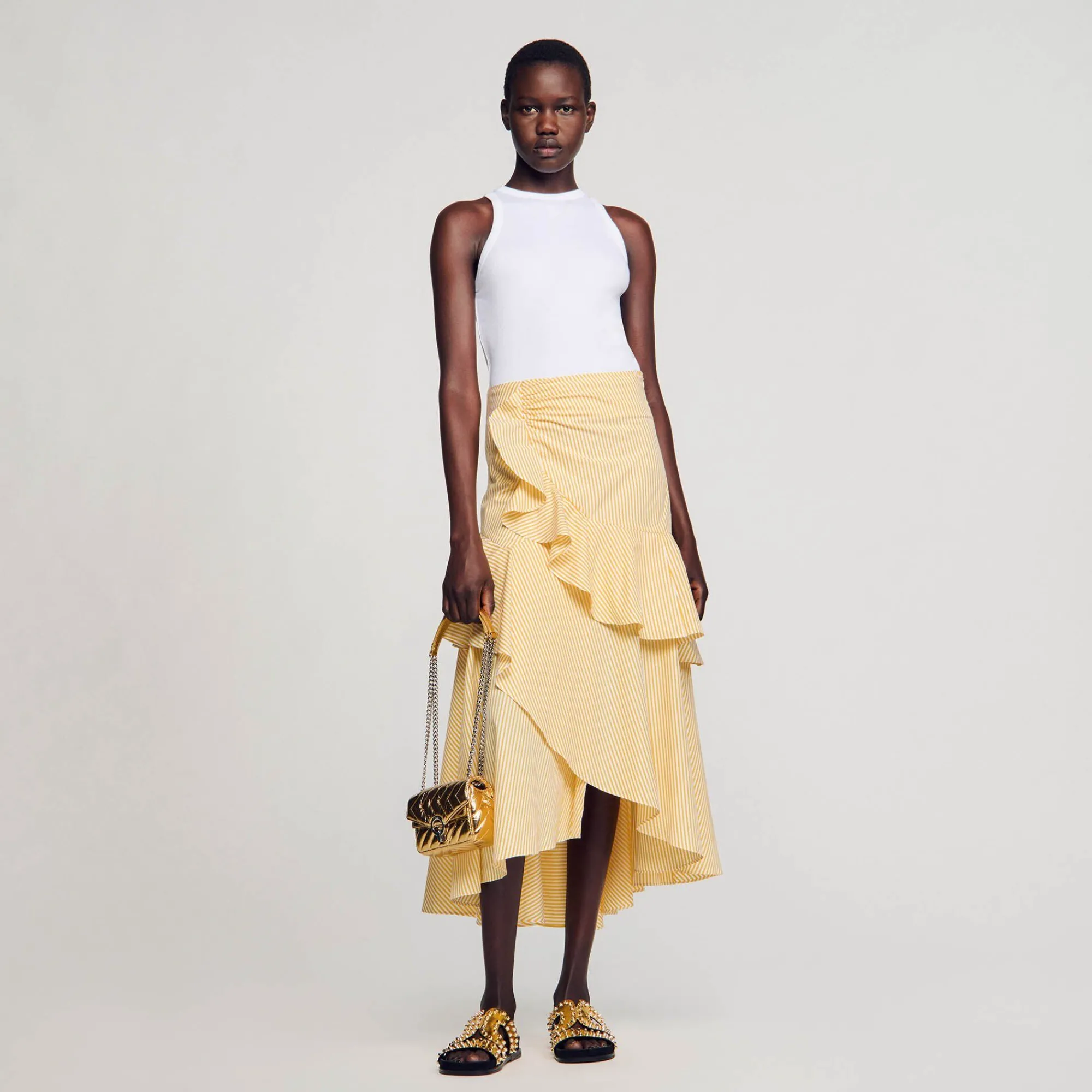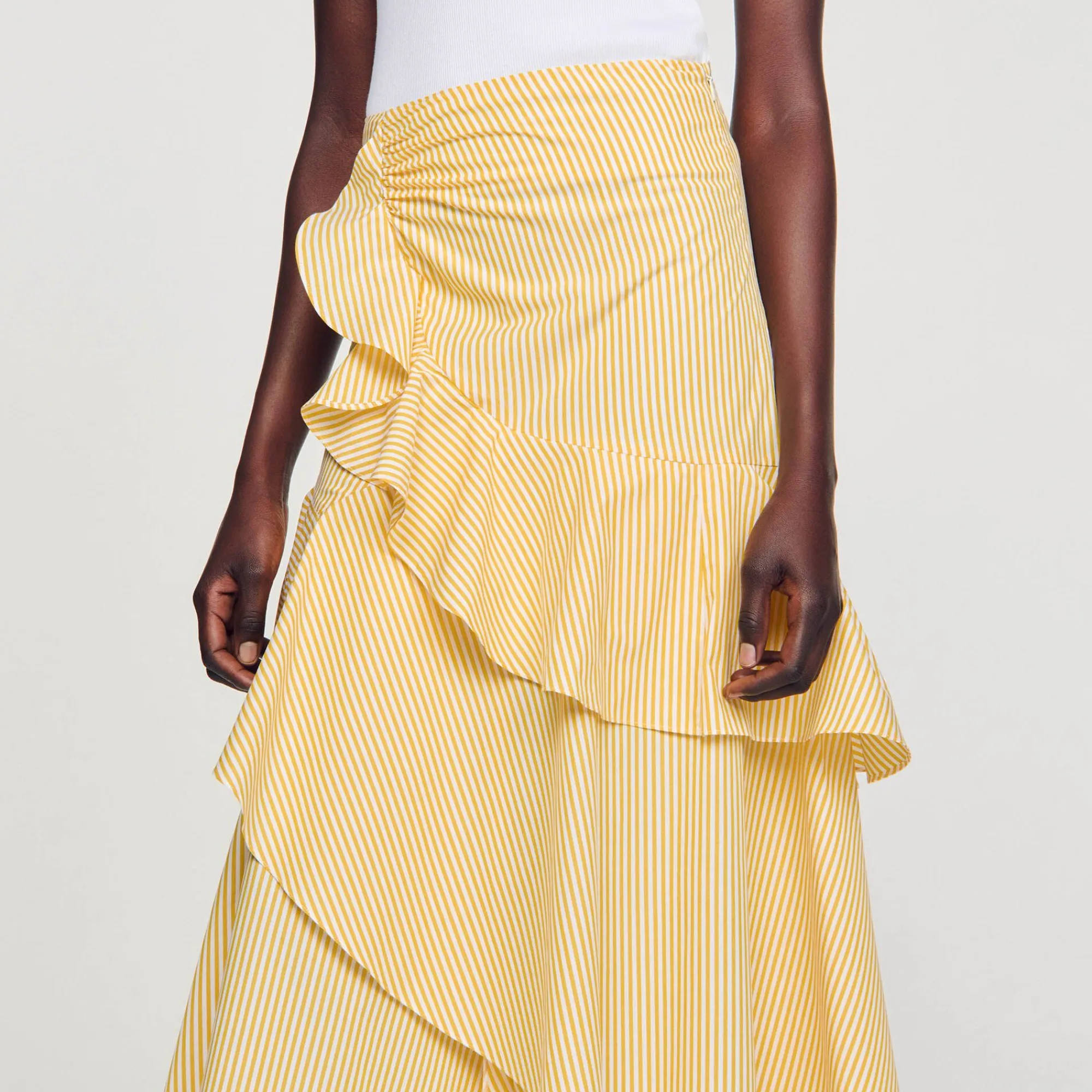 Saia Longa Listrada Decorada Com Babados Assimétricos E Franzida Na Cintura. Saia Longa Sandro Femme Estampa Listrada B…