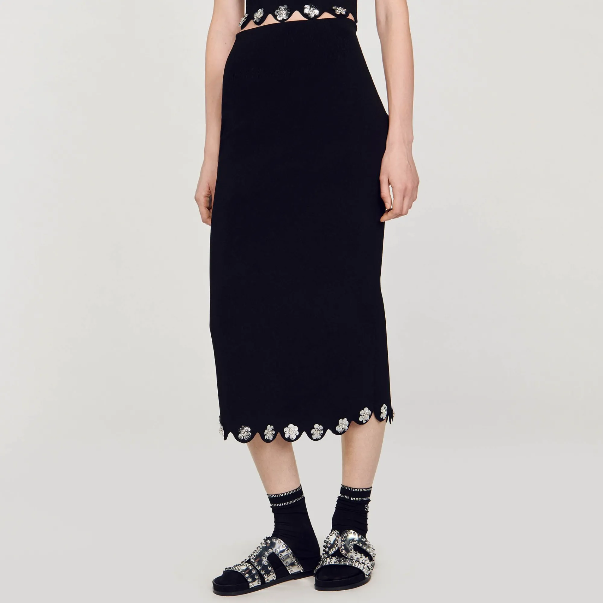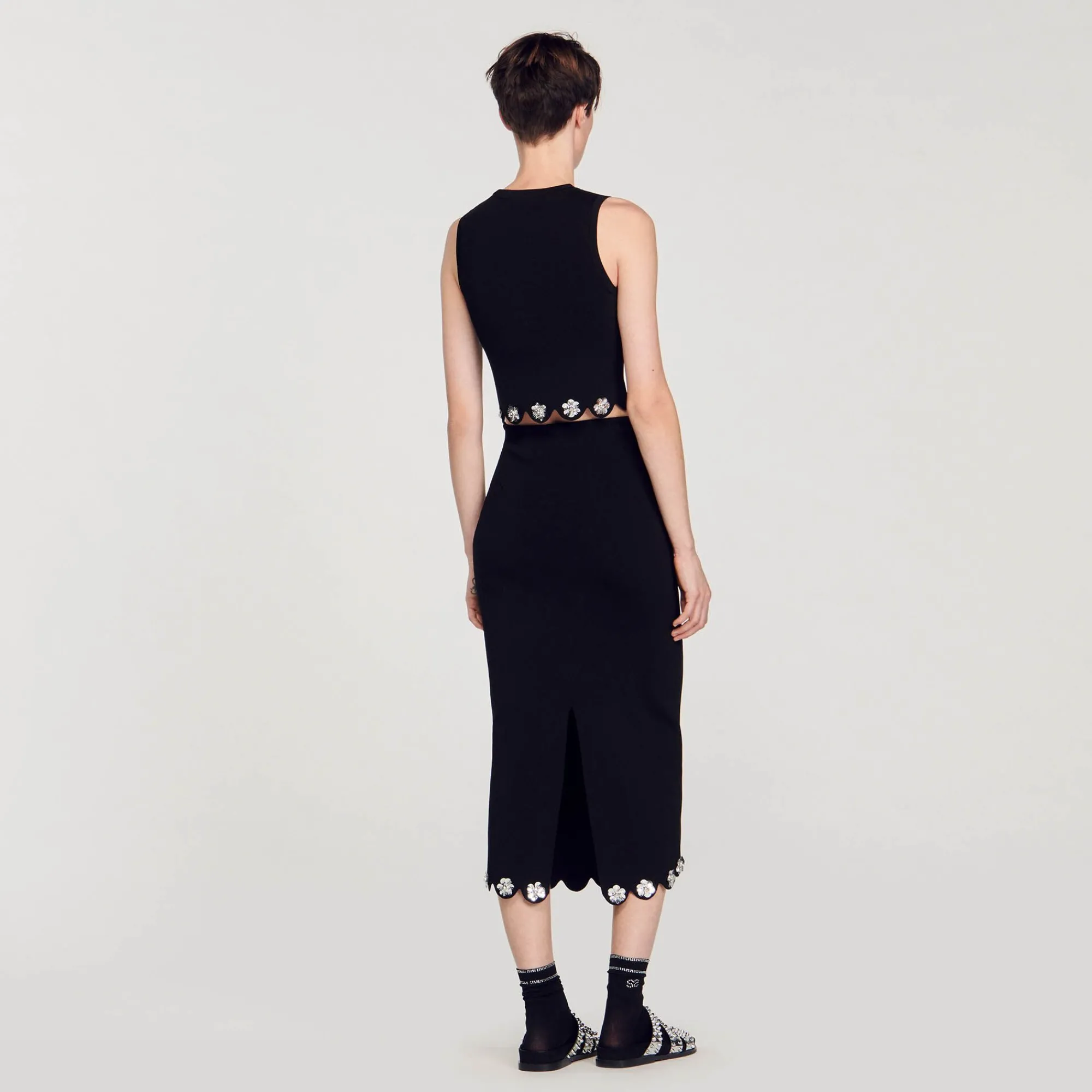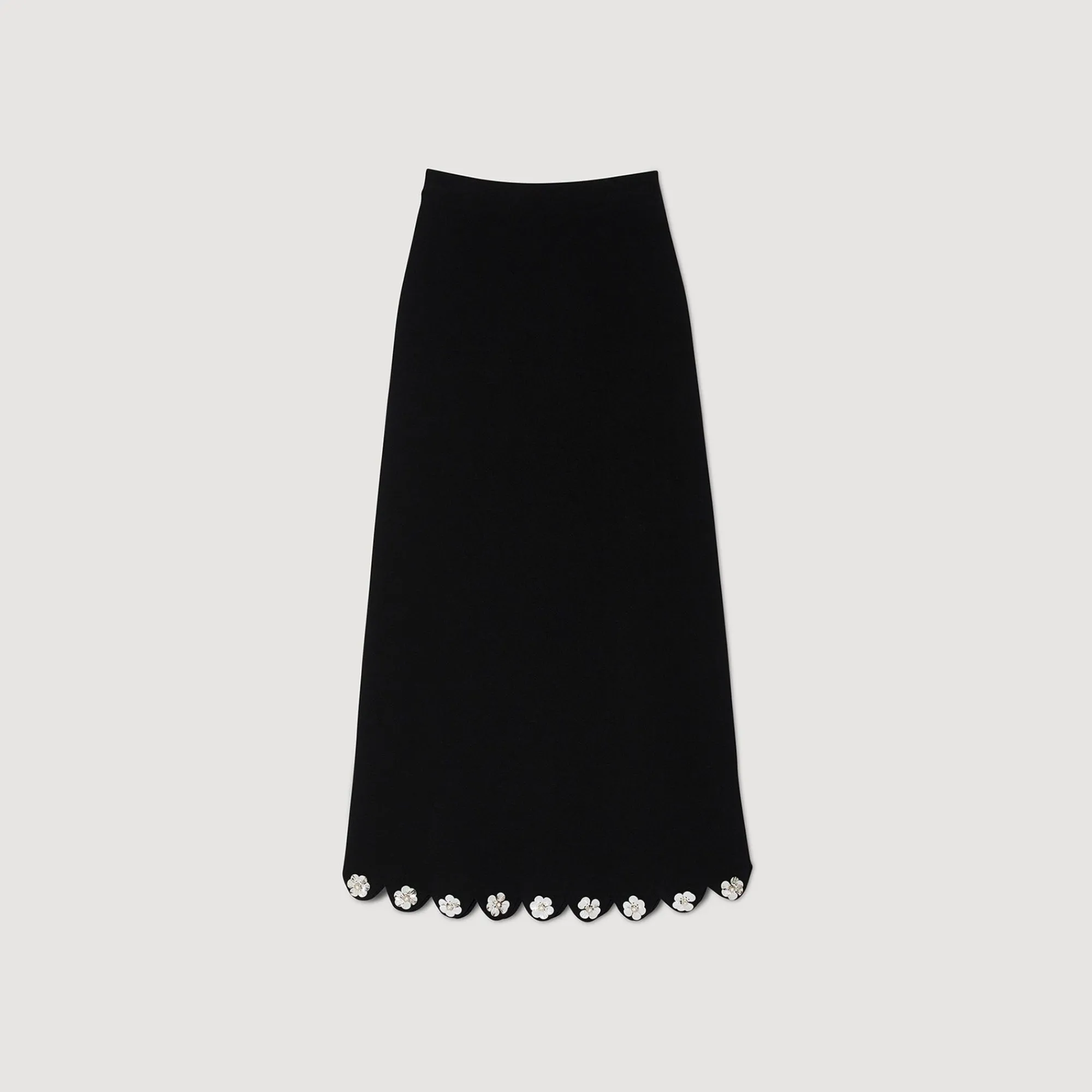 Saia Longa De Malha Com Cintura Alta E Detalhe De Borda Recortada Com Flores De Lantejoulas Na Barra.
