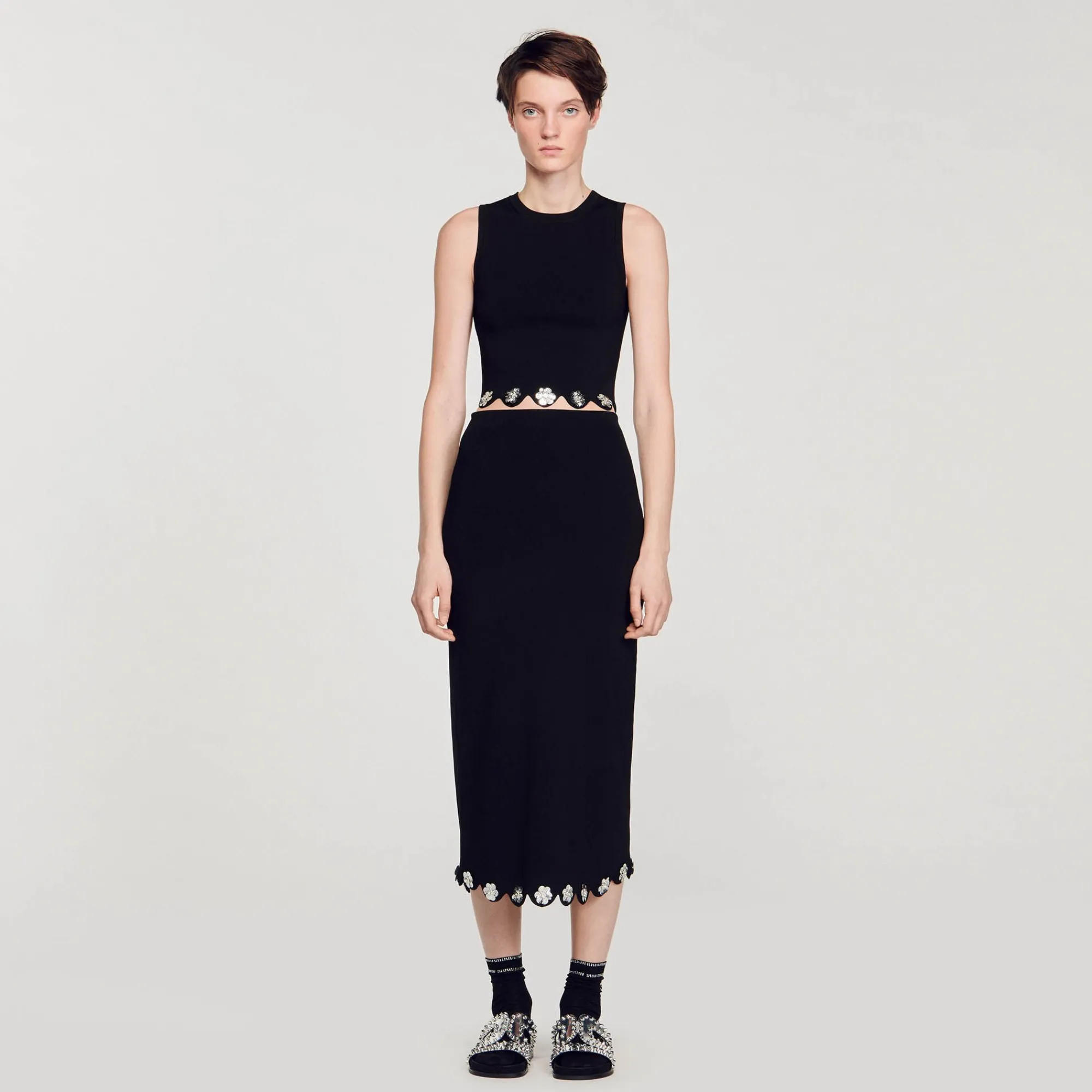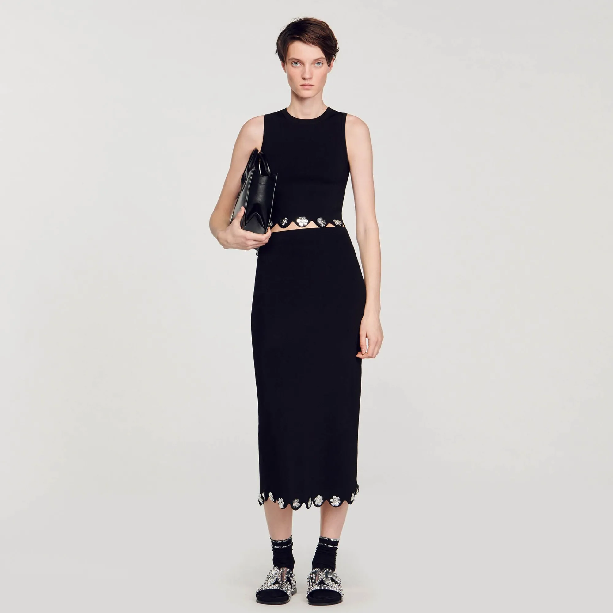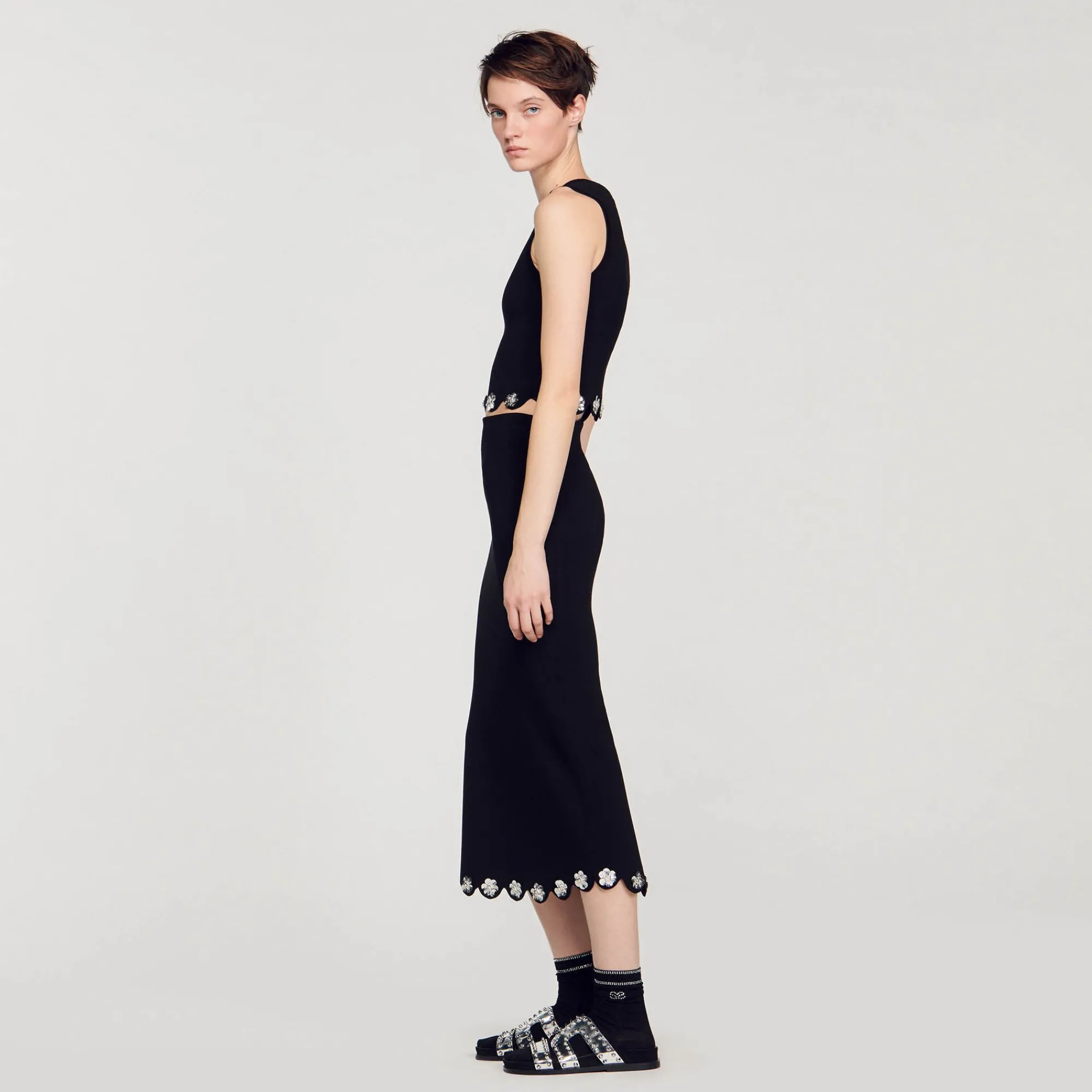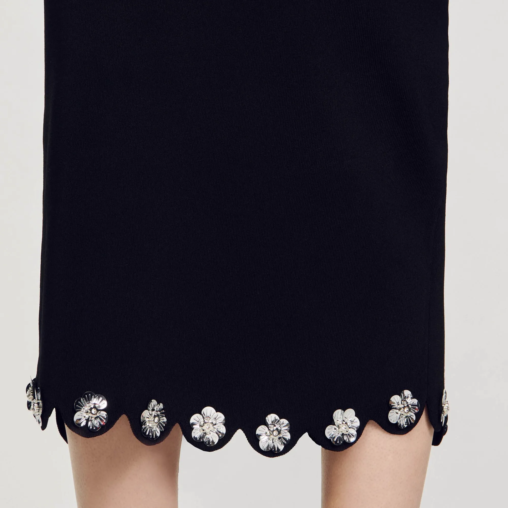 Saia Longa De Malha Com Cintura Alta E Detalhe De Borda Recortada Com Flores De Lantejoulas Na Barra.