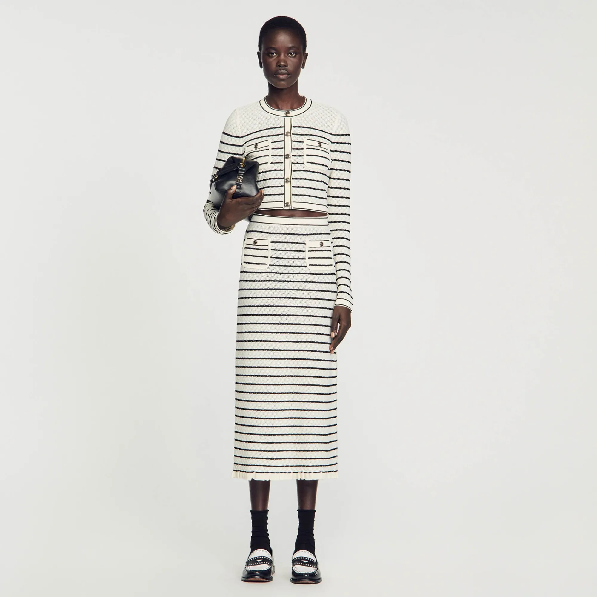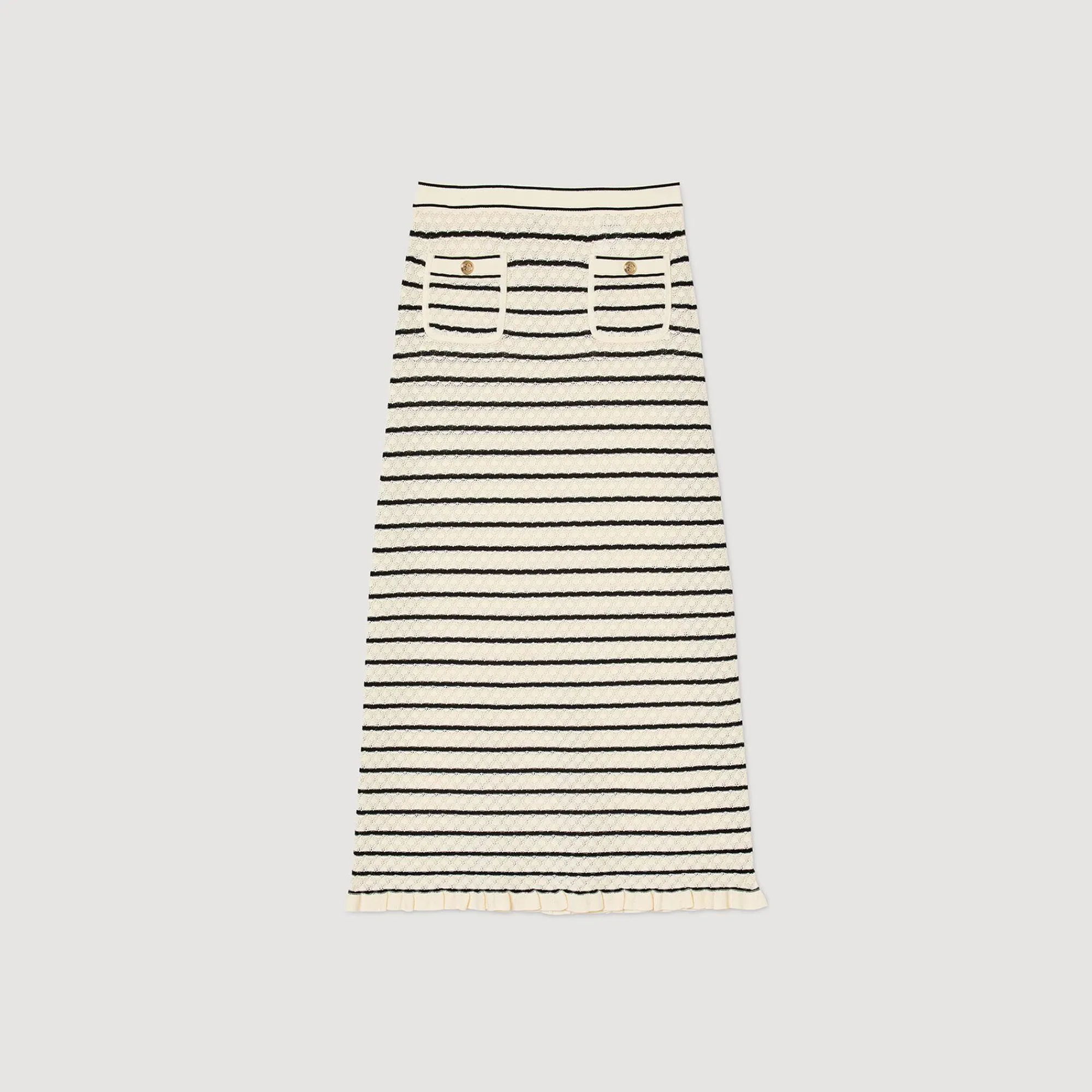 Saia Midi Listrada E Tricot Fantasia Adornada Com Babado Na Parte Inferior, Com Bolsos Na Cintura.