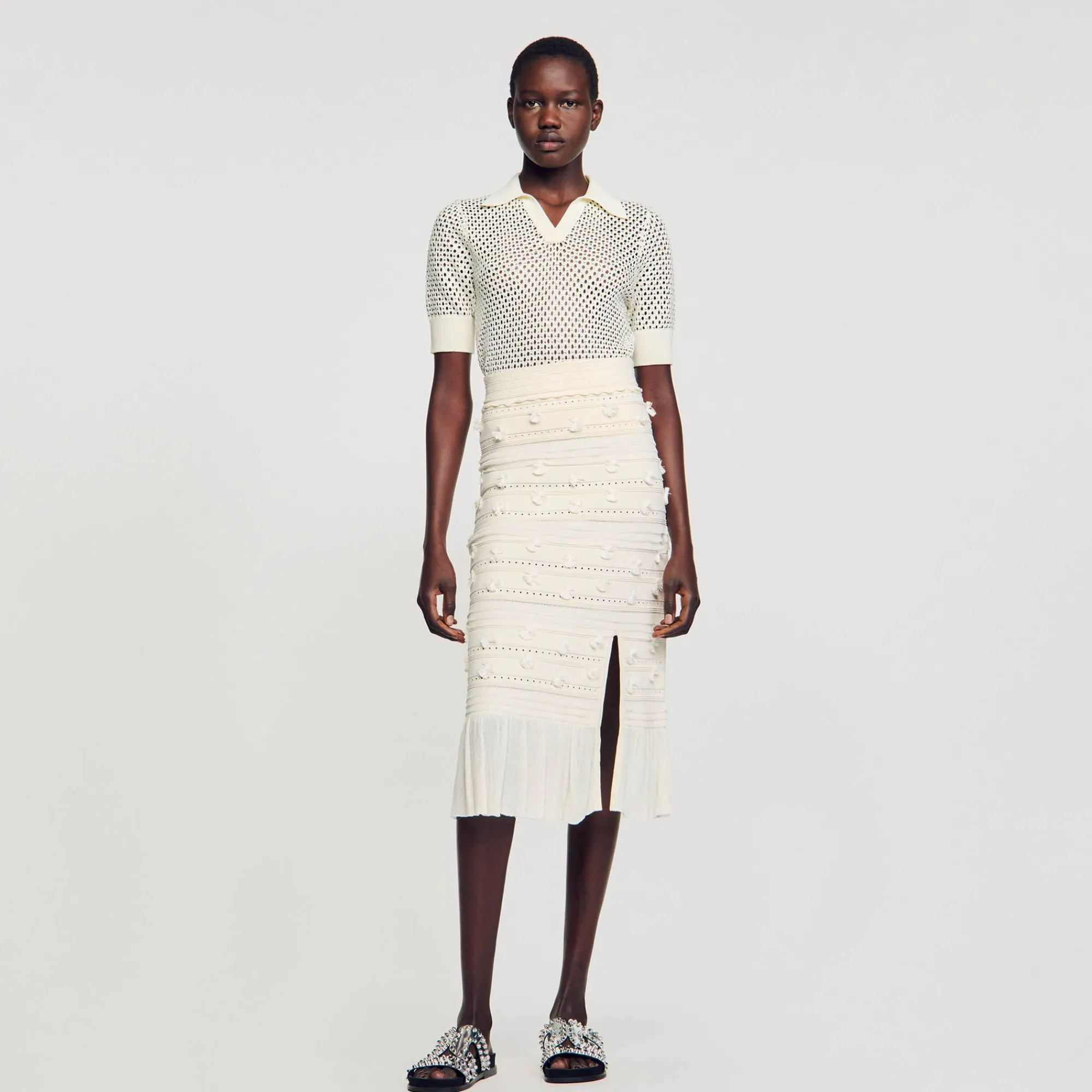 Saia Midi Justa De Corte Reto E Malha Vazada Decorada Com Pequenos Babados E Pompons, Com Elástico Na Cintura E Fenda Na Frente
