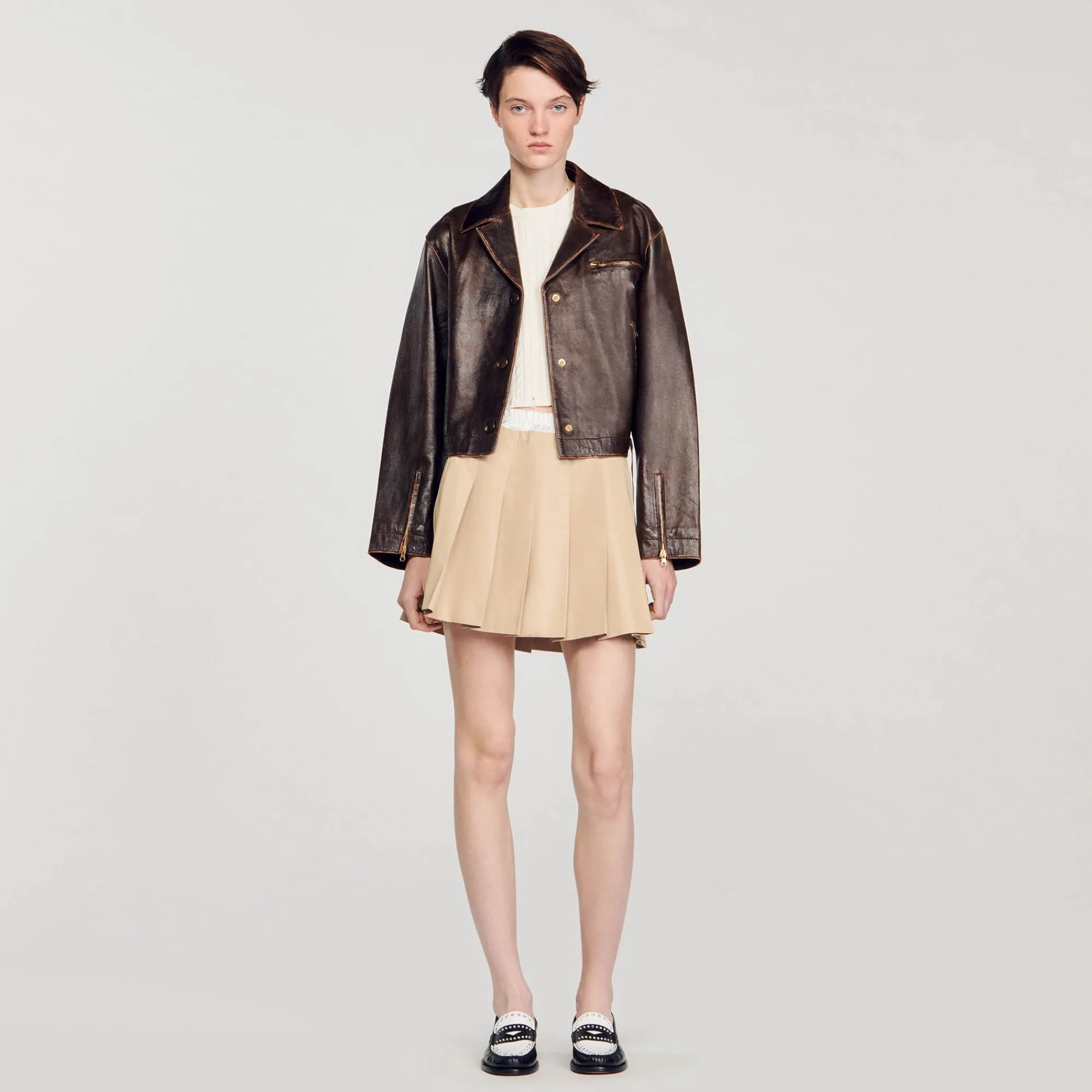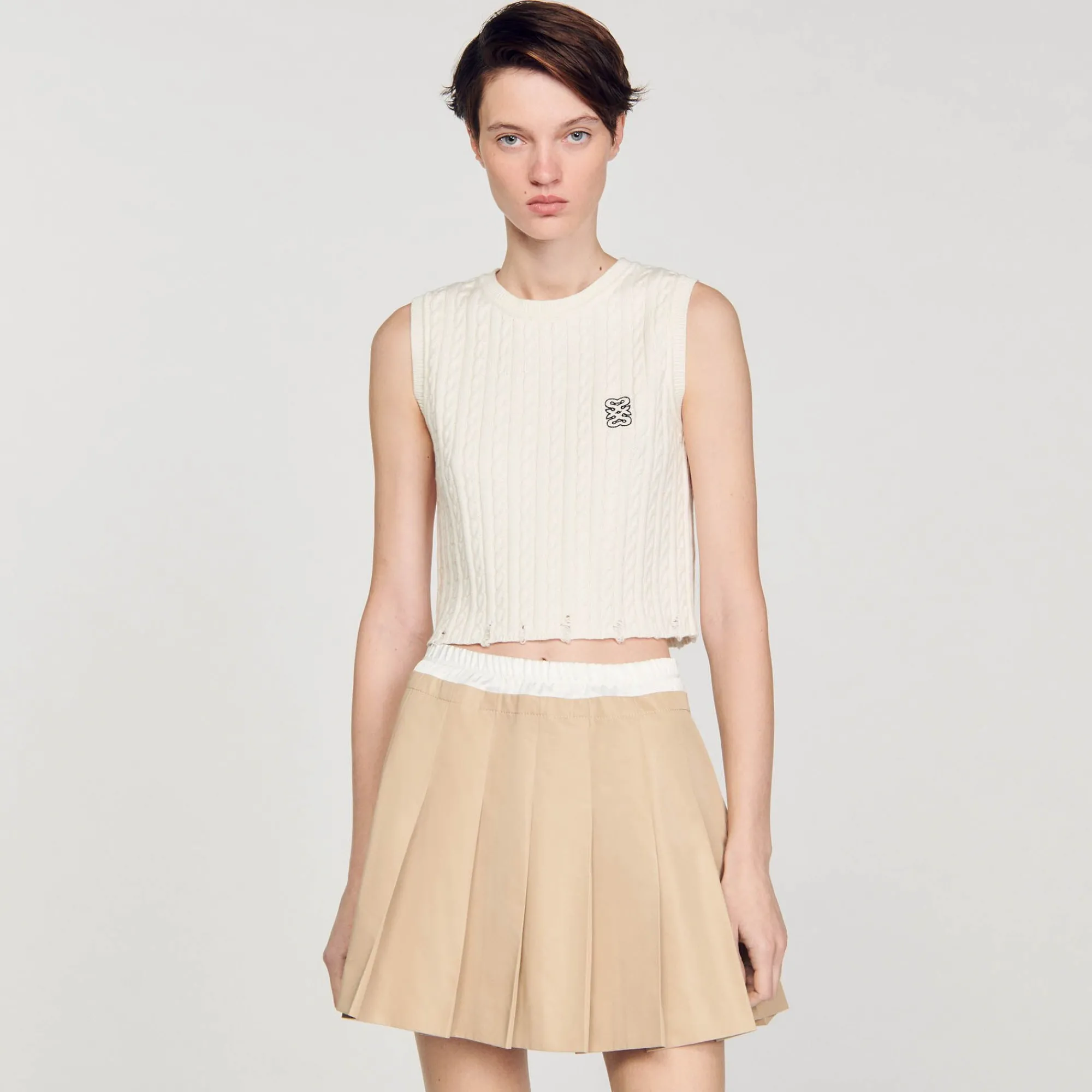 Saia Curta Plissada Com Calça Estilo Cós Elástico Contrastante. Saia Curta Sandro Femme Mesas Cintura Elástica Contr…