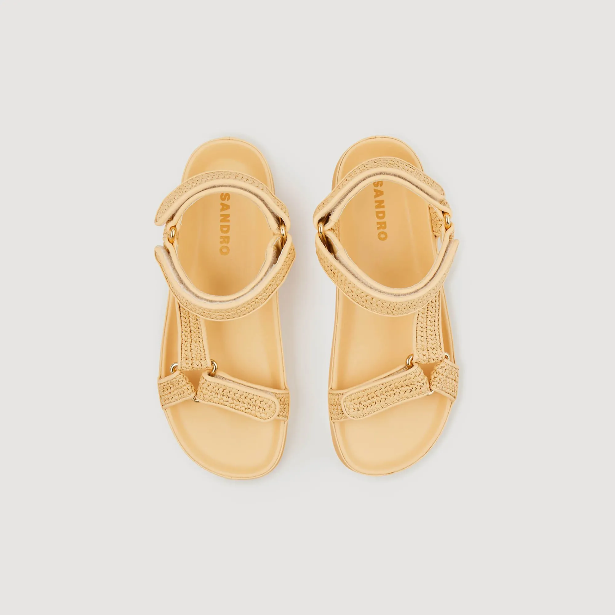 Sandálias De Ráfia Trançada Com Tiras De Velcro E Sola Plana. Sandro Sandálias Femininas De Ráfia Tiras De Velcro R…