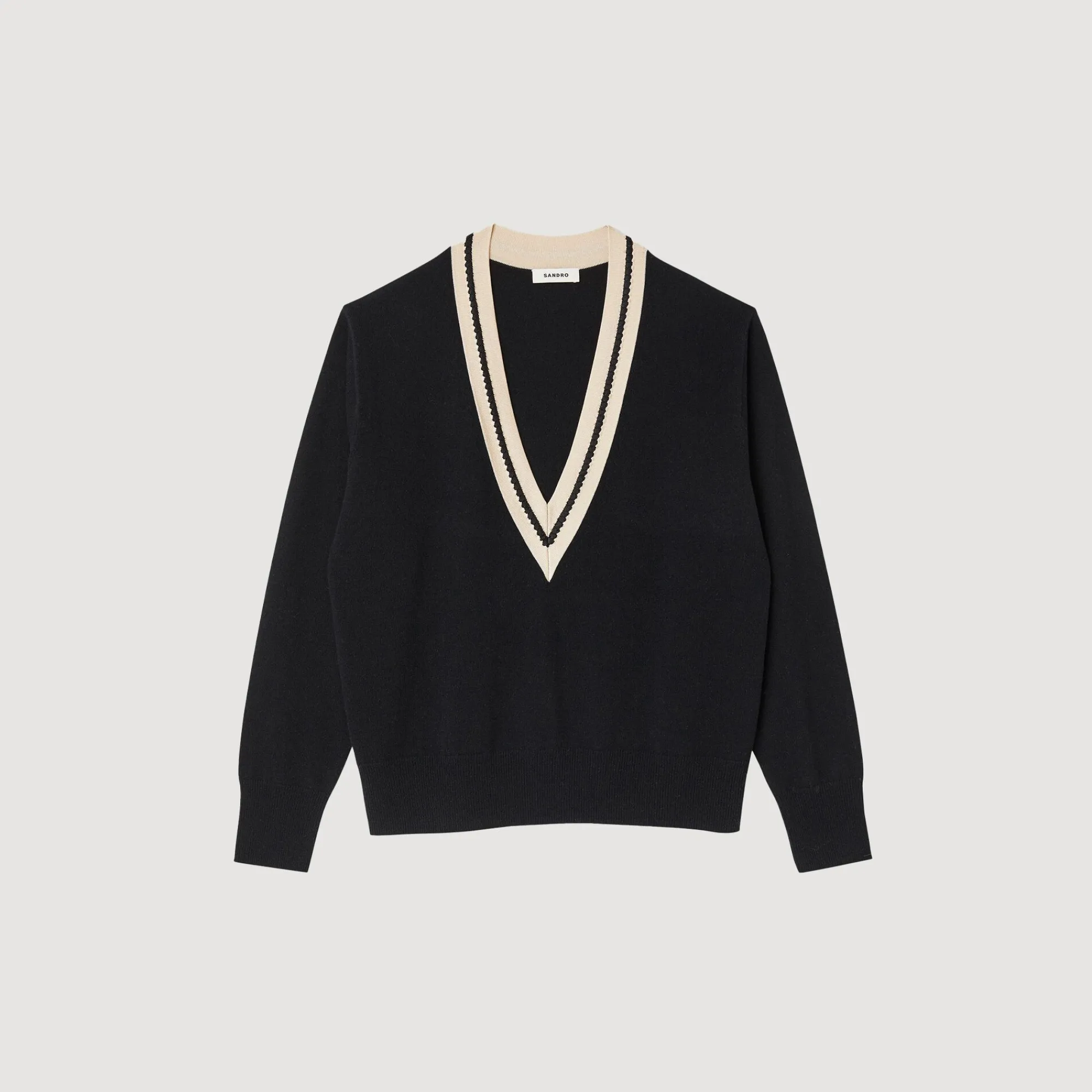 Camisola De Malha Com Mangas Compridas E Decote Em V Grande Em Contraste.• Camisola De Malha Sandro Para Mulher • De…