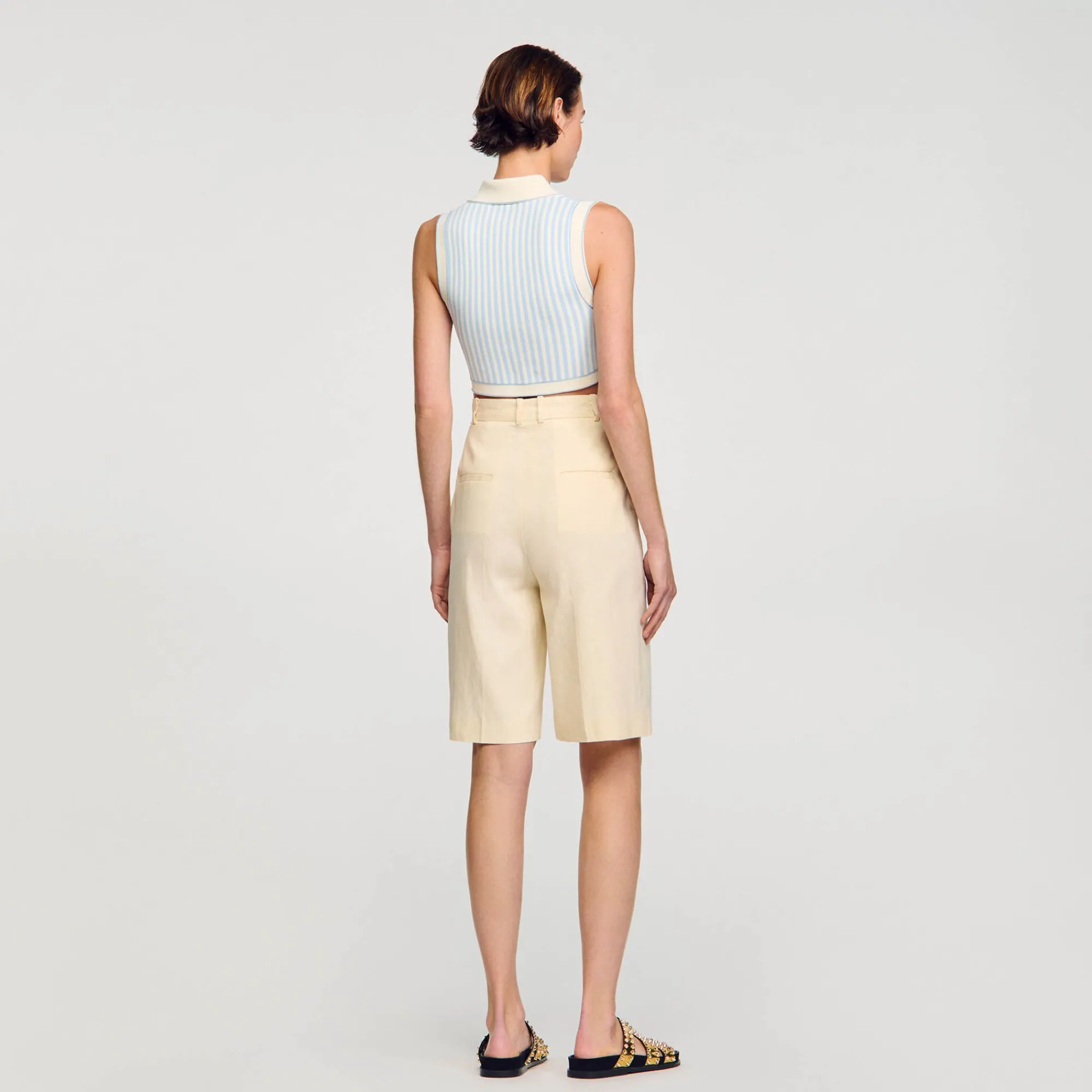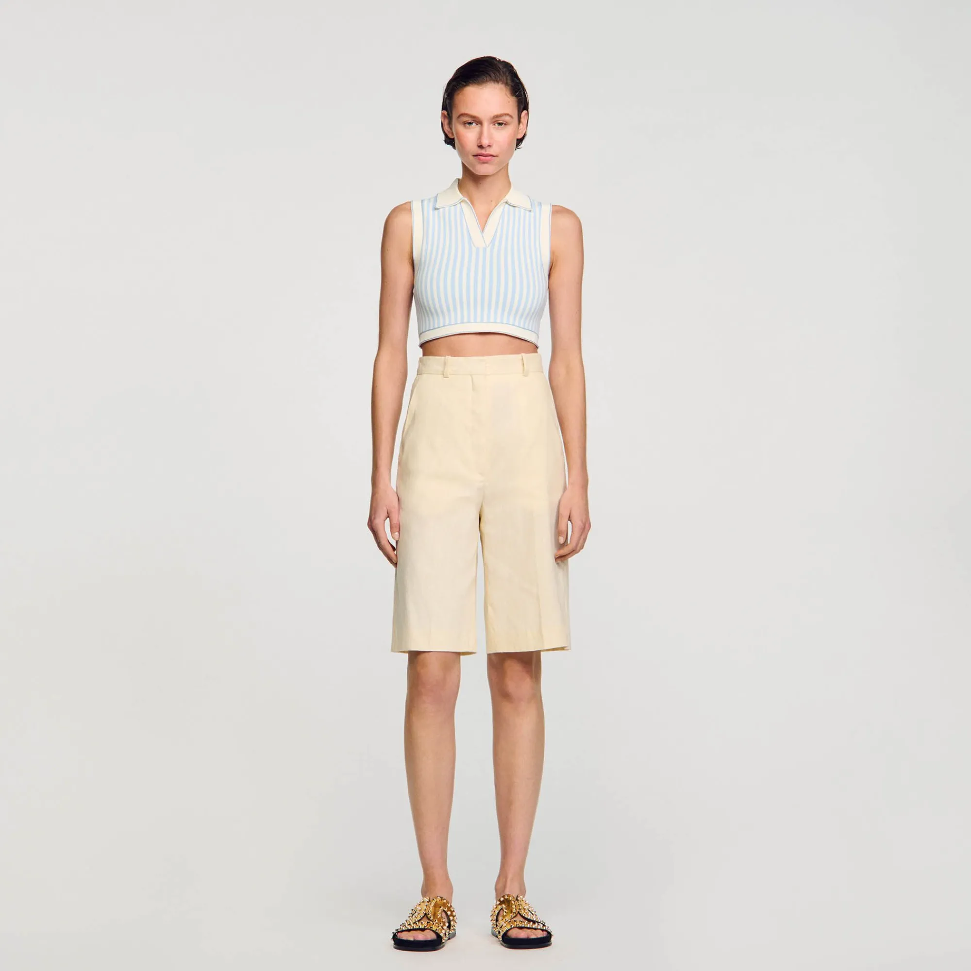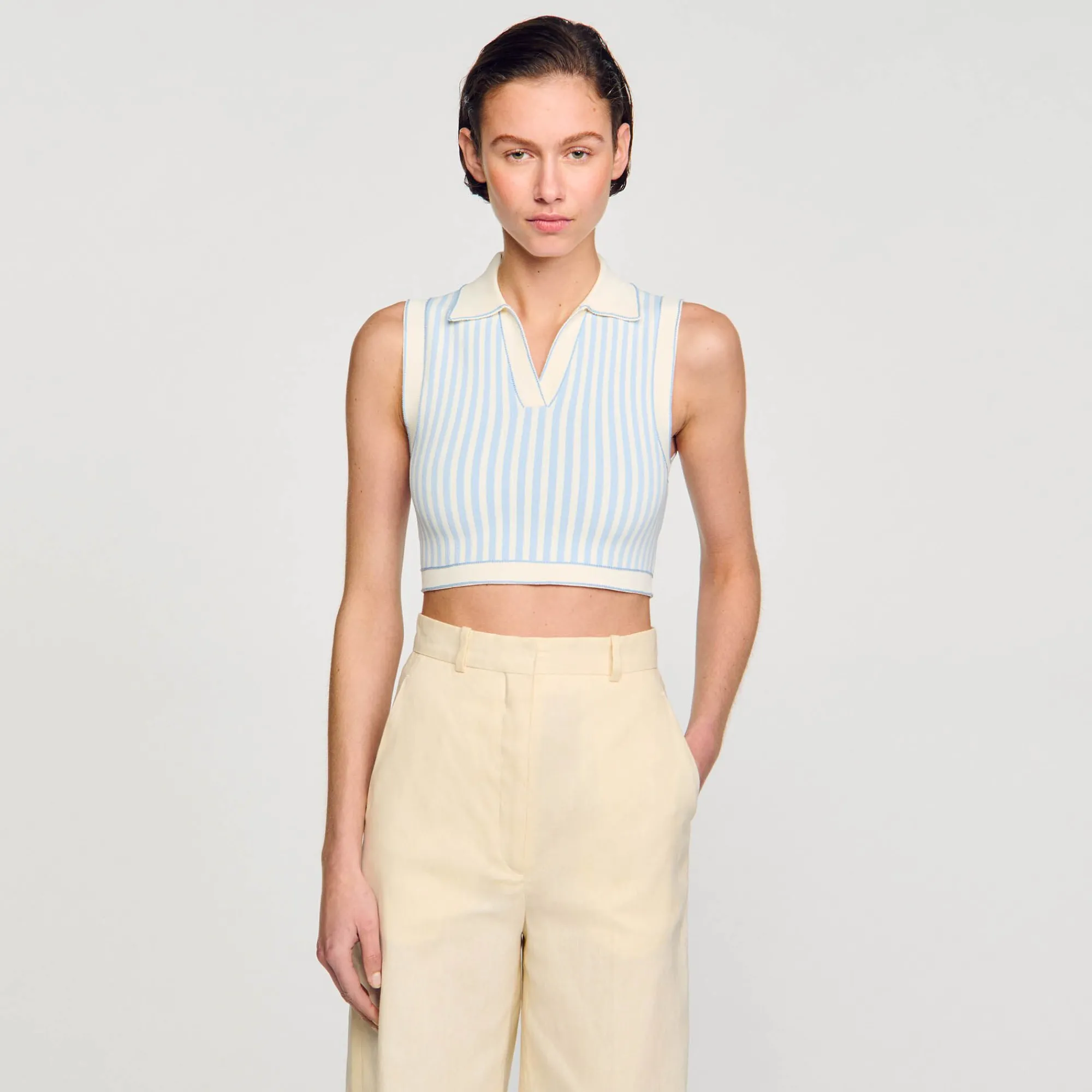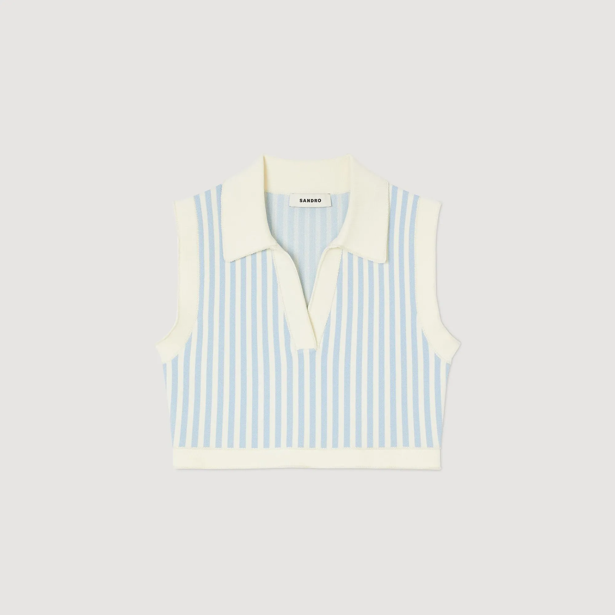 Camisola Curta Às Riscas, Sem Mangas, Com Gola Pólo Aberta E Orlas Em Contraste. Suéter Curto Feminino De Malha Sandr…