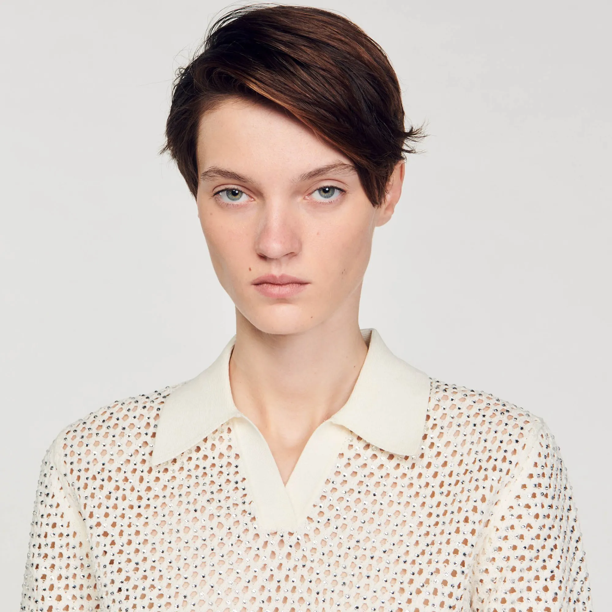 Camisola Curta Em Malha De Malha Com Detalhe De Strass, Gola Pólo, Mangas Curtas E Bainha Canelada. Suéter Pólo Femin…