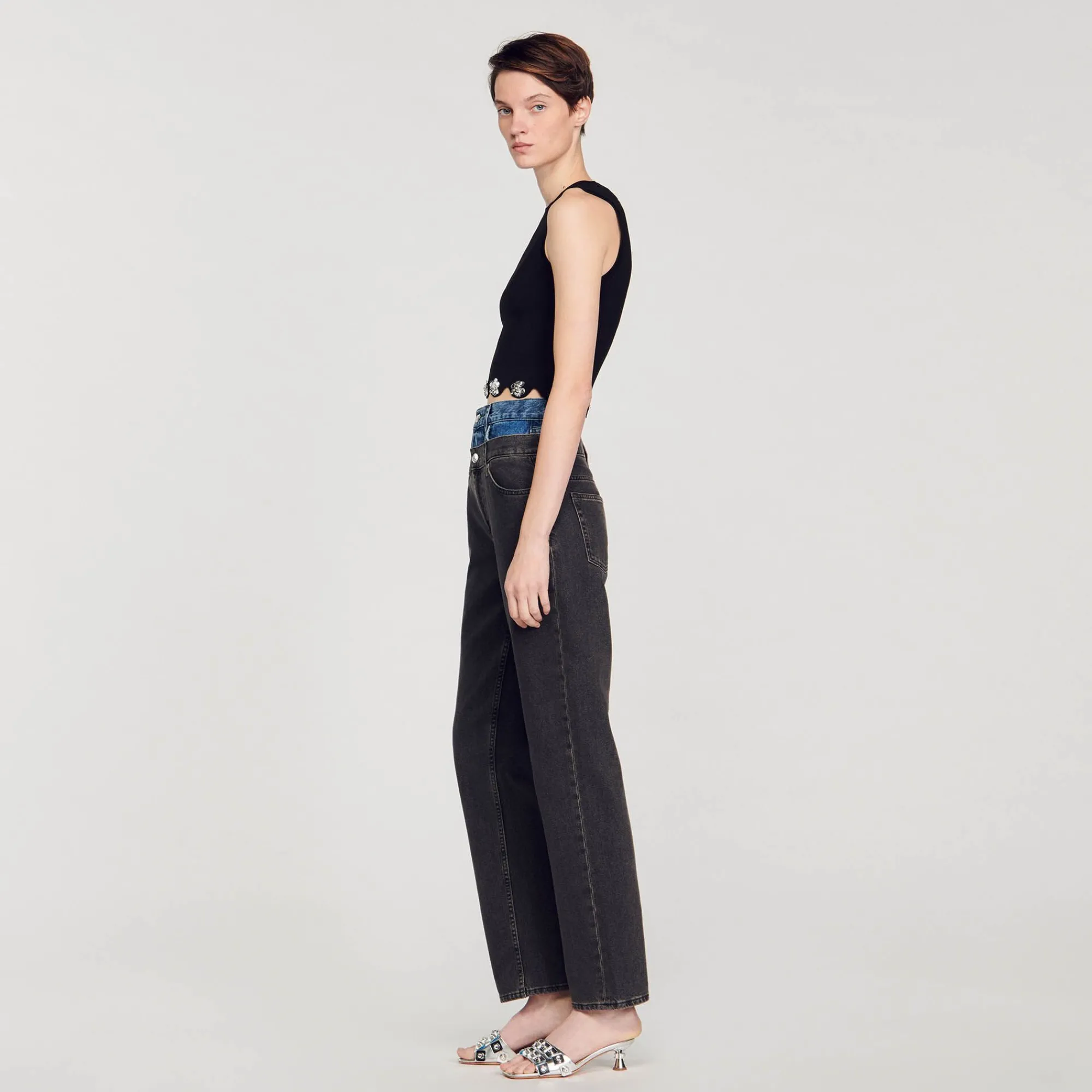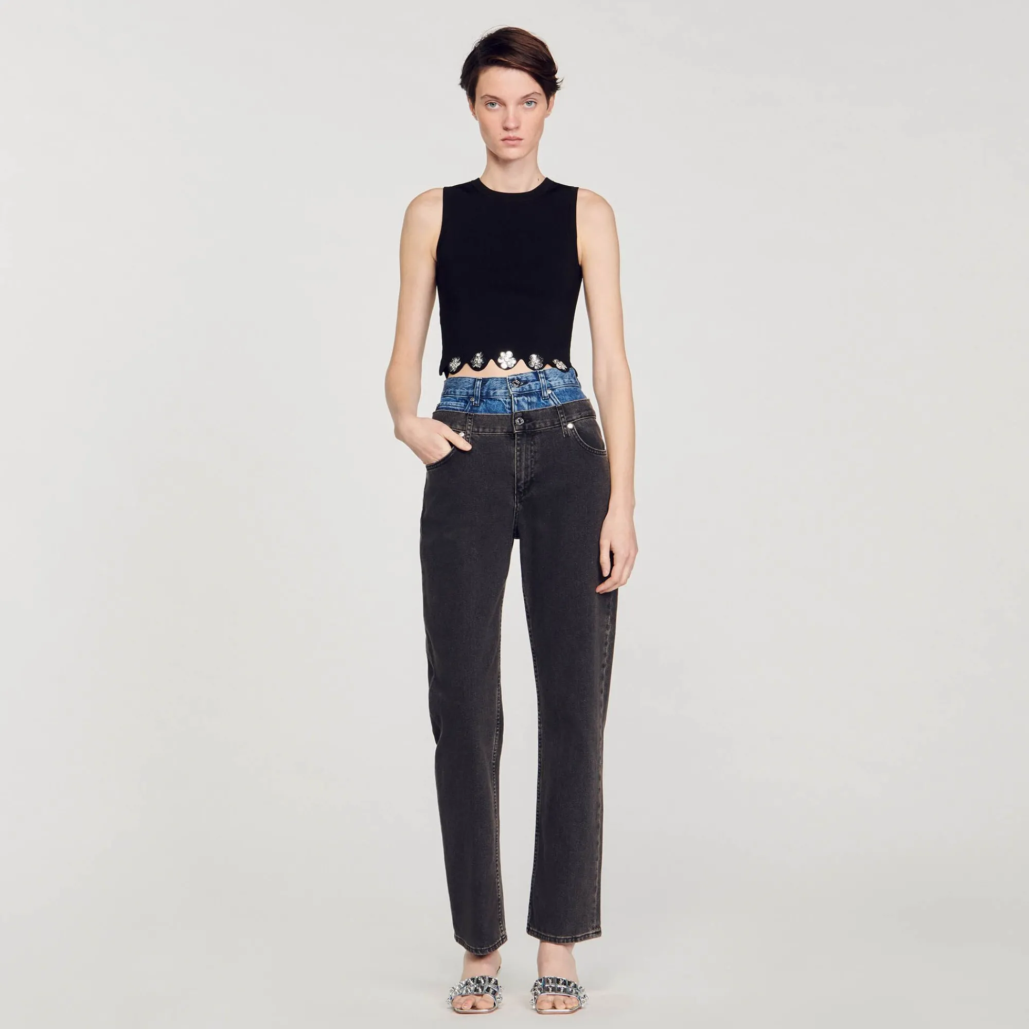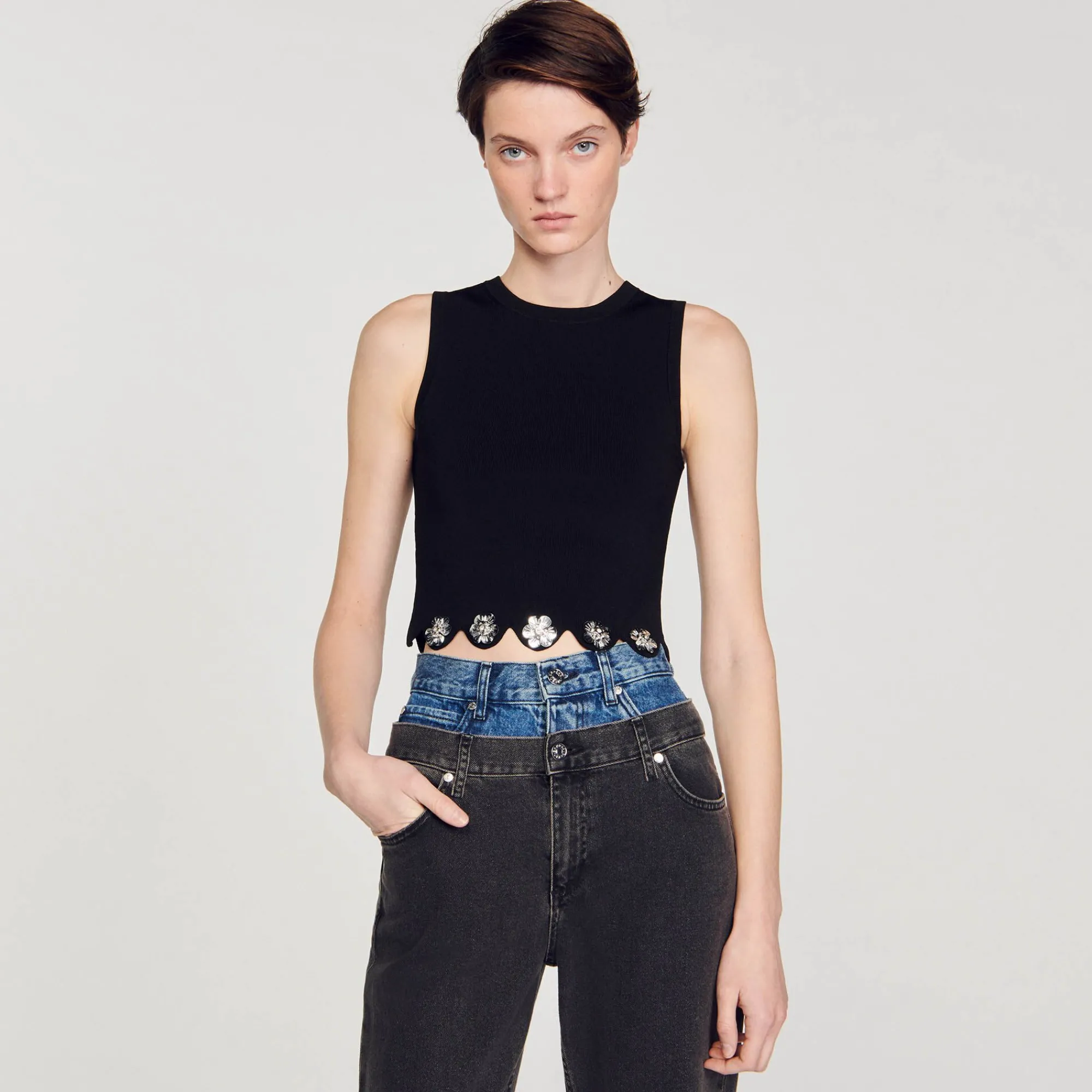 Top Curto De Malha Sem Mangas Com Decote Redondo E Bainha Recortada Decorada Com Flores De Lantejoulas.