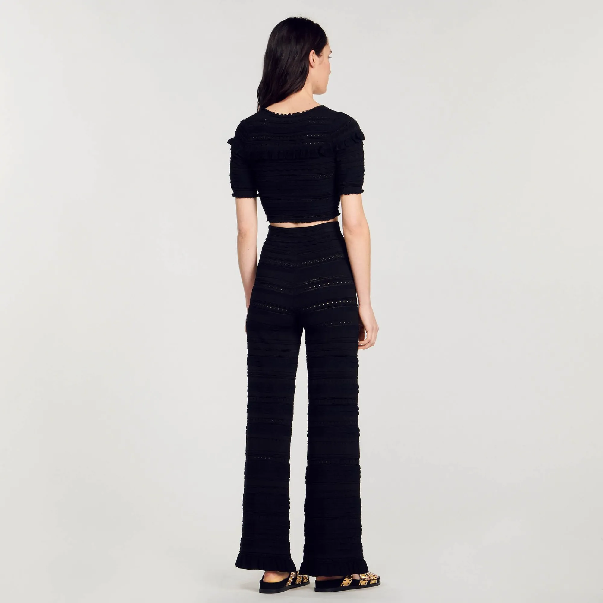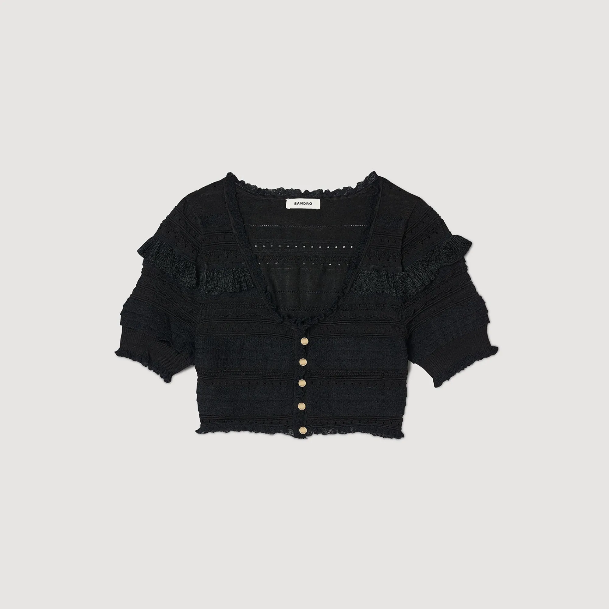 Top Elegante De Malha Estilo Cardigan Decorado Com Babados, Com Mangas Curtas, Decote Baixo E Fecho De Pequeno Botão Dourado.