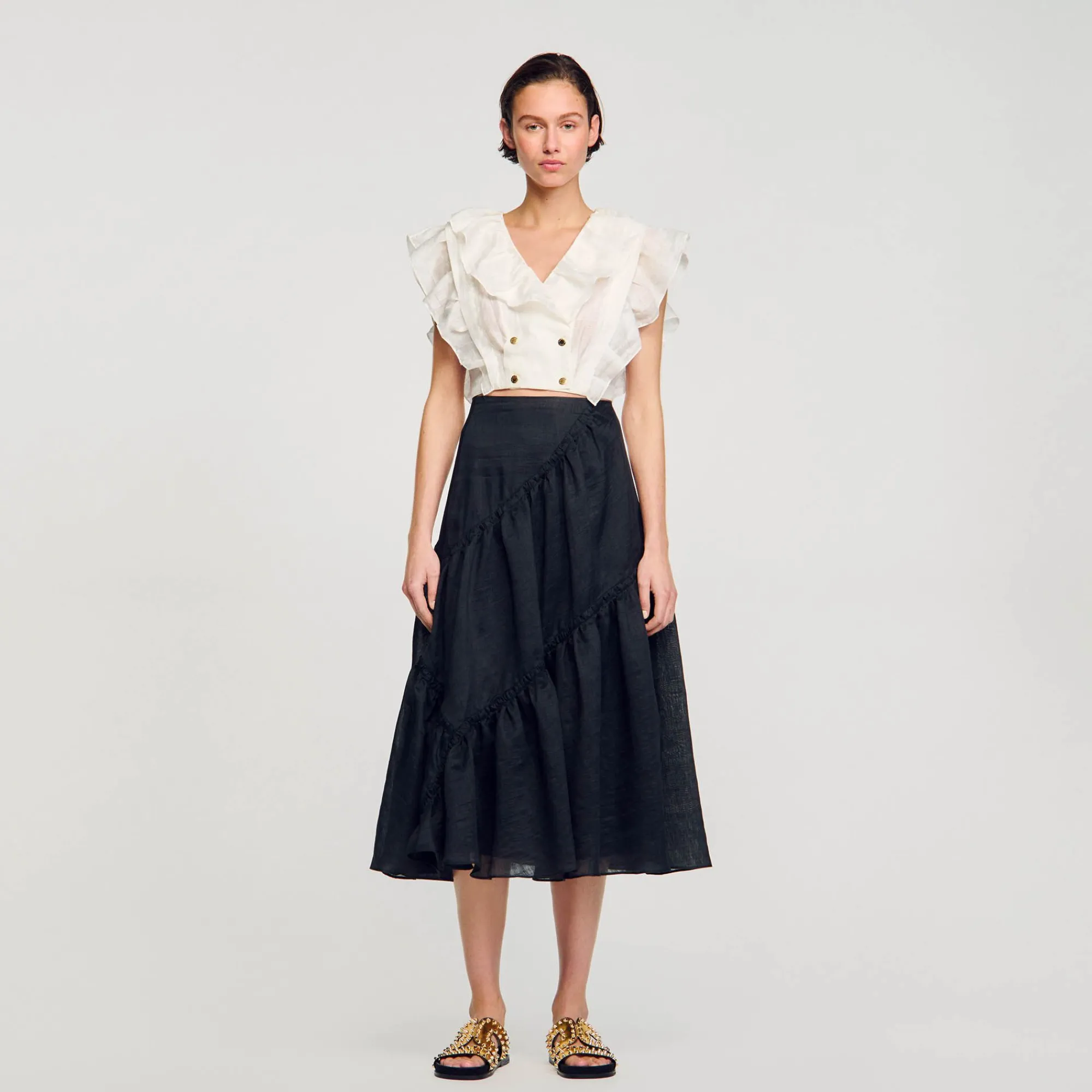 Top Curto Sem Mangas Com Decote Em V Cruzado Com Botões De Pressão, Sublimado Com Folhos Oversized.
