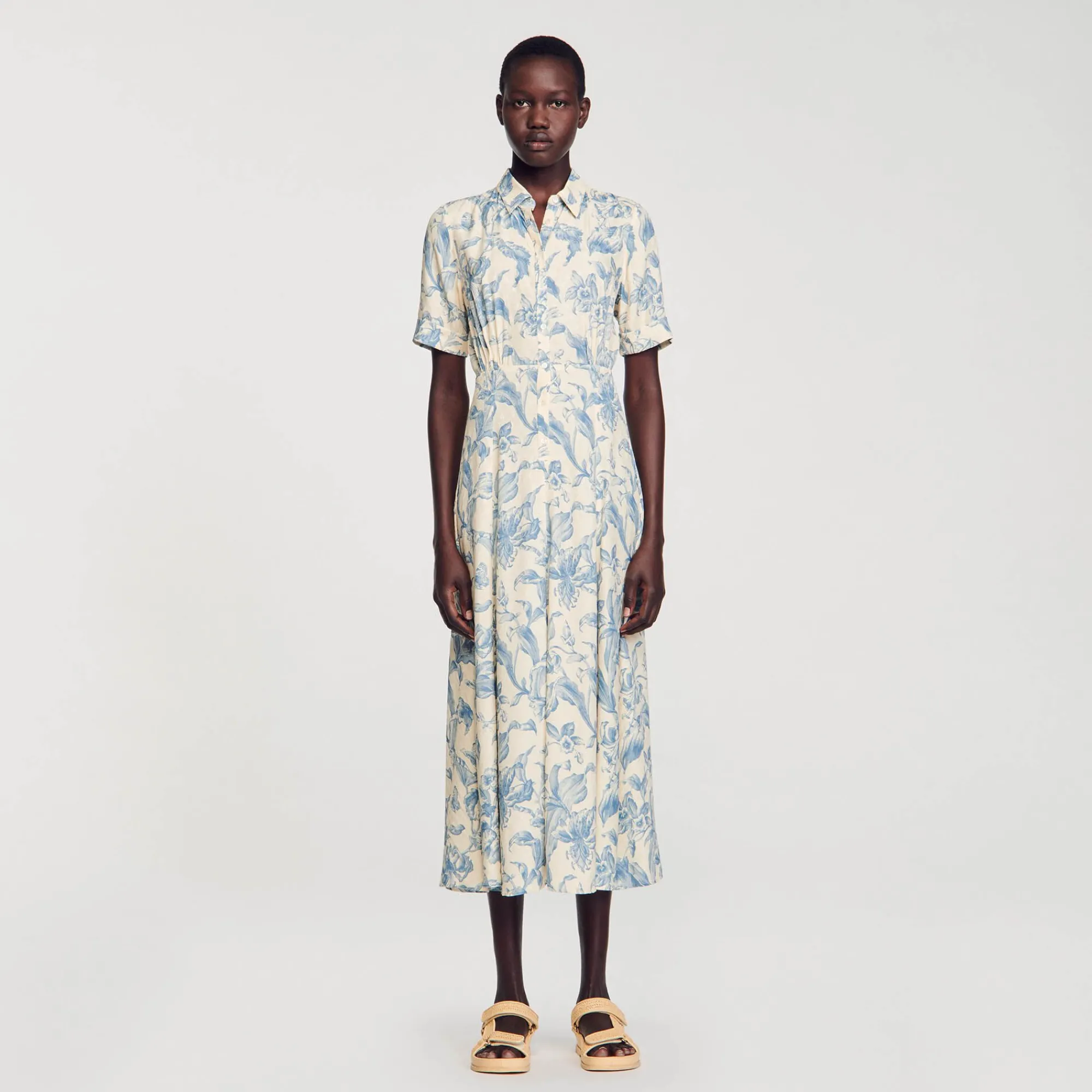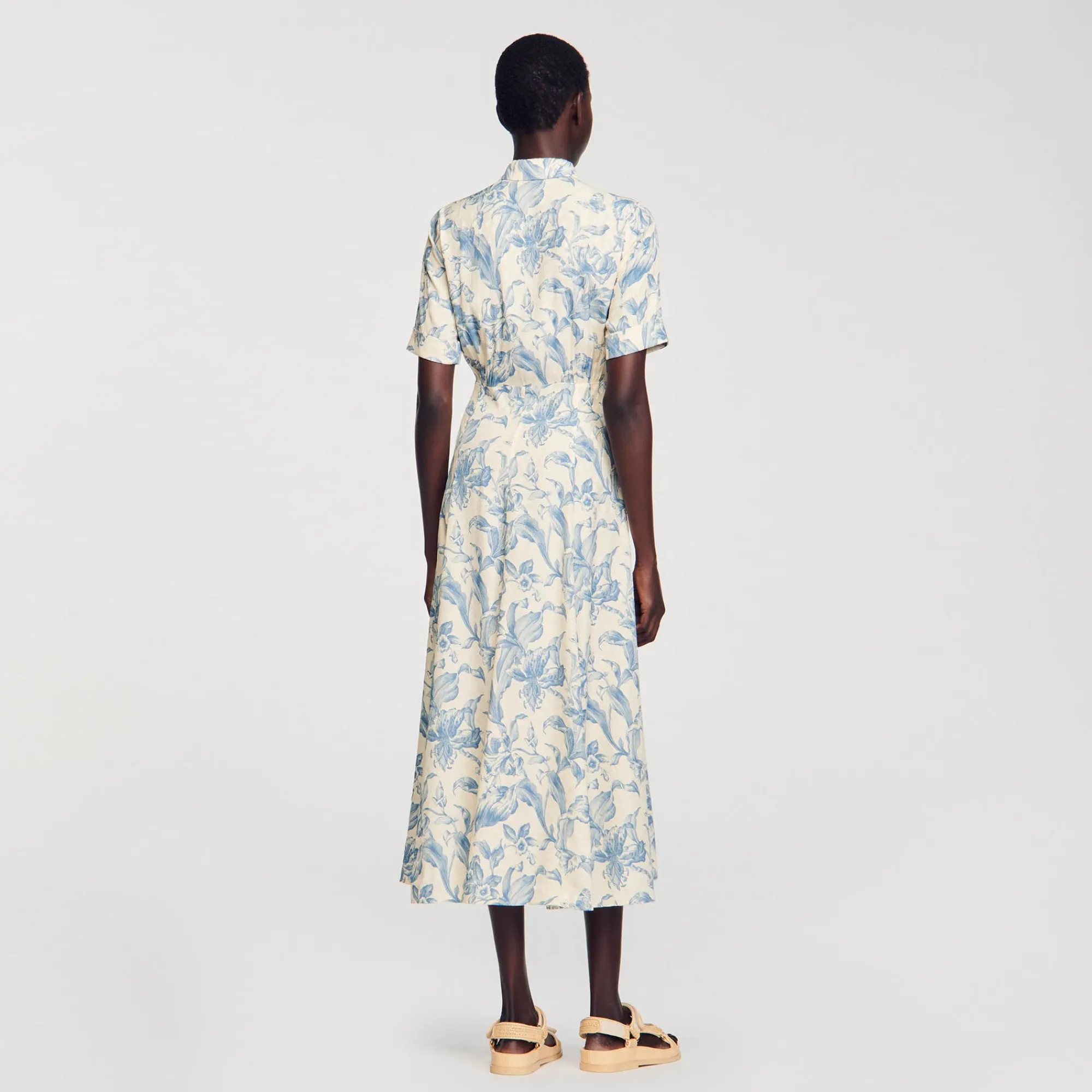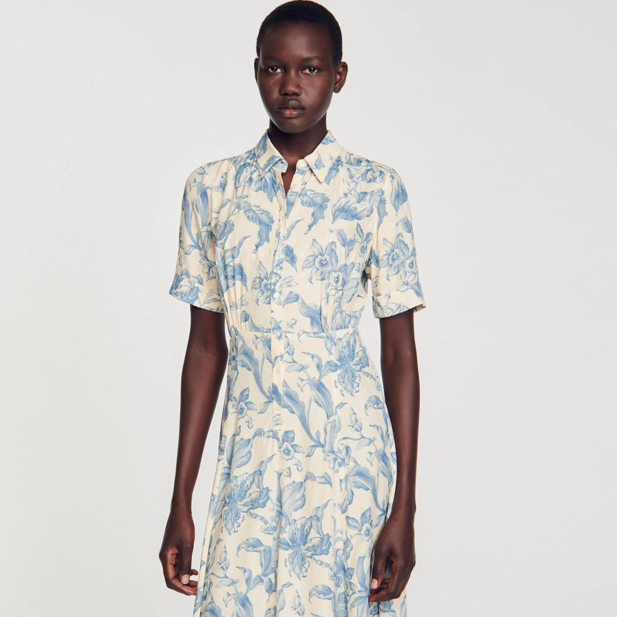 Vestido Camisa Longo E Justo Decorado Com Estampa Floral, Gola Camisa, Manga Curta Com Punhos E Fecho De Botão Na Frente.