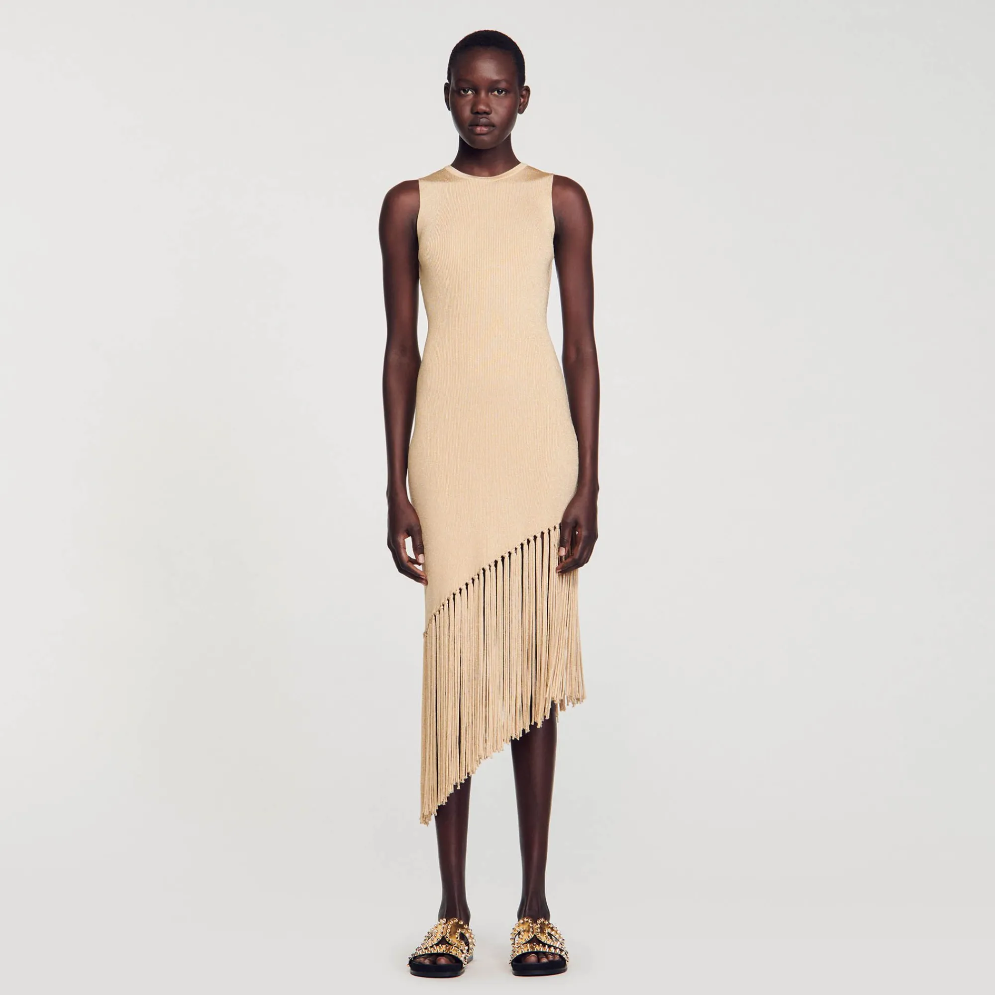 Vestido Longo De Malha Canelada, Sem Mangas, Com Decote Redondo E Decorado Com Franjas Assimétricas Na Bainha.