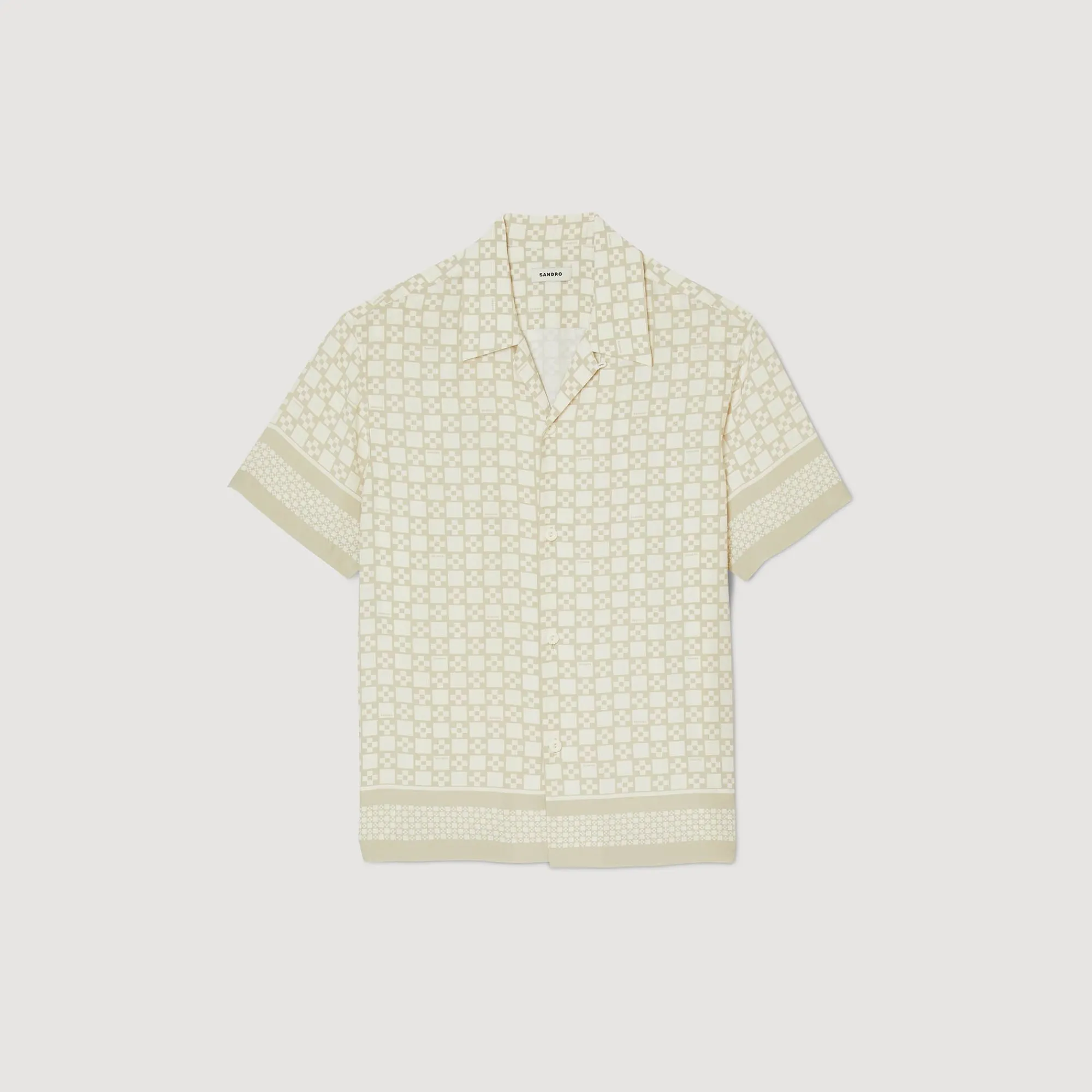 Camisa Fluida Com Estampa Square Cross, Gola Italiana, Manga Curta E Fecho De Botão. Camisa Fluida Sandro Homme Gola It…