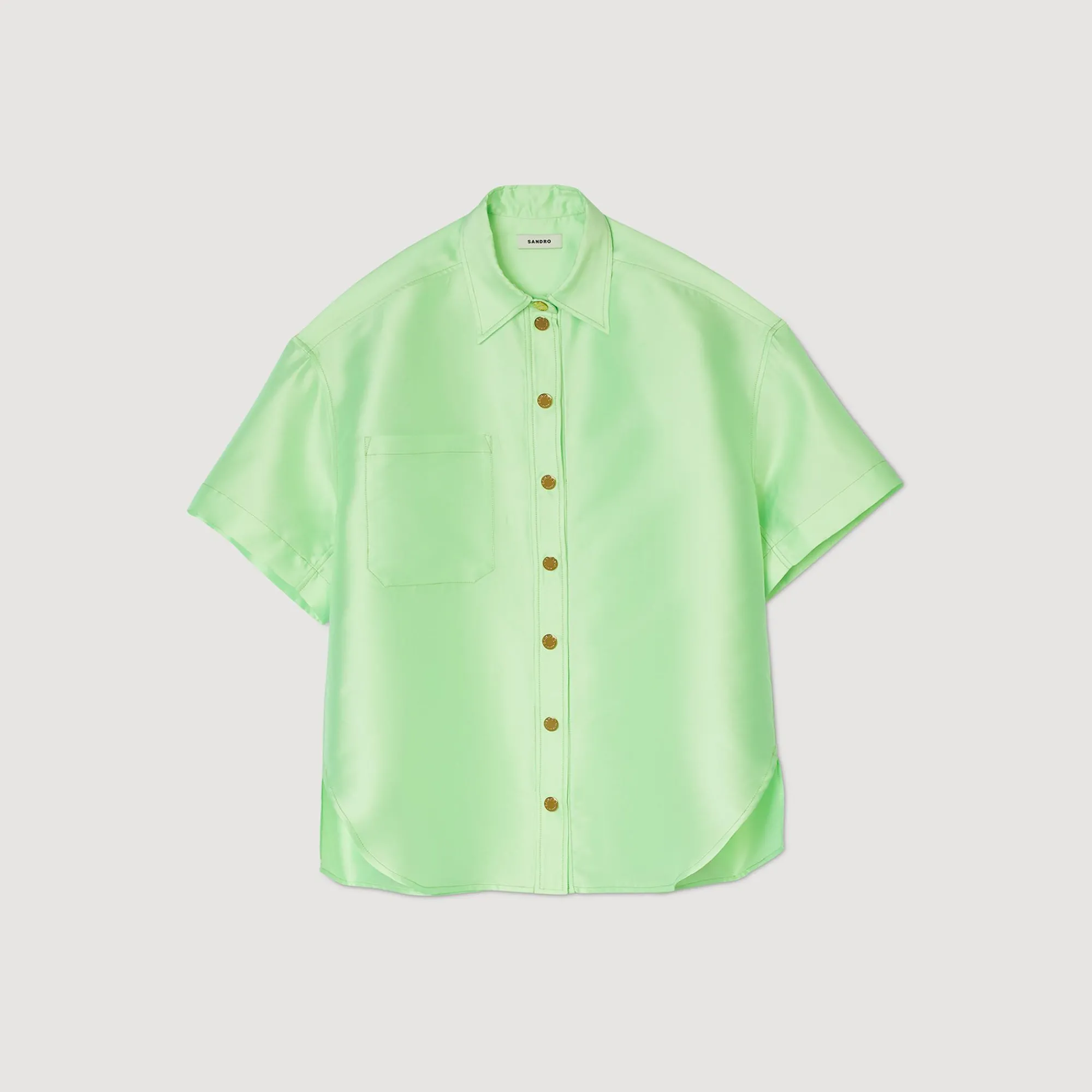 Camisa Oversized Em Cetim Com Mangas Curtas E Largas, Com Bolso De Aplicação No Peito E Carcela Com Botões Popper.