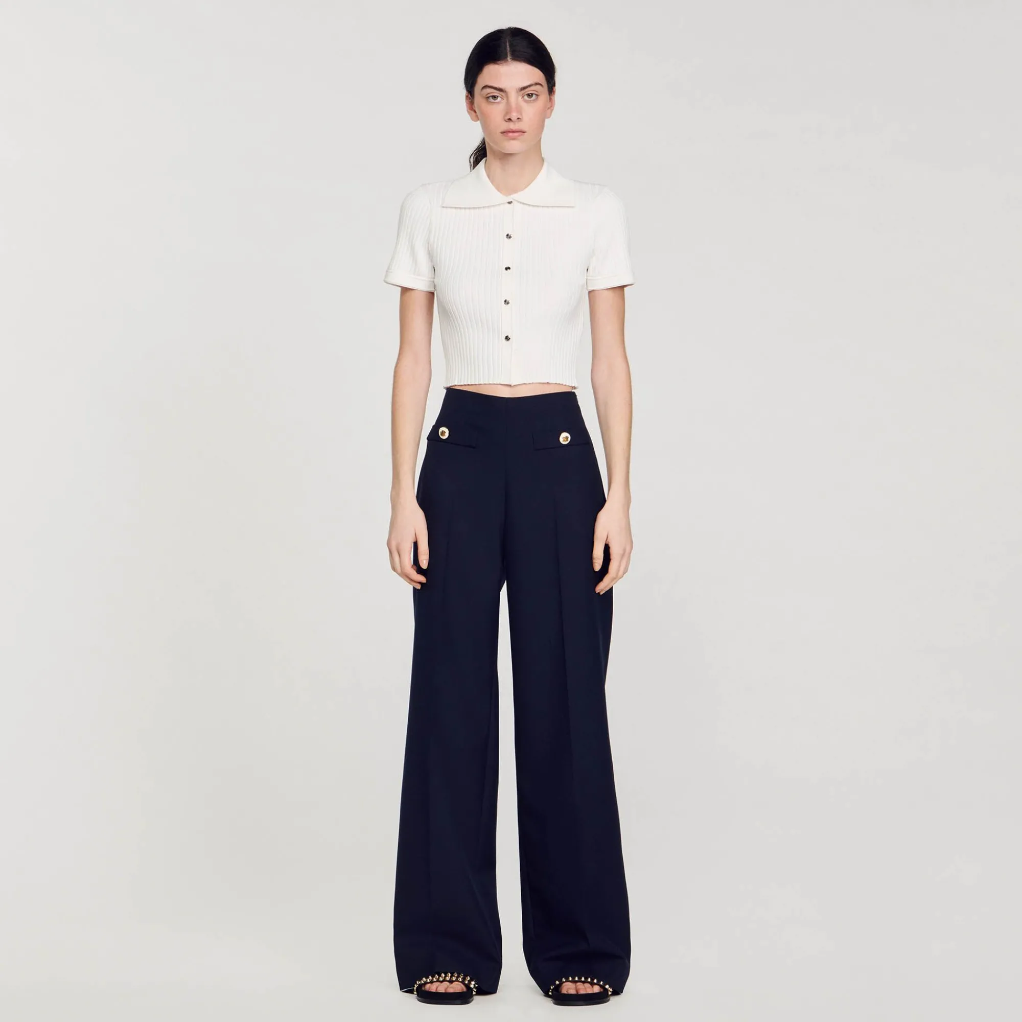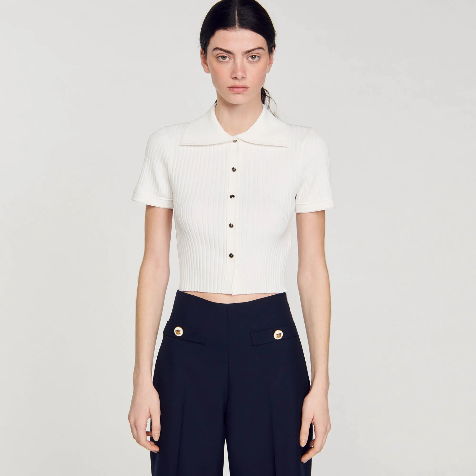 Suéter Curto De Malha Canelada Com Gola De Jaqueta, Mangas Curtas E Fecho De Botão.Sandro Suéter Feminino De Malha Cu…