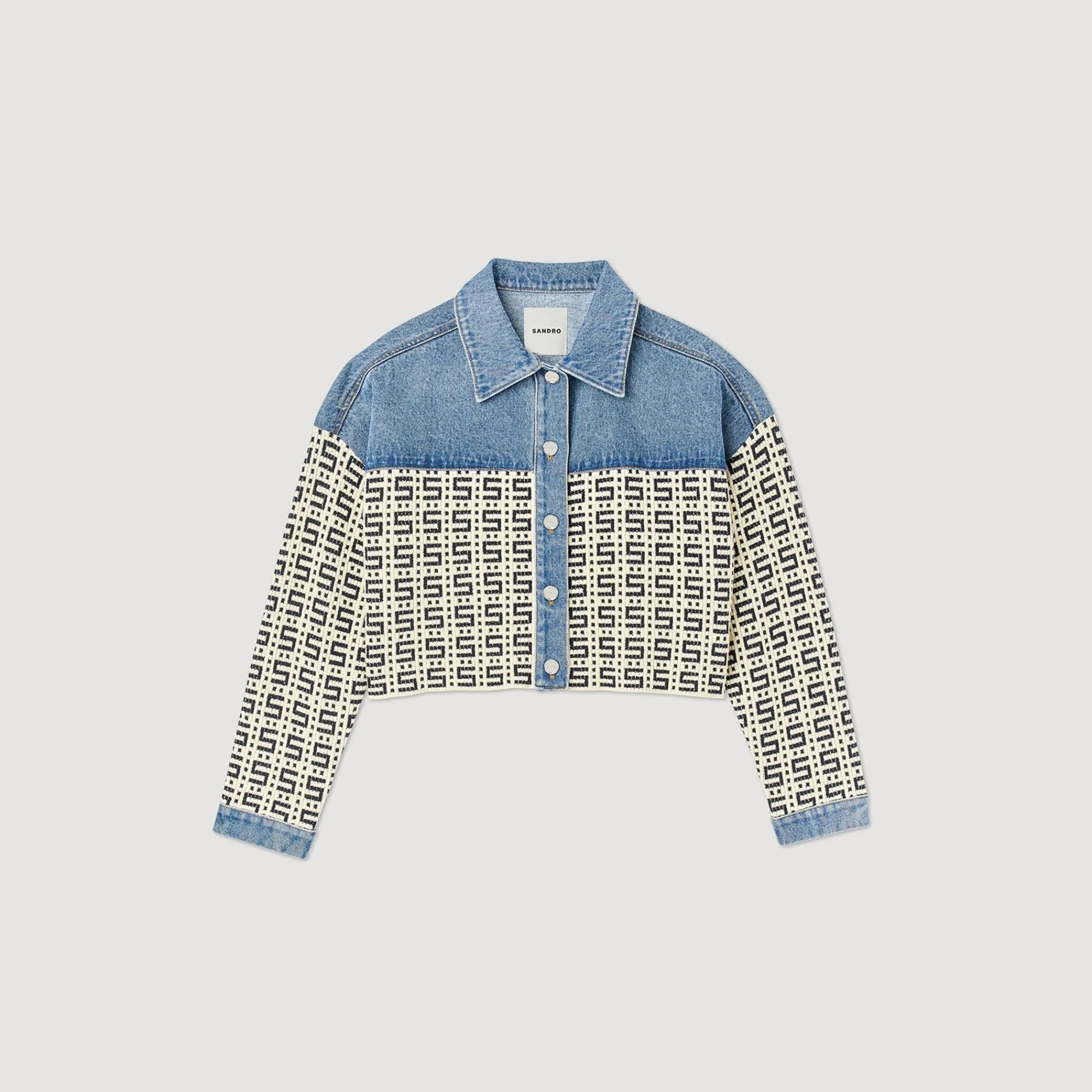 Cardigan Curto De Manga Comprida Em Ganga E Malha Com Logótipo Jacquard, Abotoado No Centro Da Frente.