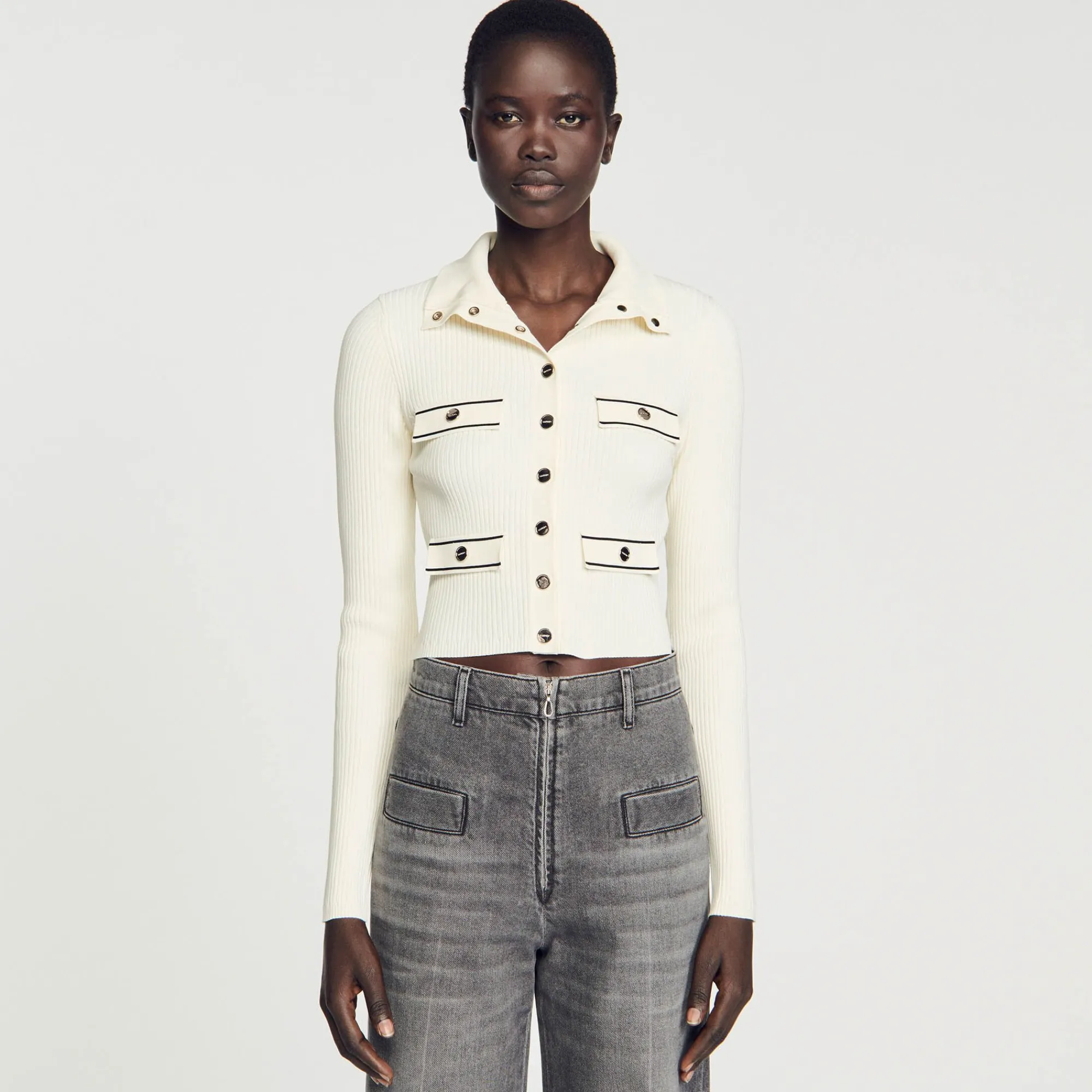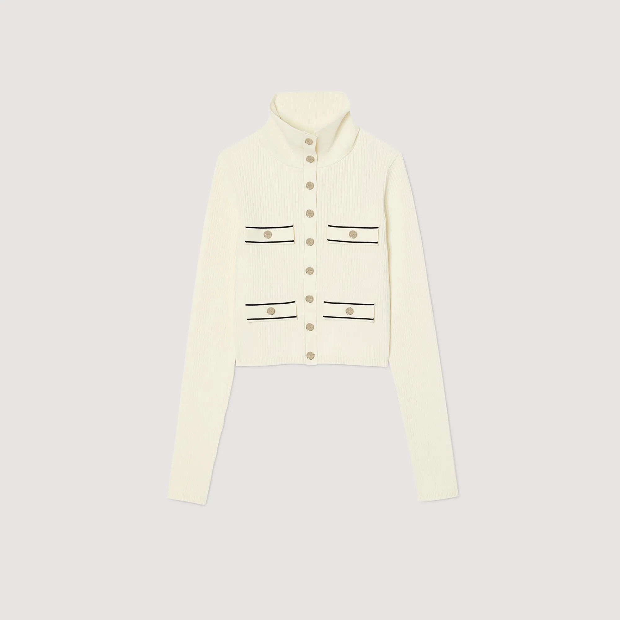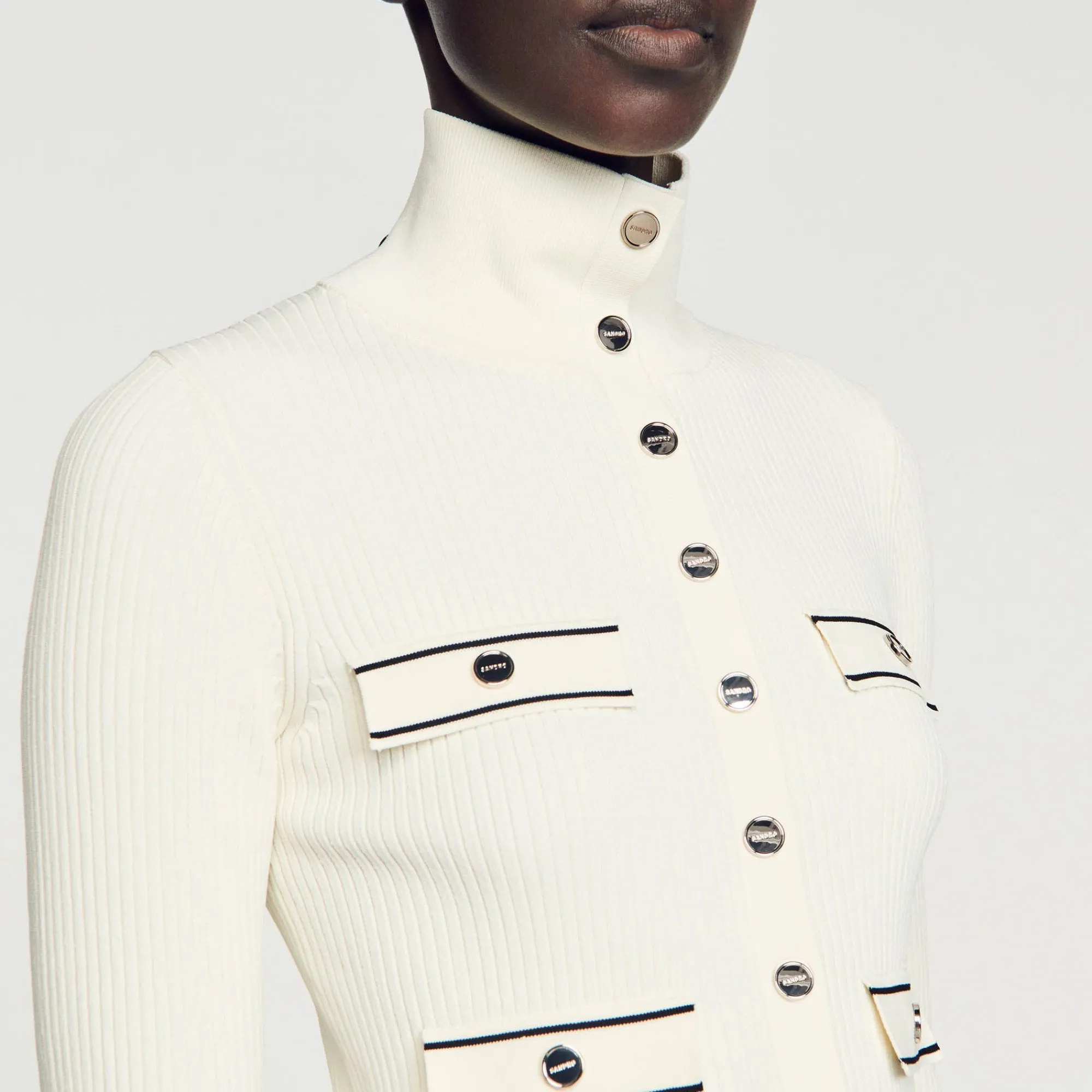 Cardigan De Malha Canelada Com Gola Alta, Mangas Compridas, Fecho De Botão De Pressão E Bolsos Canelados Contrastantes.