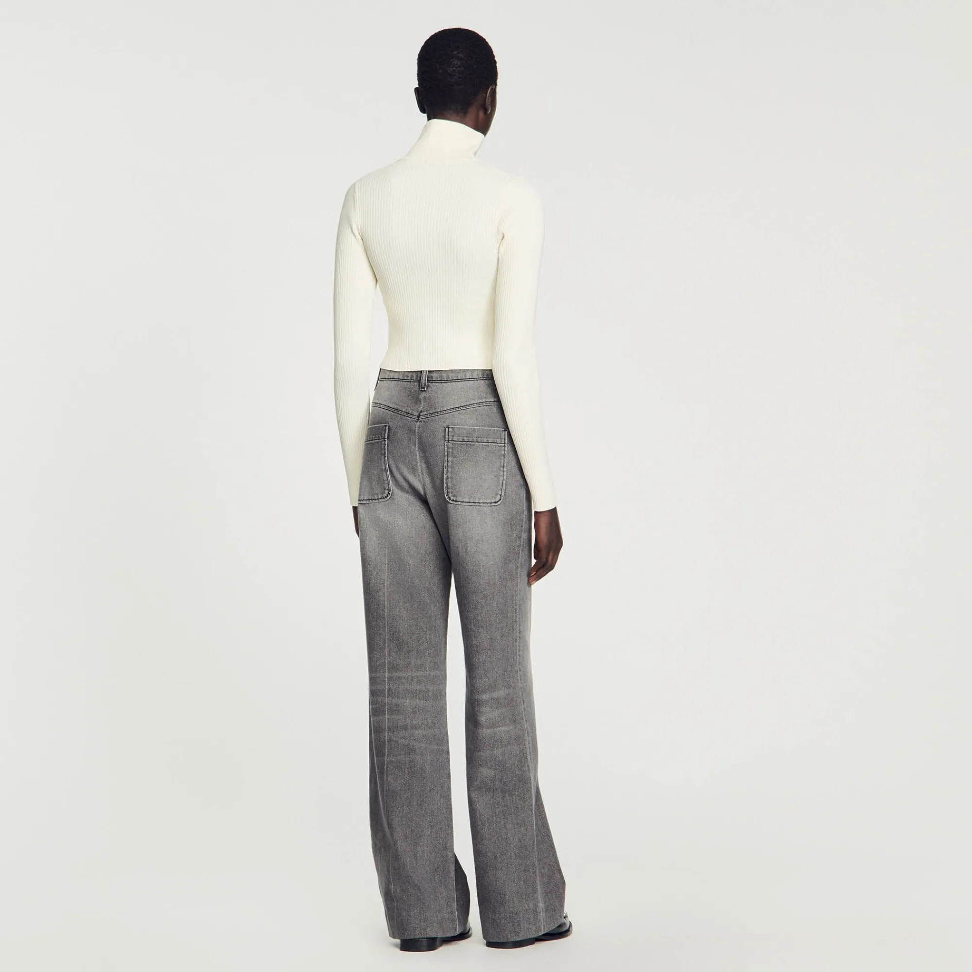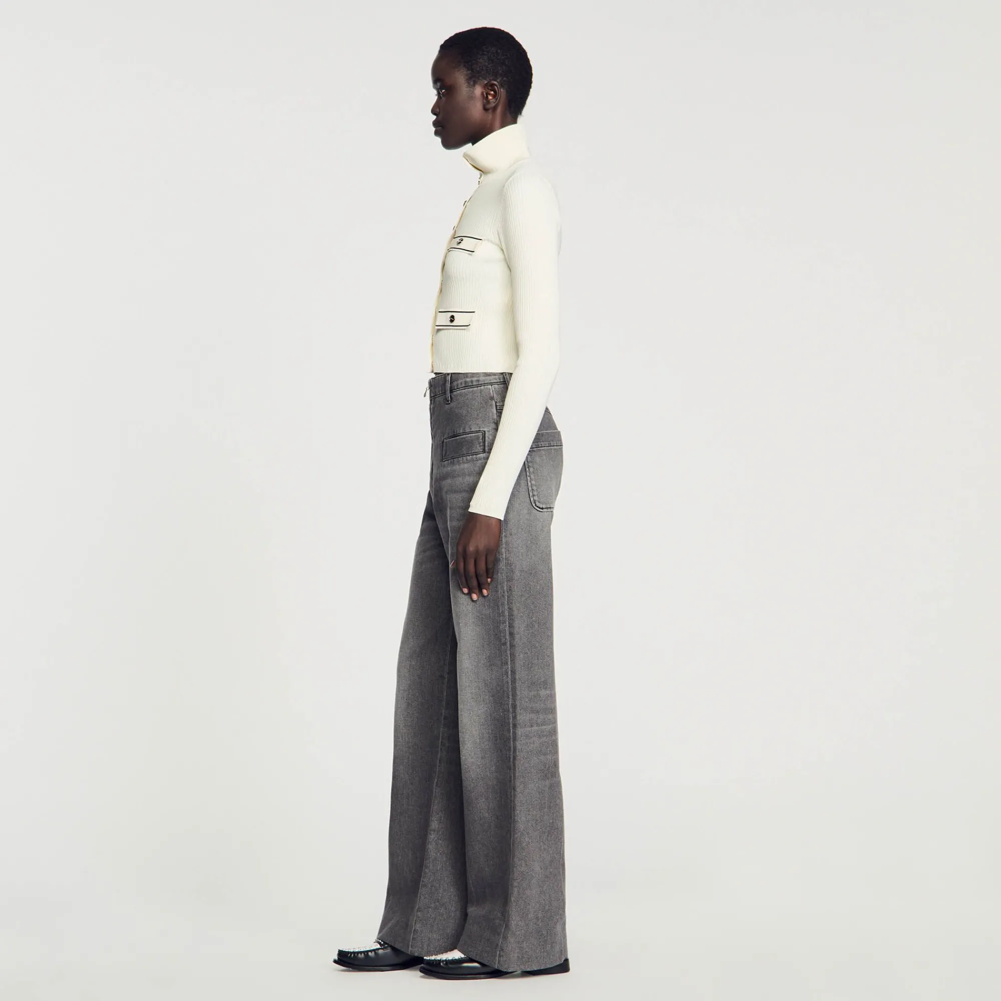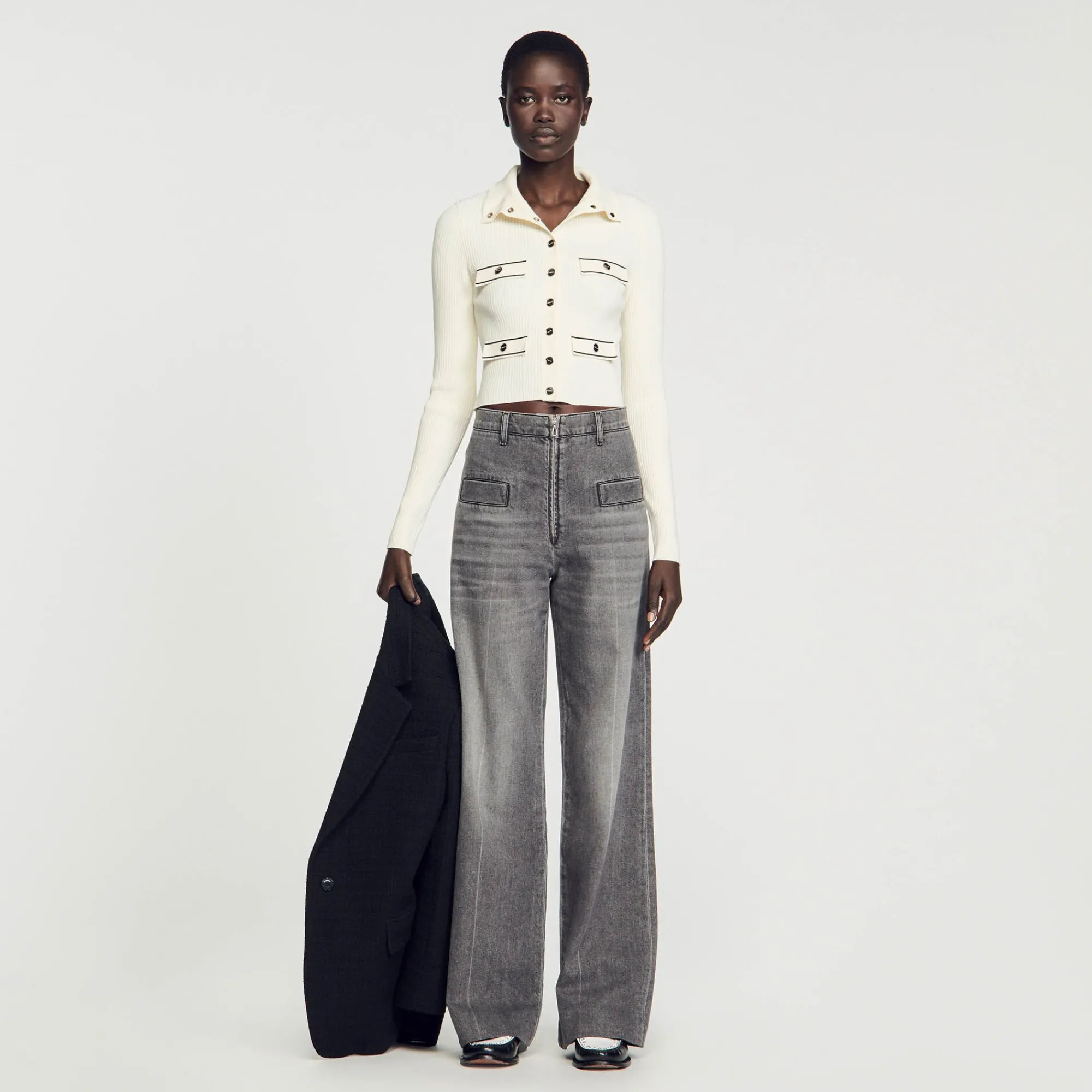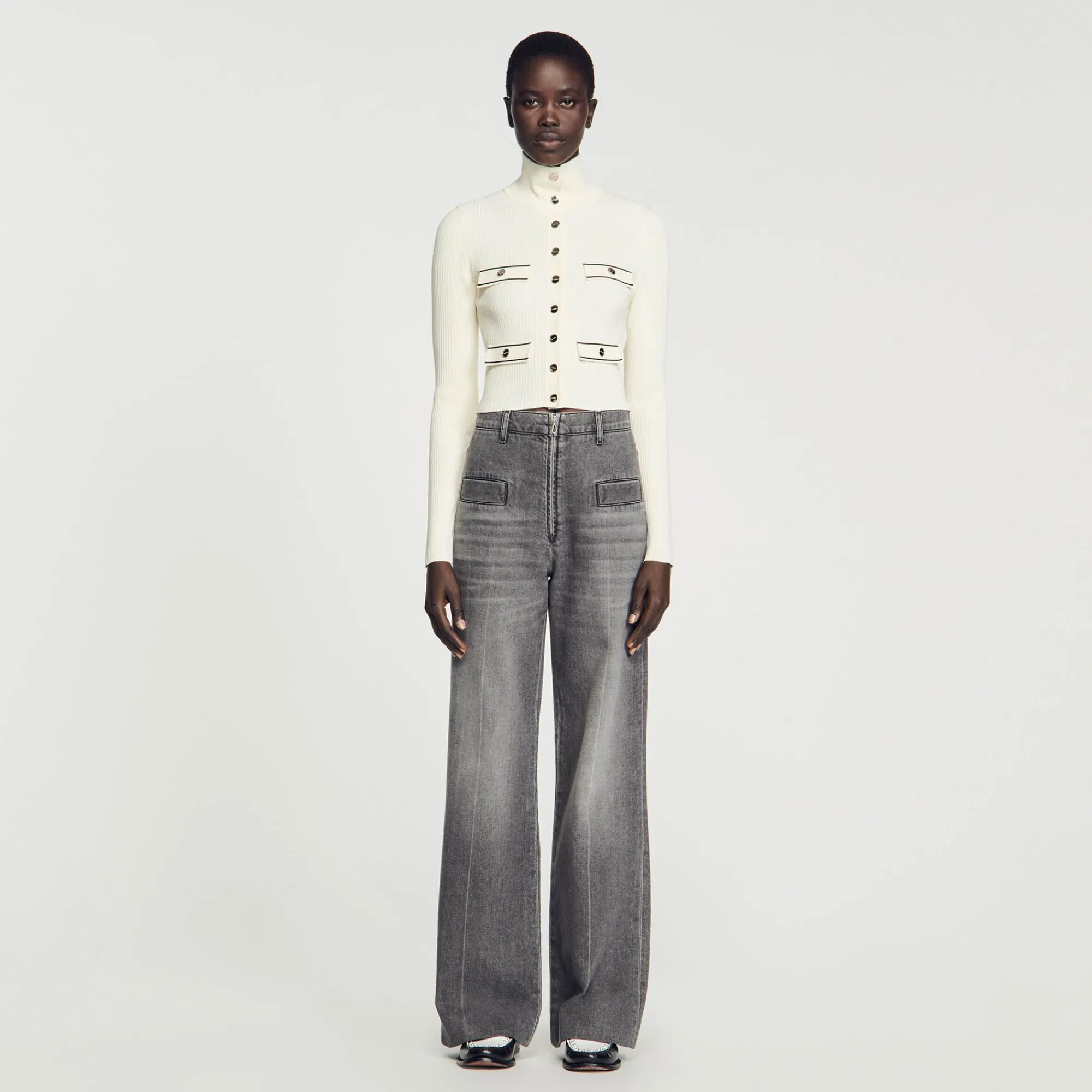 Cardigan De Malha Canelada Com Gola Alta, Mangas Compridas, Fecho De Botão De Pressão E Bolsos Canelados Contrastantes.