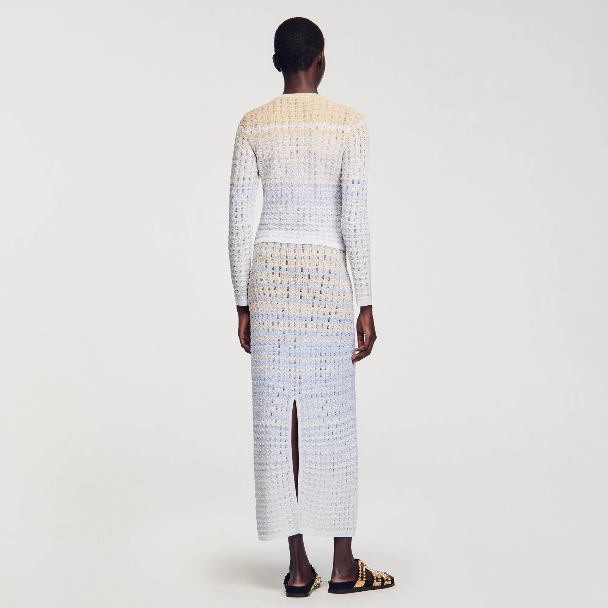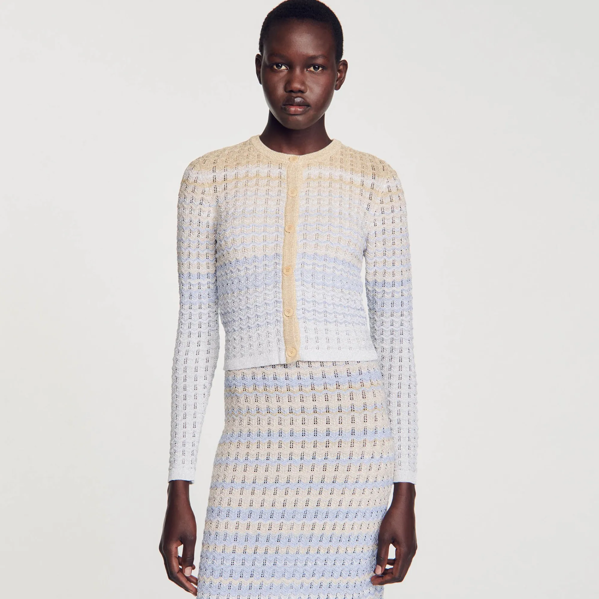 Cardigã Em Malha Pointelle Degradê Com Motivos Em Zigue-Zague, Manga Comprida, Gola Redonda E Fecho De Botão.