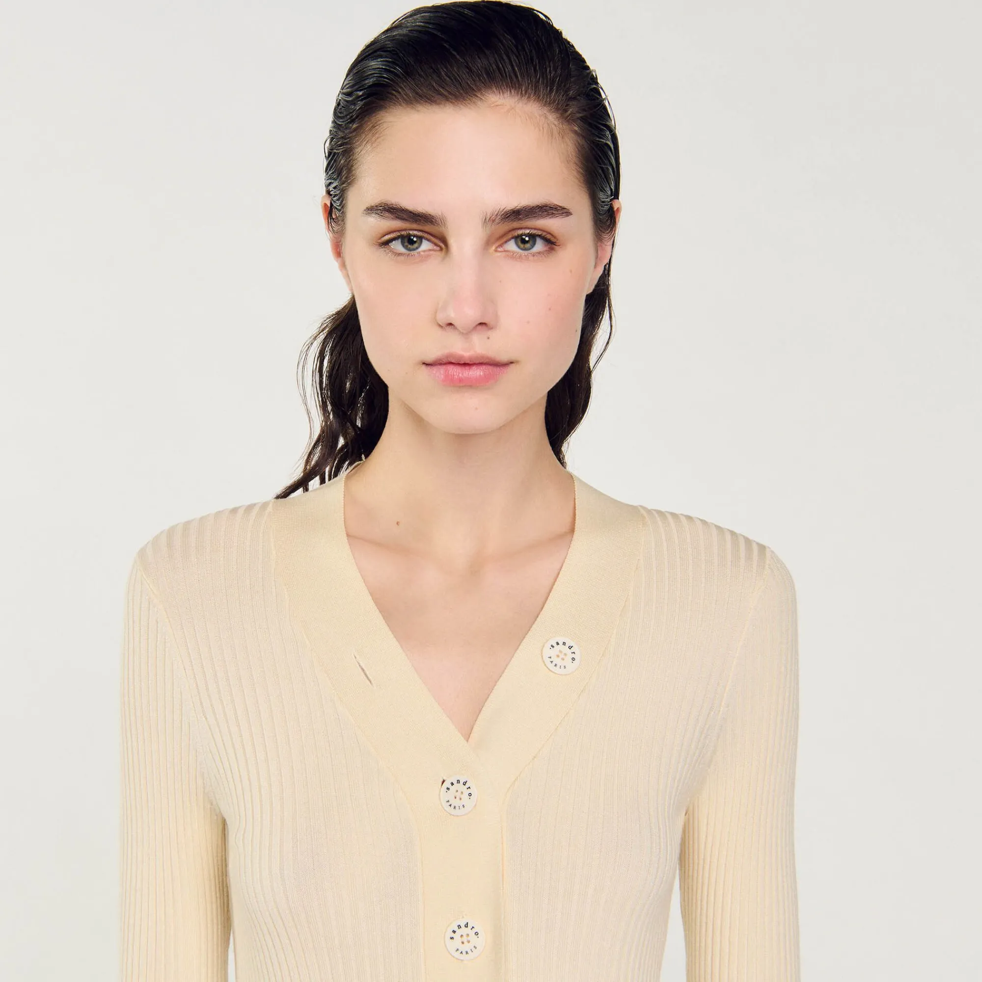 Cardigã De Manga Comprida Com Decote Em V Em Malha Canelada Fina Com Fecho De Botão.