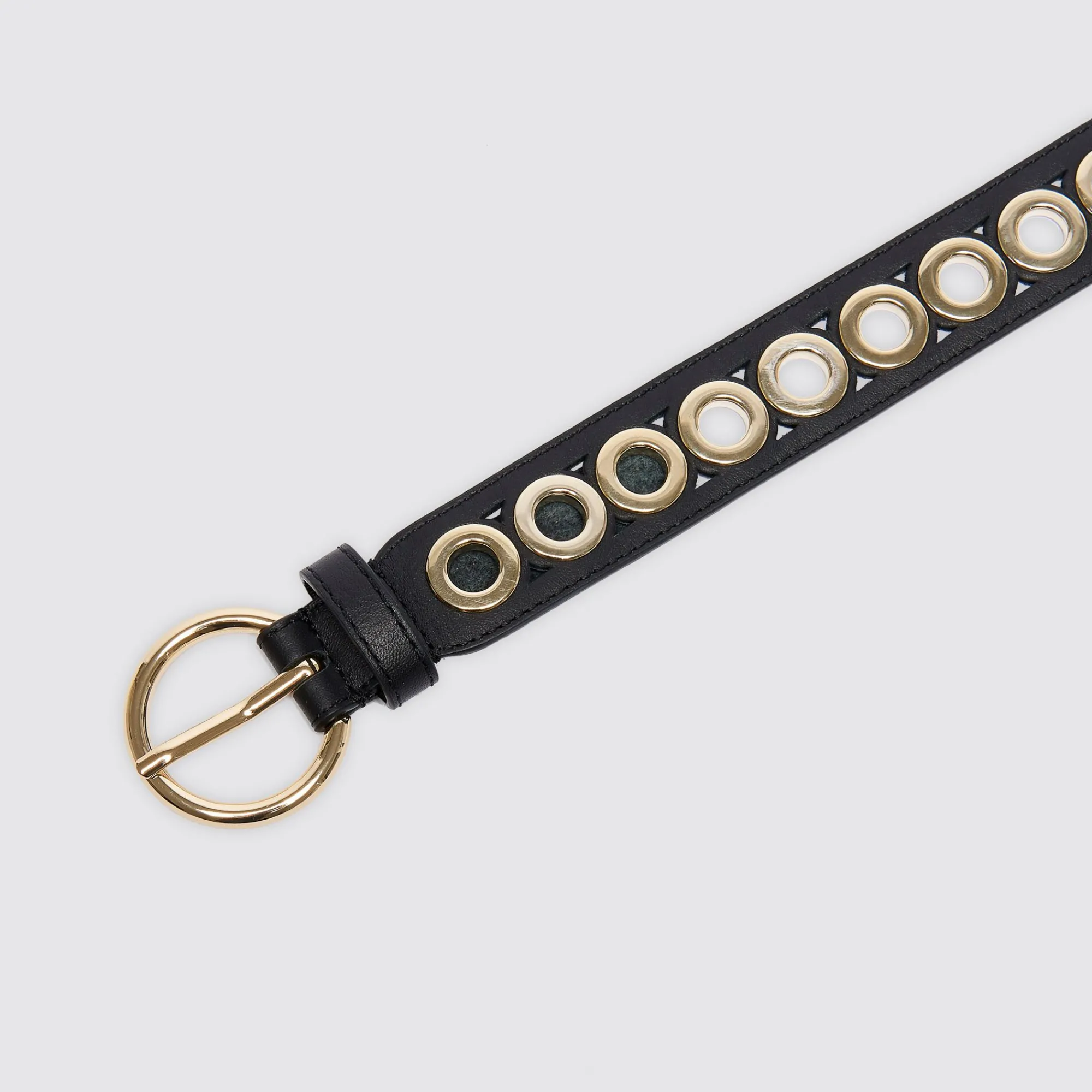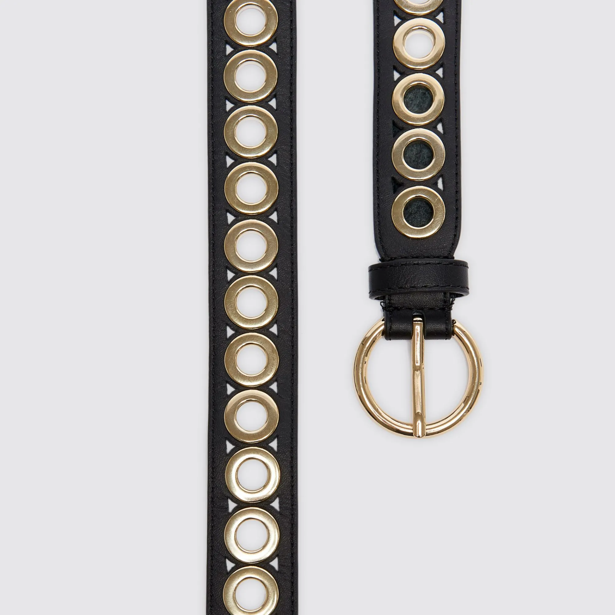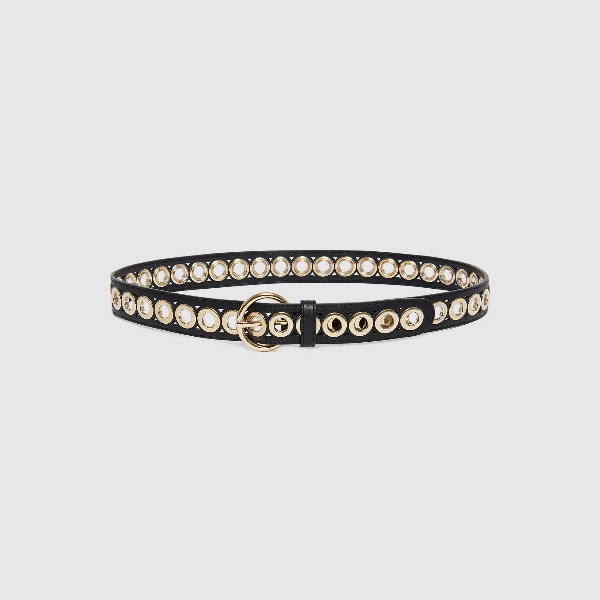 Cinto Sandro• 100% Couro• Fivela Redonda Dourada• Ilhós Decorativos Em Toda A Superfície• Tamanho Ajustável E…