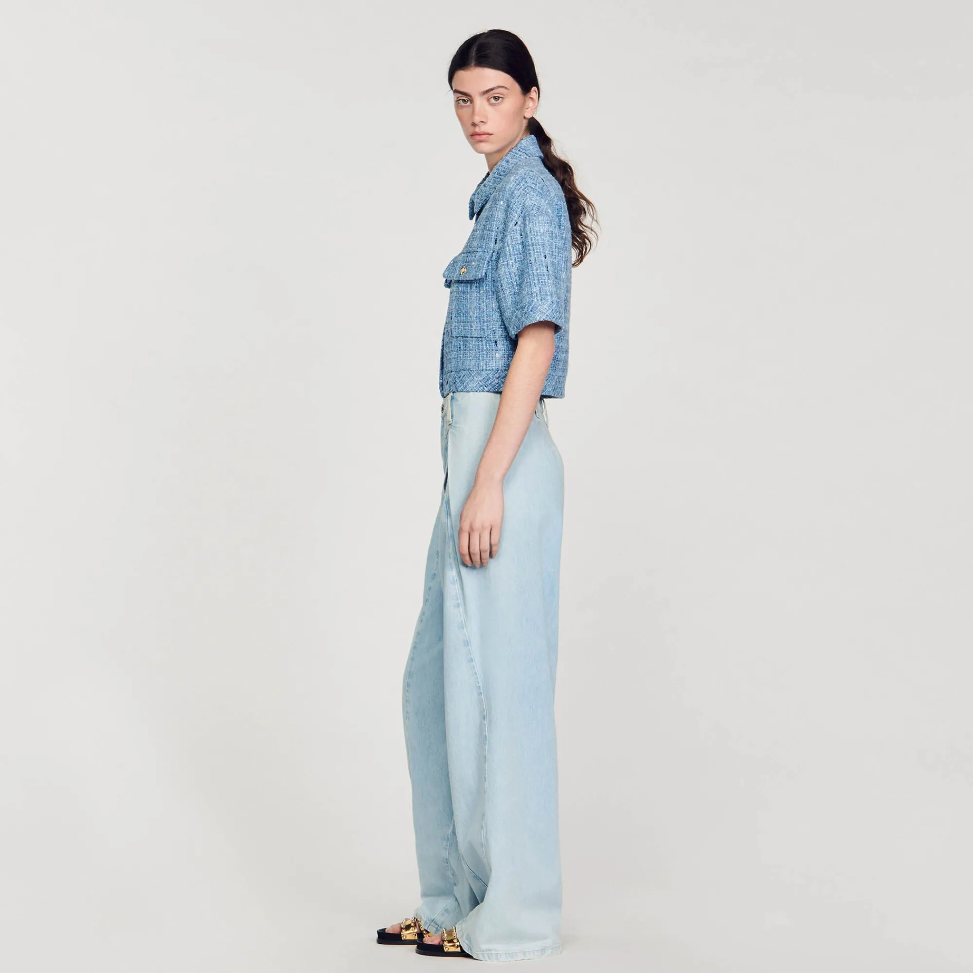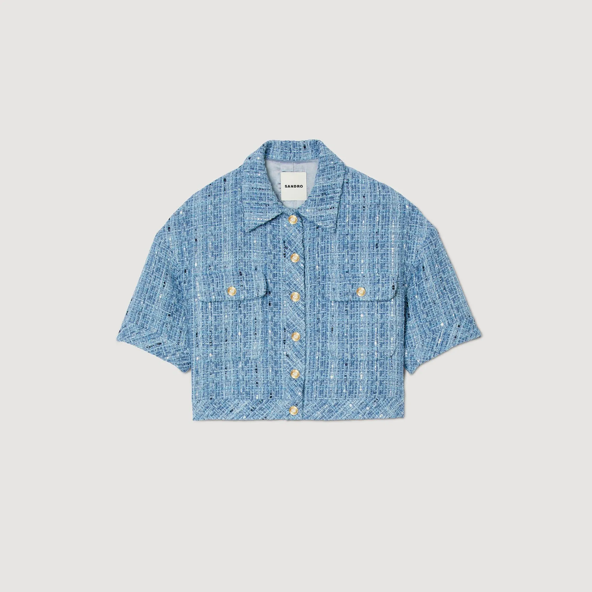 Jaqueta Curta De Tweed Fantasia Com Gola De Camisa, Mangas Curtas E Bolsos Com Aba No Peito.