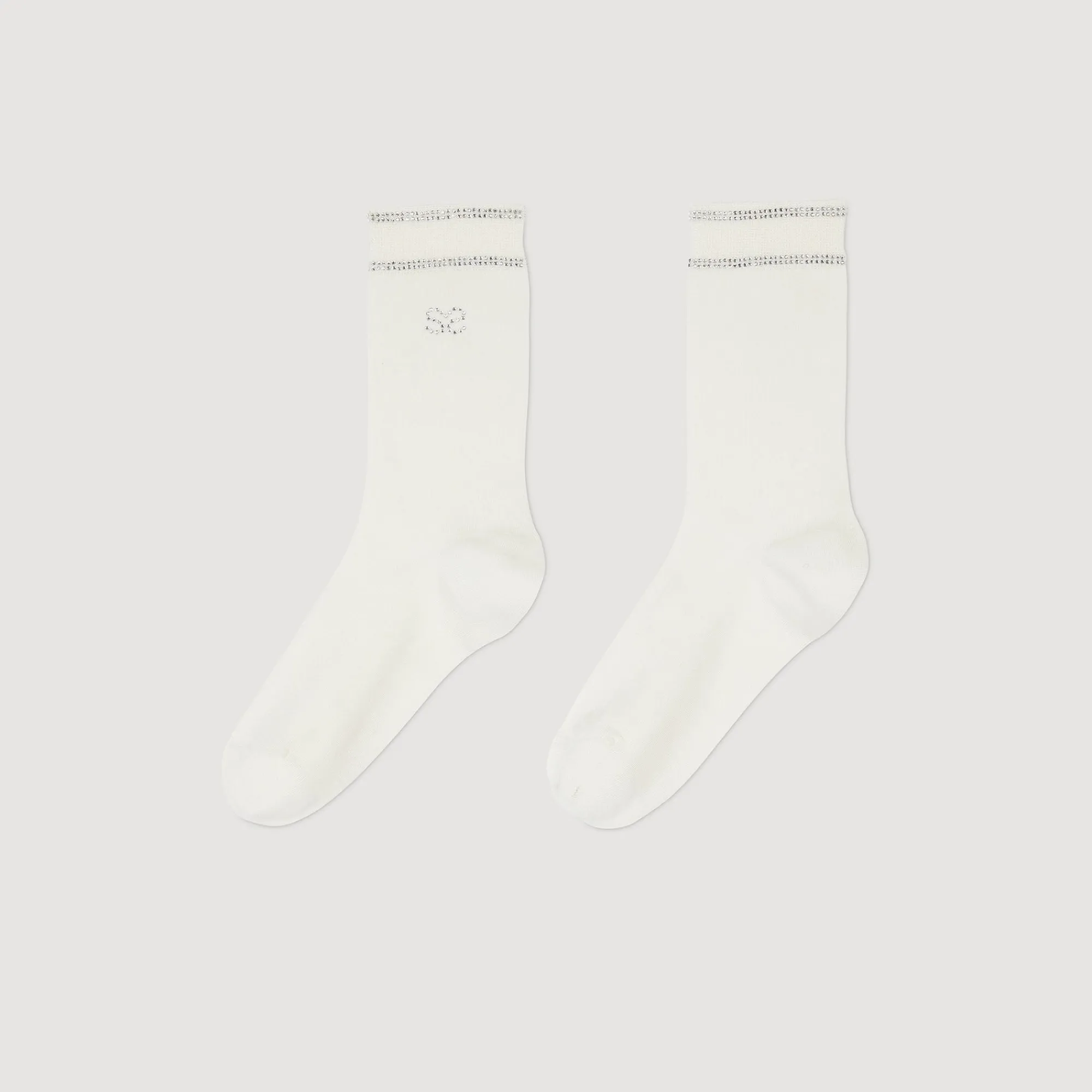 Meias Caneladas Decoradas Com Logotipo S Duplo E Linhas De Strass. Meias Caneladas Sandro Femme Imitação De Linhas E L…