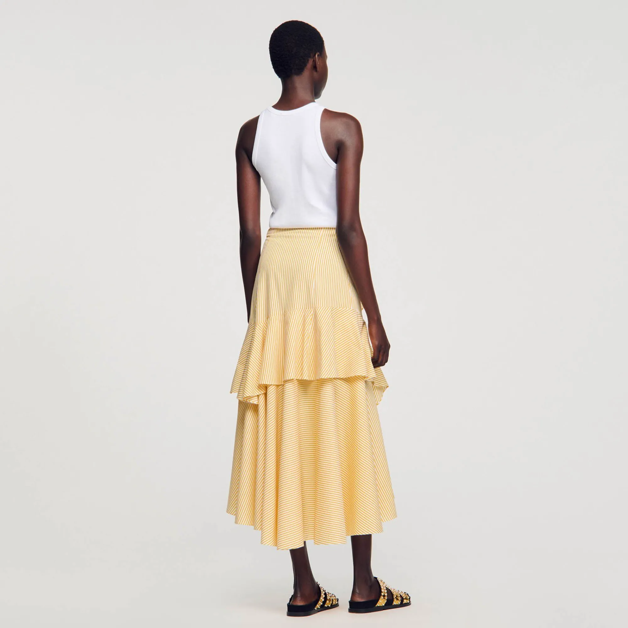 Saia Longa Listrada Decorada Com Babados Assimétricos E Franzida Na Cintura. Saia Longa Sandro Femme Estampa Listrada B…