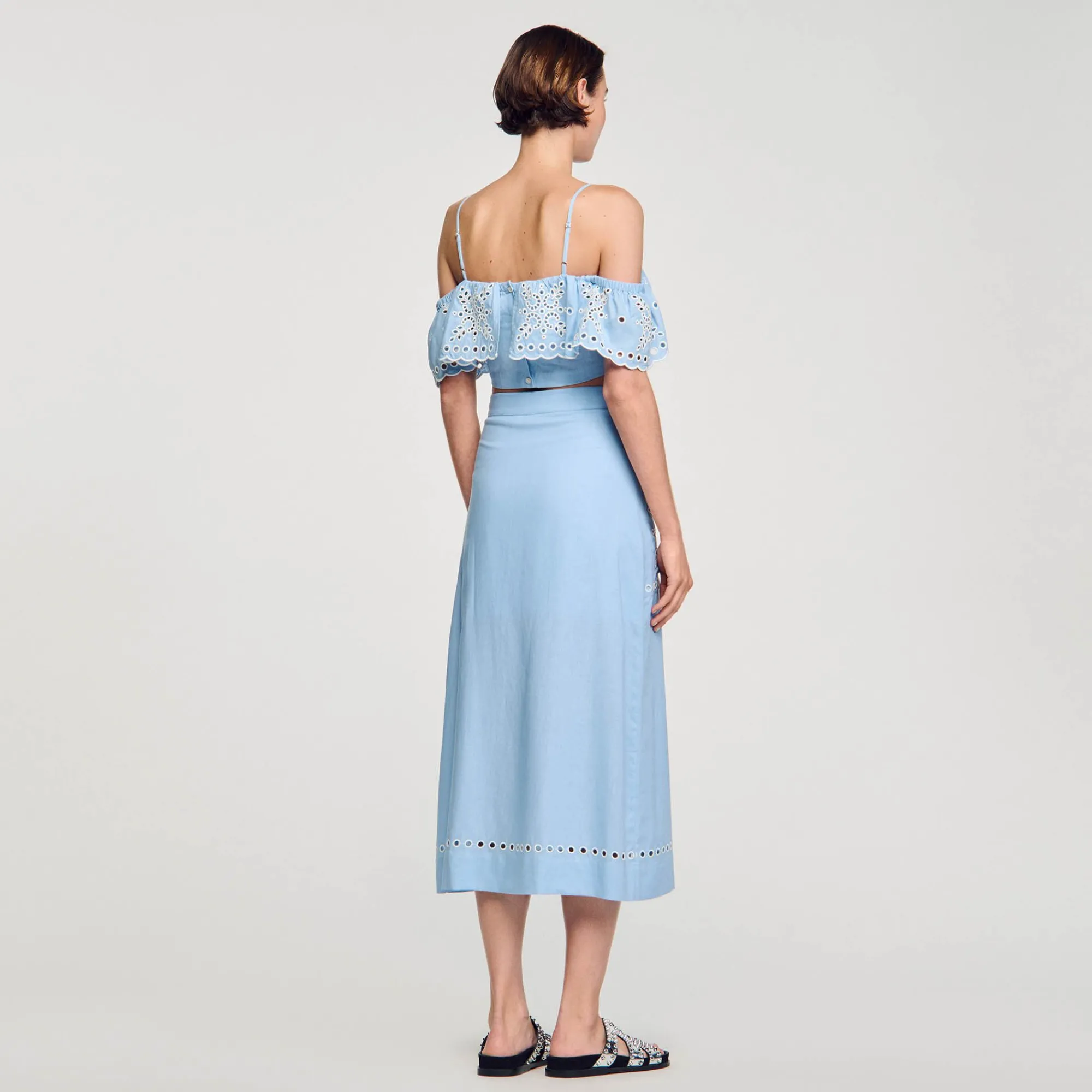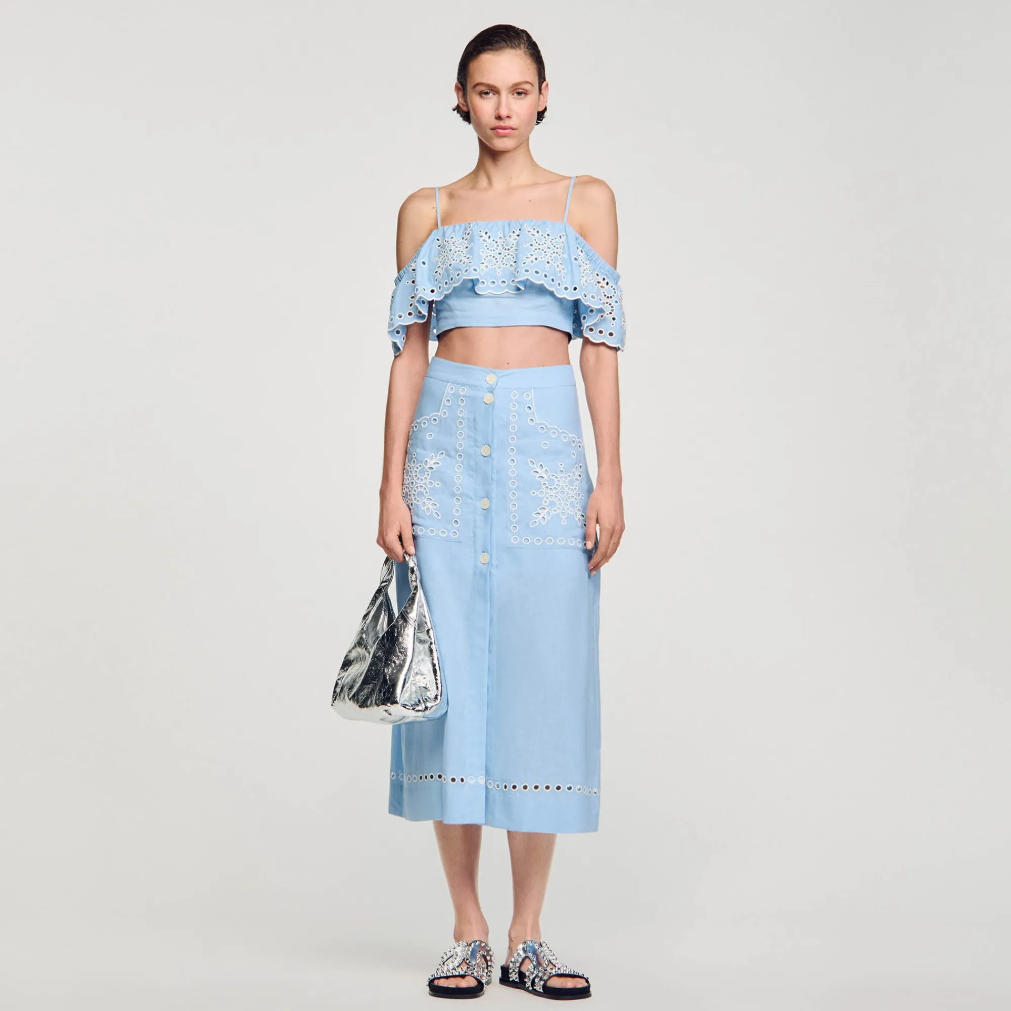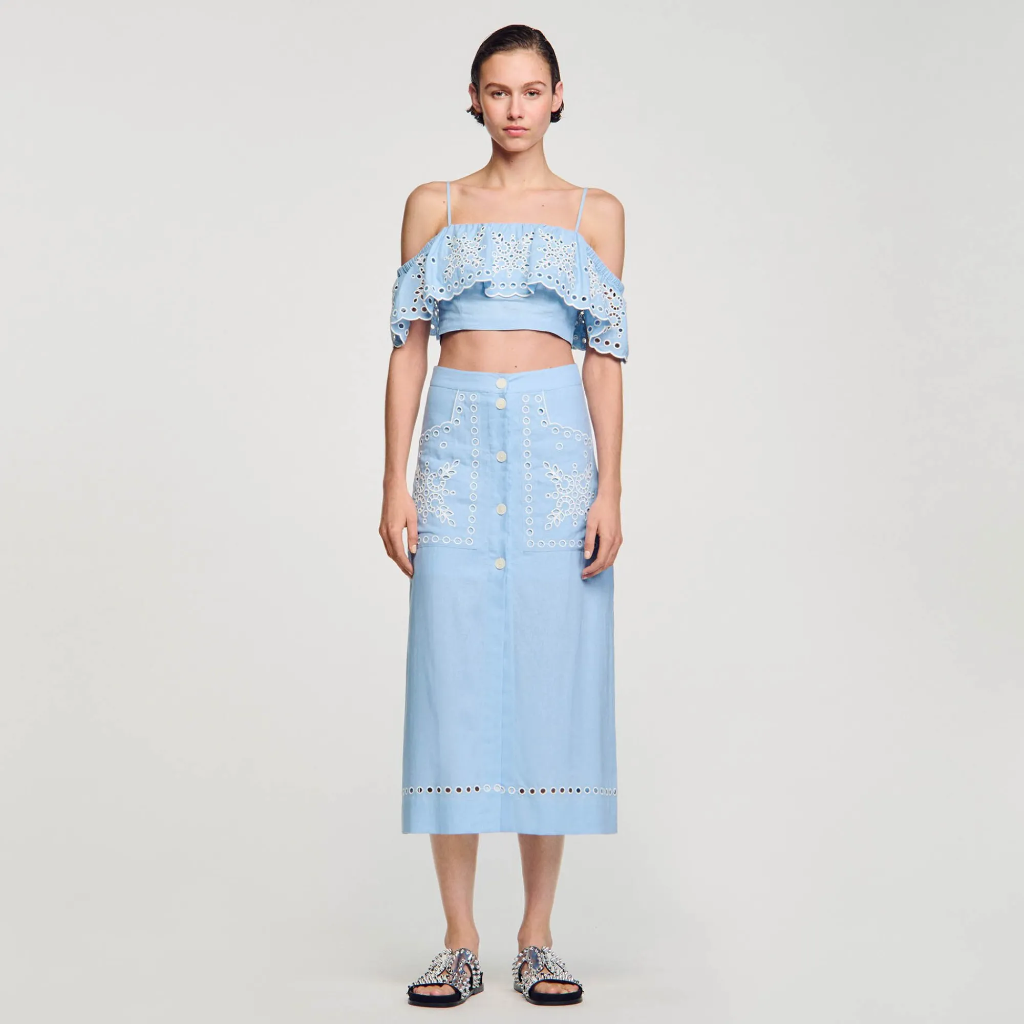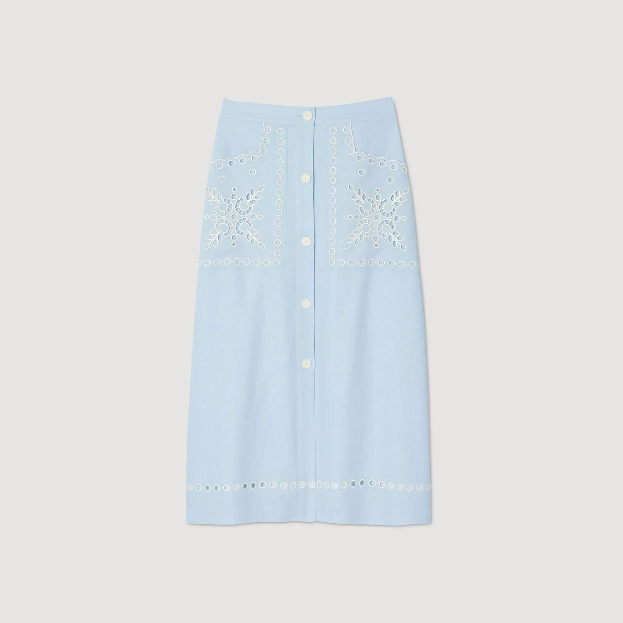 Saia Longa Com Botões E Detalhe De Bordado Inglês Com Flores Em Contraste Nos Bolsos E Na Barra.