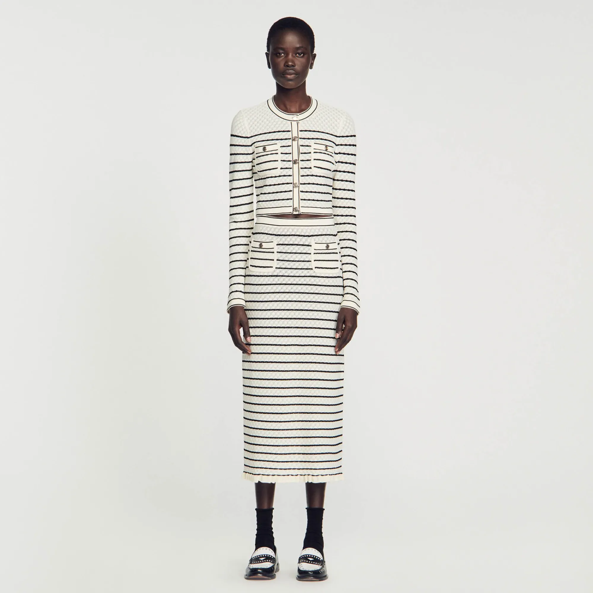 Saia Midi Listrada E Tricot Fantasia Adornada Com Babado Na Parte Inferior, Com Bolsos Na Cintura.