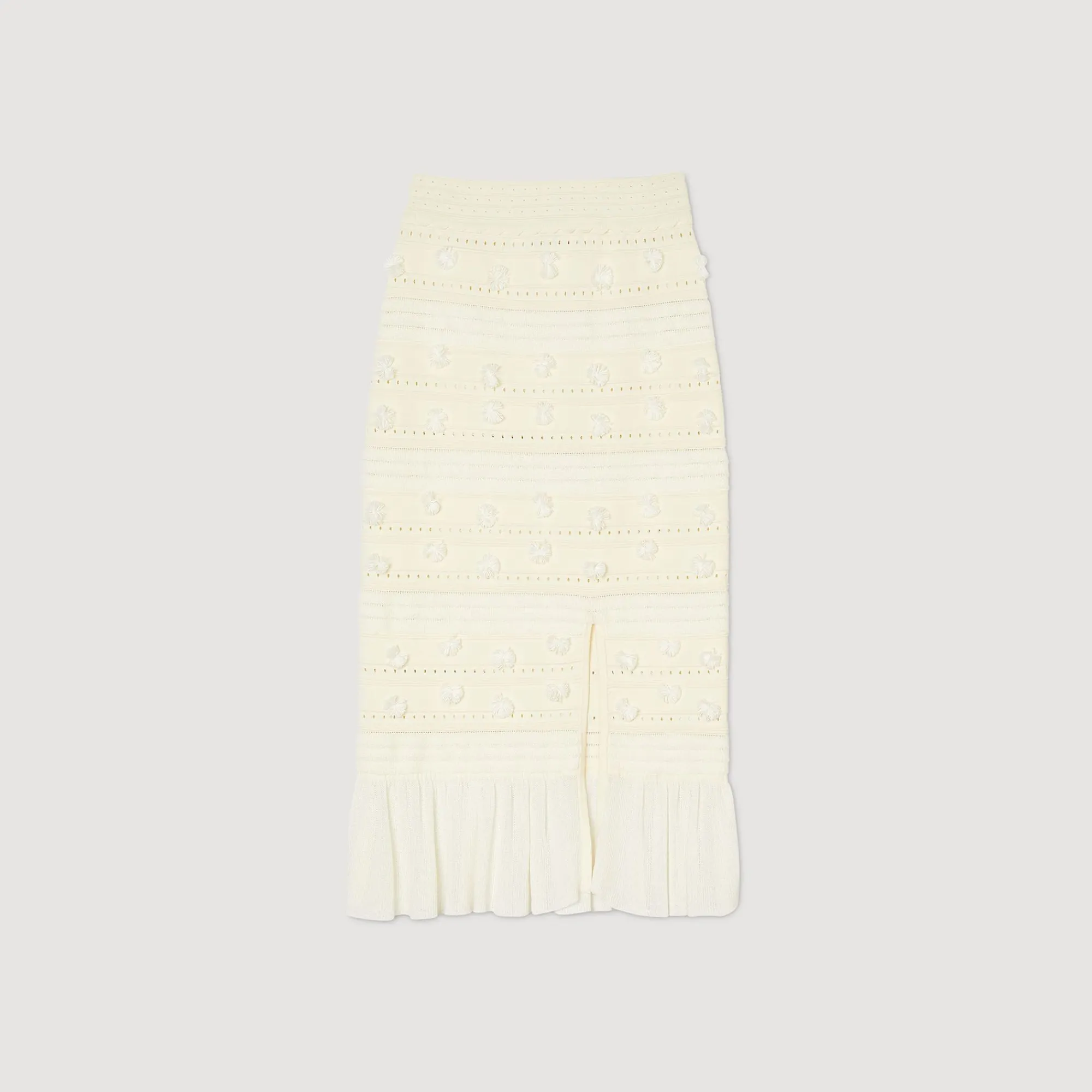 Saia Midi Justa De Corte Reto E Malha Vazada Decorada Com Pequenos Babados E Pompons, Com Elástico Na Cintura E Fenda Na Frente