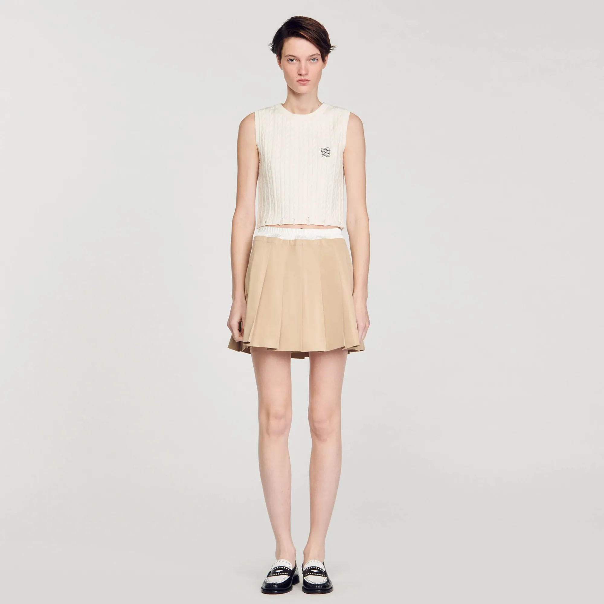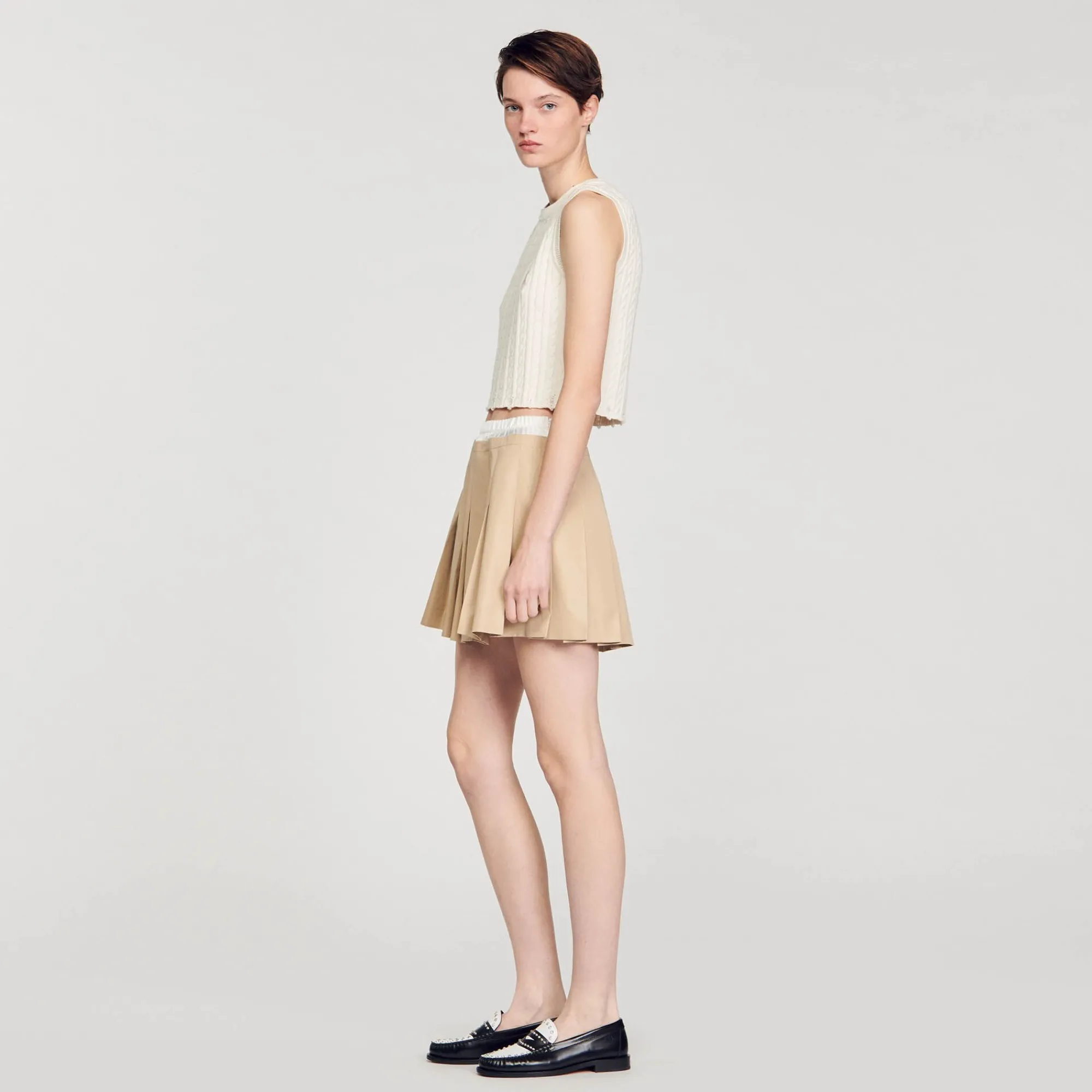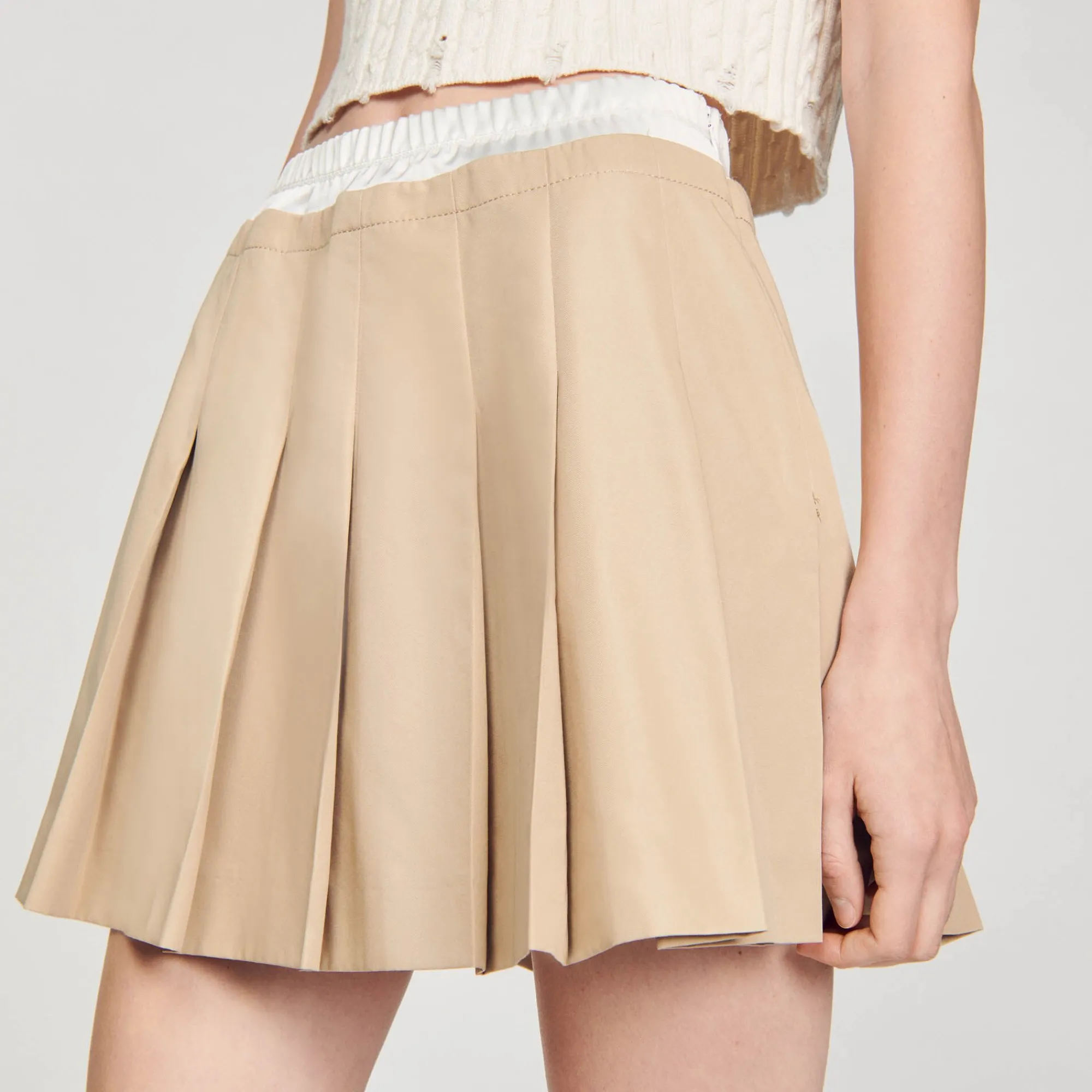 Saia Curta Plissada Com Calça Estilo Cós Elástico Contrastante. Saia Curta Sandro Femme Mesas Cintura Elástica Contr…