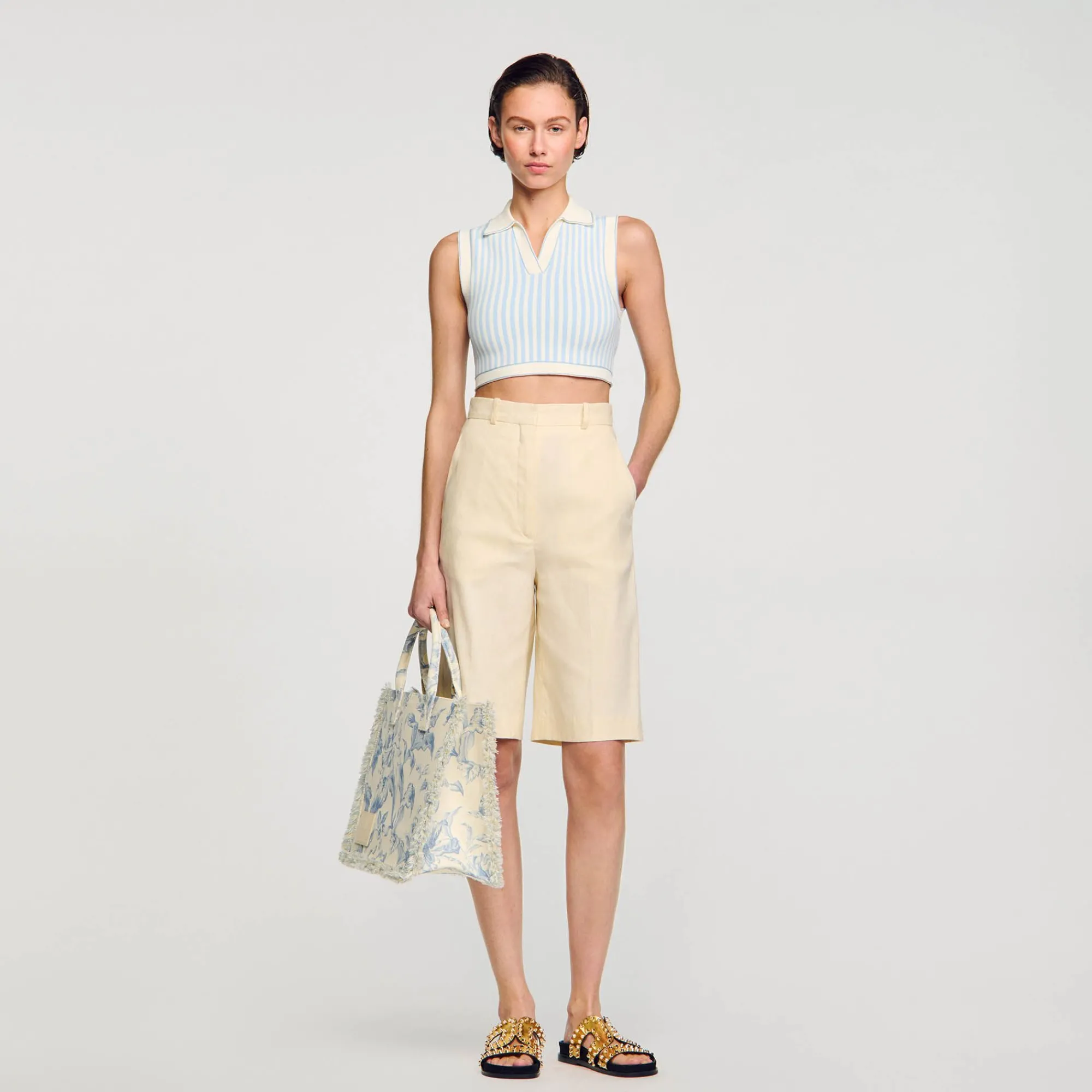 Camisola Curta Às Riscas, Sem Mangas, Com Gola Pólo Aberta E Orlas Em Contraste. Suéter Curto Feminino De Malha Sandr…