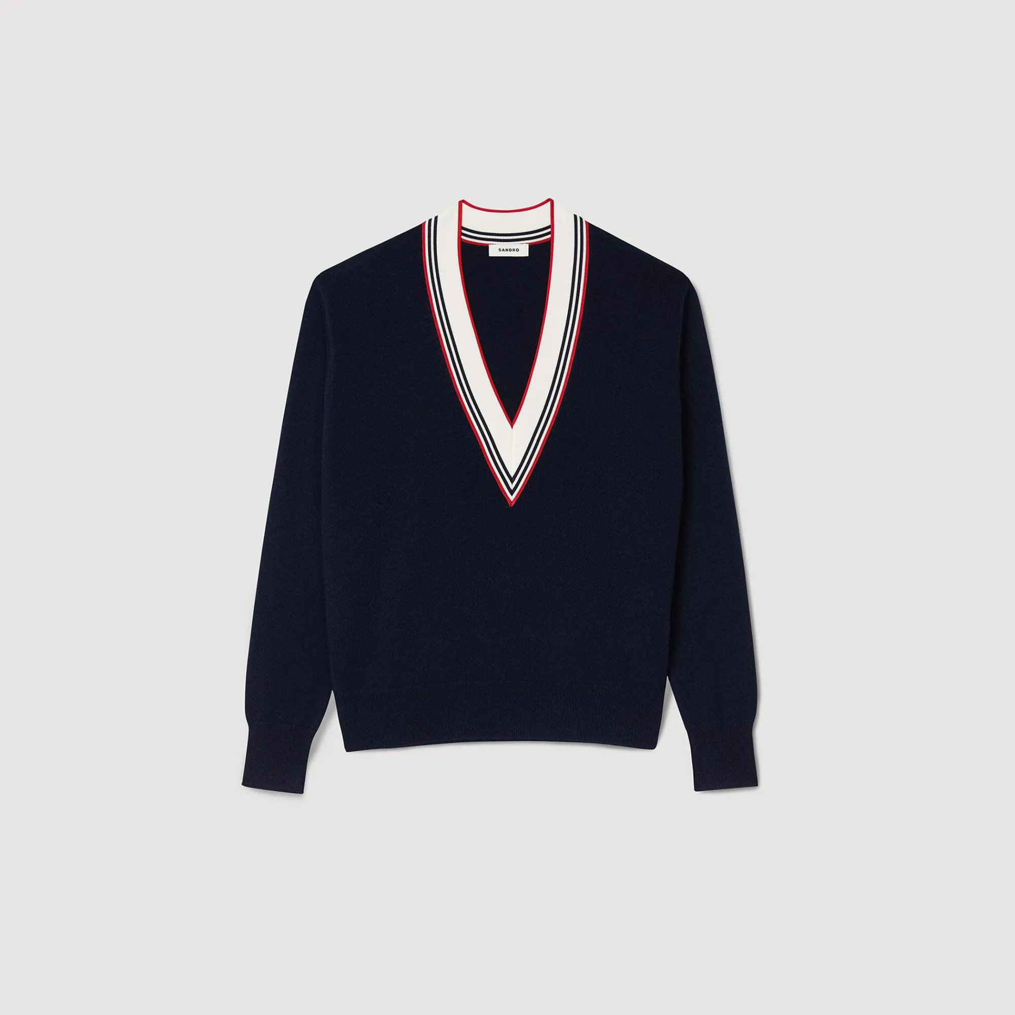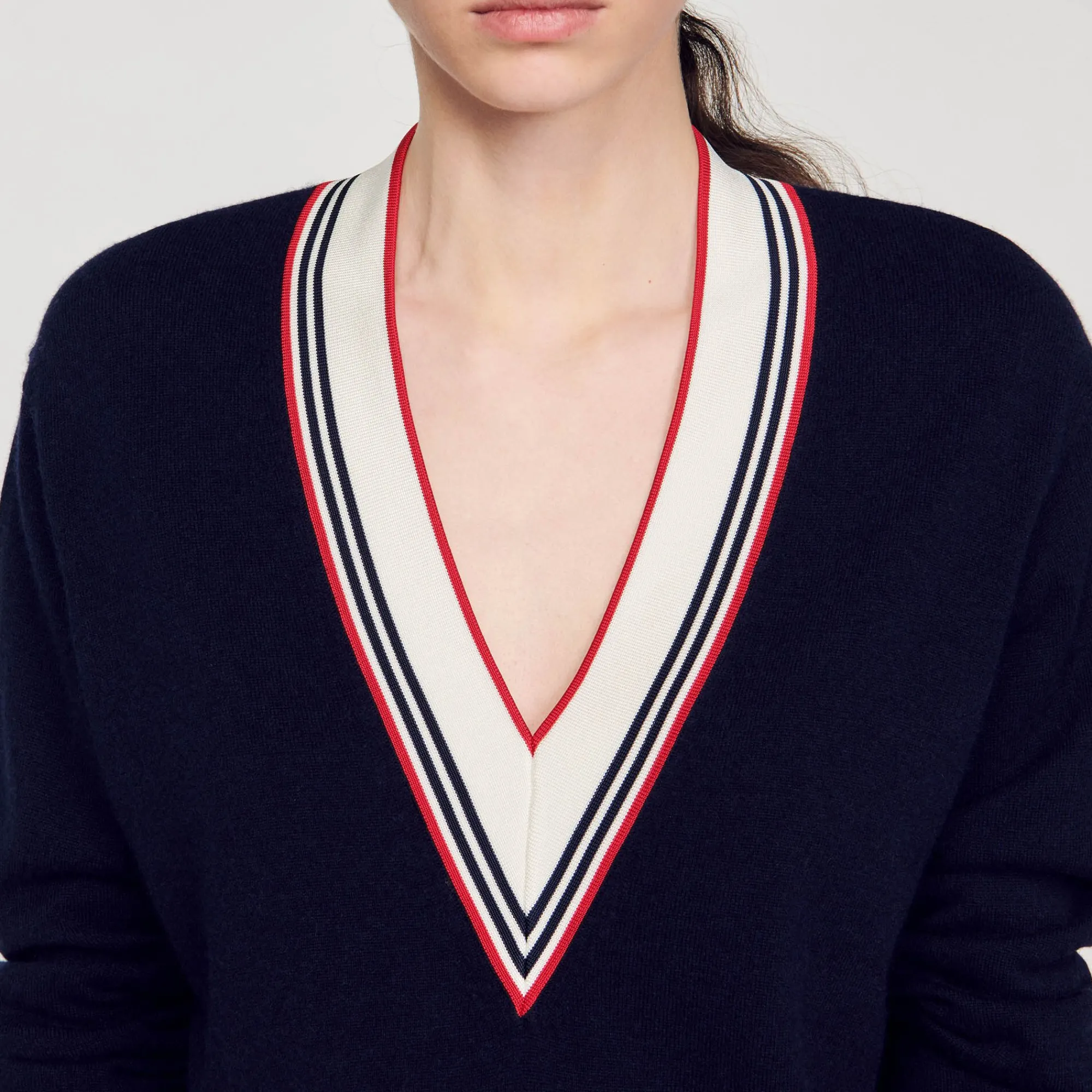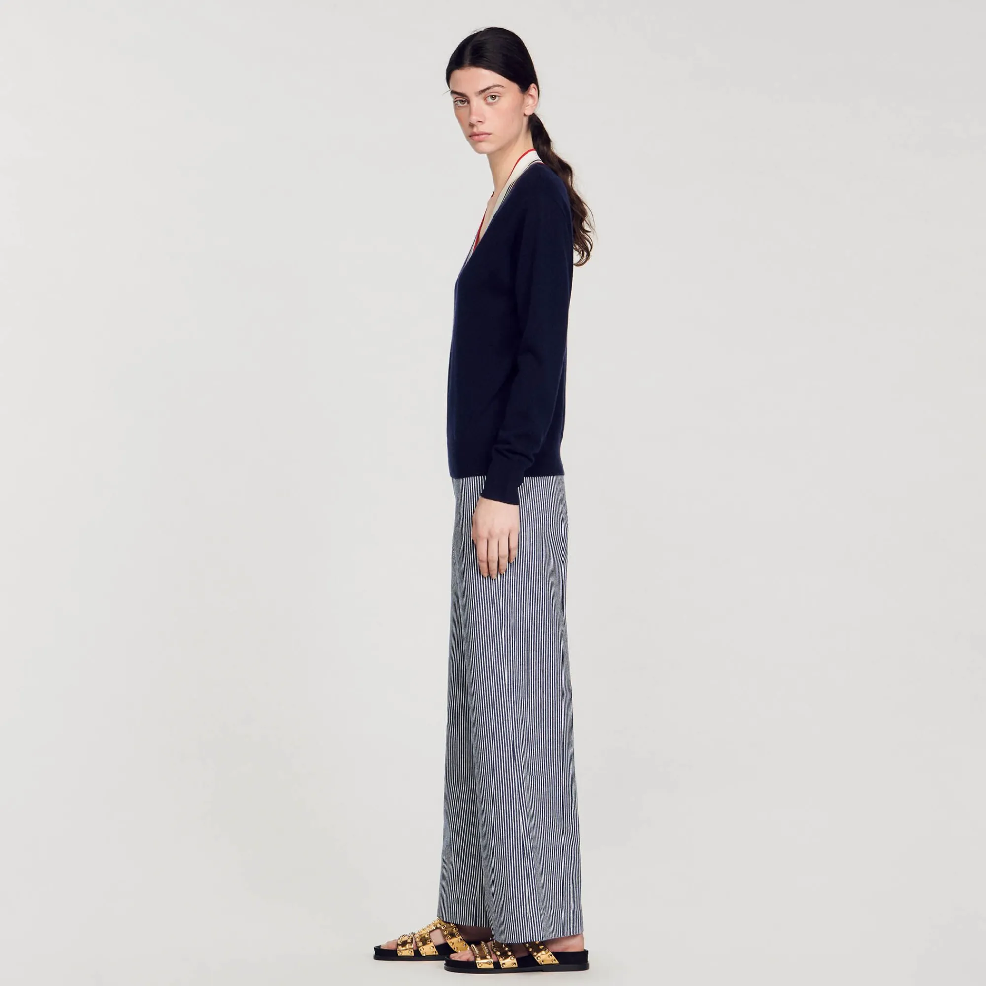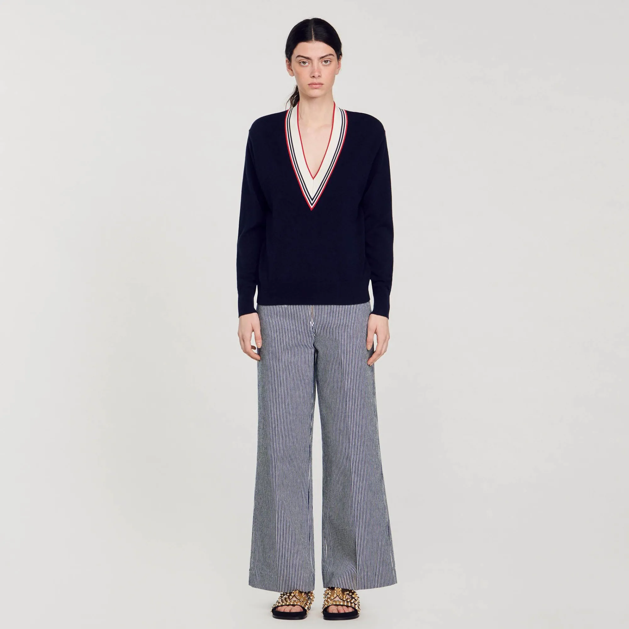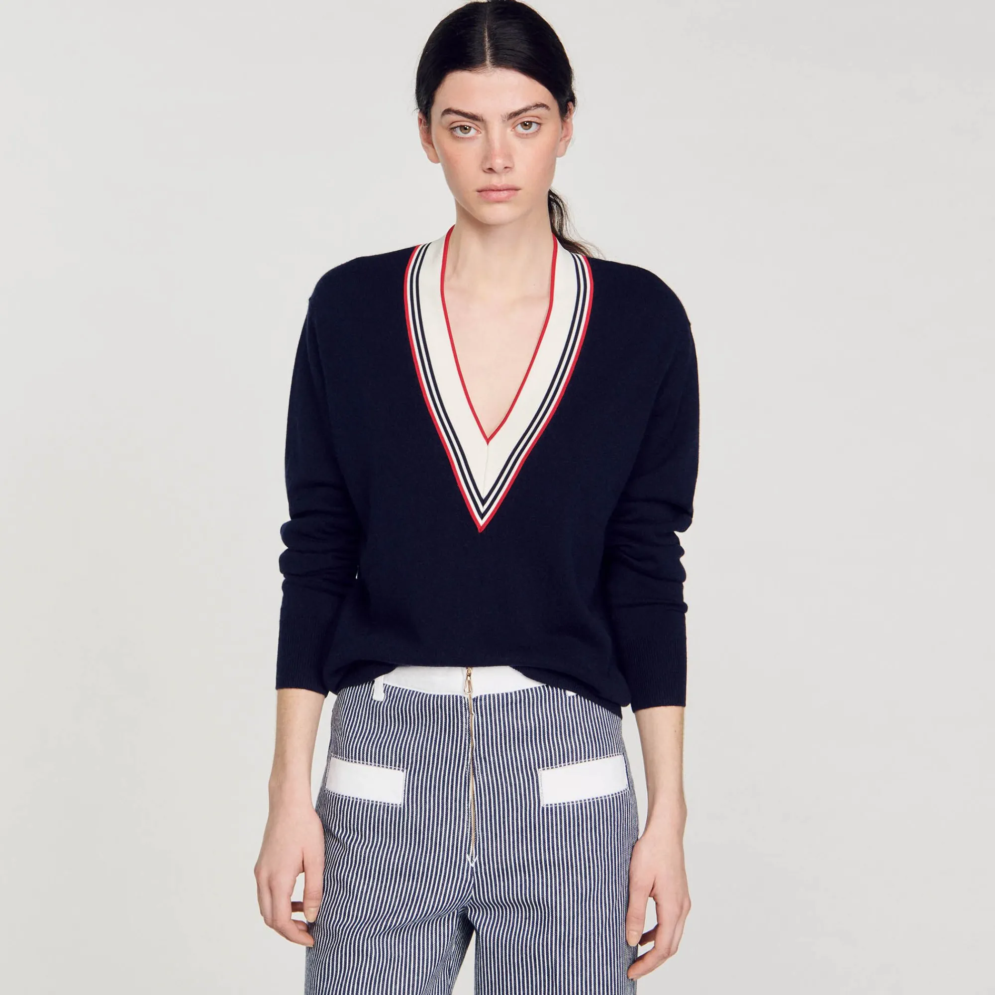Suéter De Lã E Caxemira Com Decote Em V Listrado E Manga Comprida Decorada Com Listras No Pescoço. Suéter Sandro Fem…