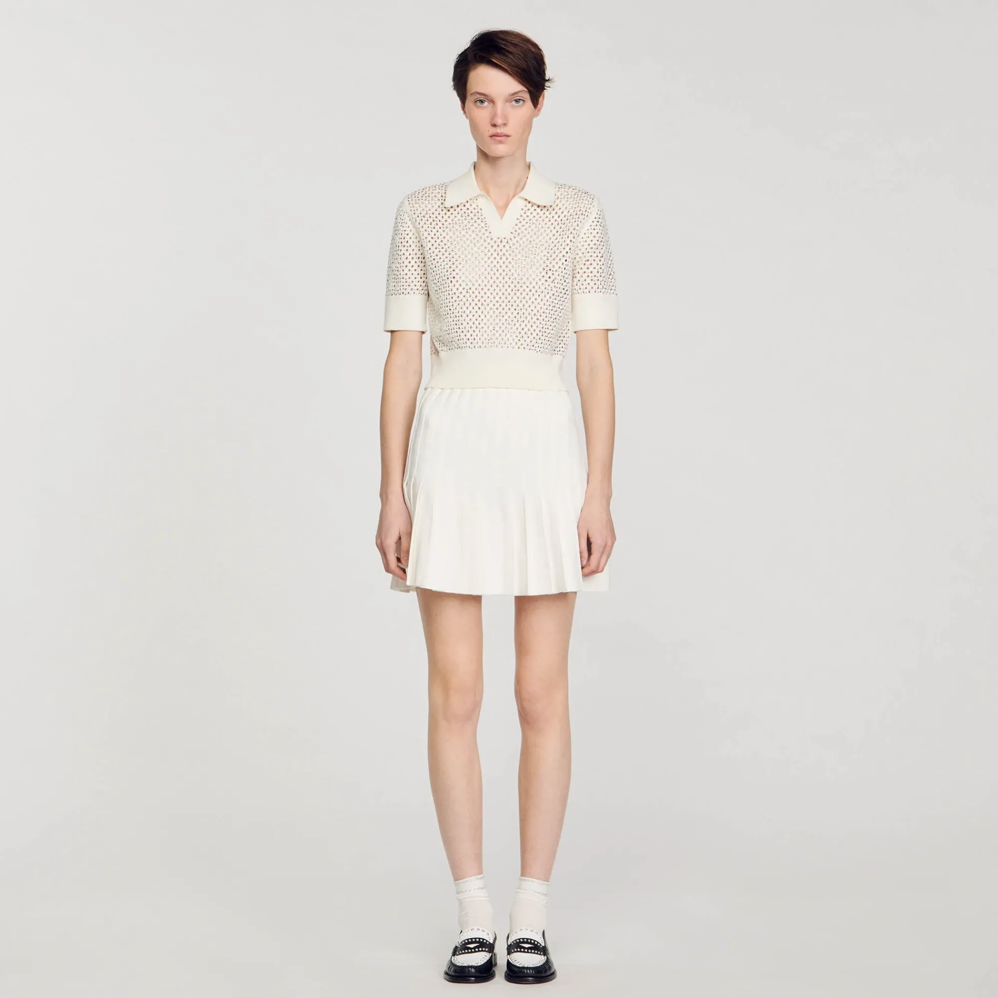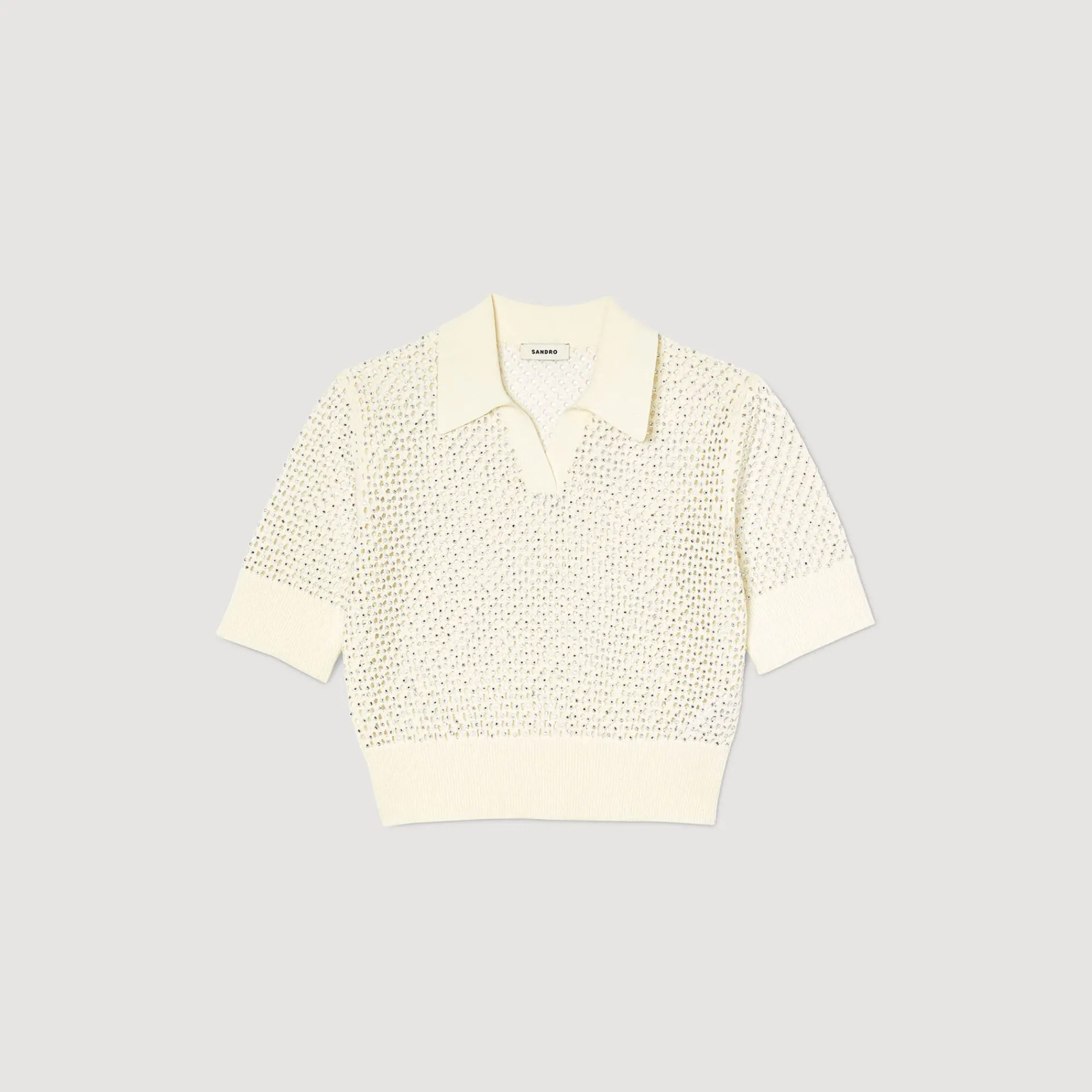 Camisola Curta Em Malha De Malha Com Detalhe De Strass, Gola Pólo, Mangas Curtas E Bainha Canelada. Suéter Pólo Femin…