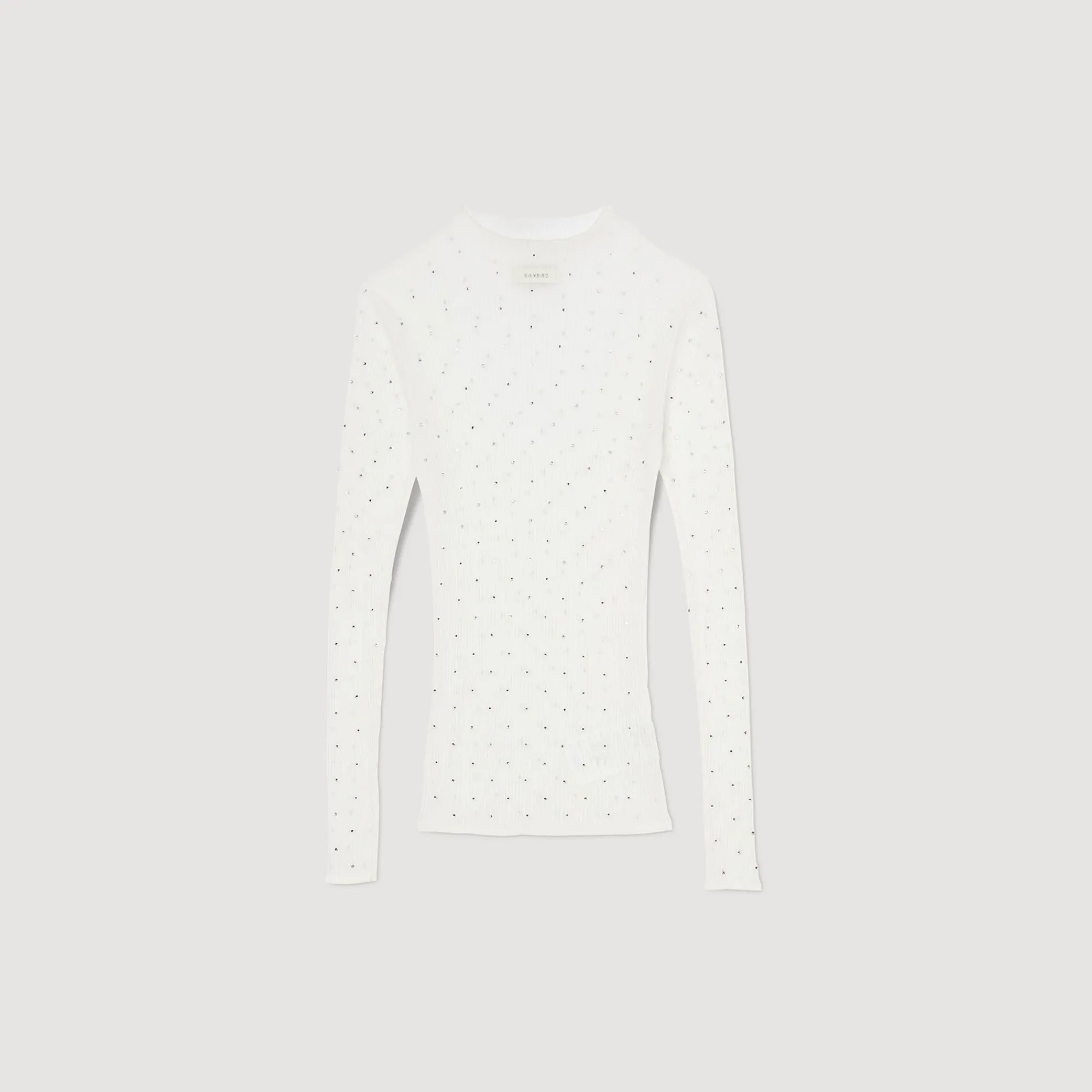 Suéter De Malha Fina Transparente E Canelado, Decorado Com Strass Em Toda A Peça. Possui Gola Alta, Mangas Longas E Babados Nas Bordas.