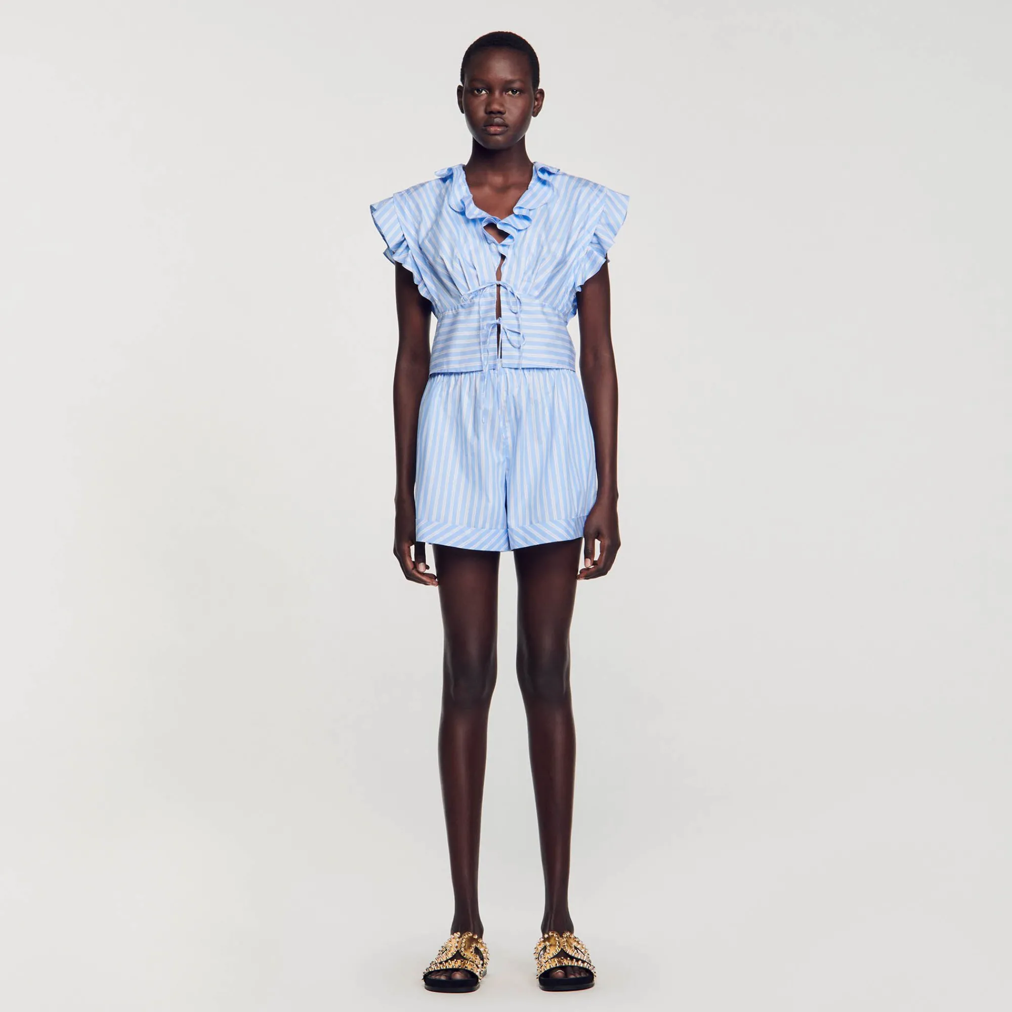 Top Listrado De Popeline De Algodão Com Decote Em V E Mangas Curtas Com Babados, Além De Alças Para Amarrar.