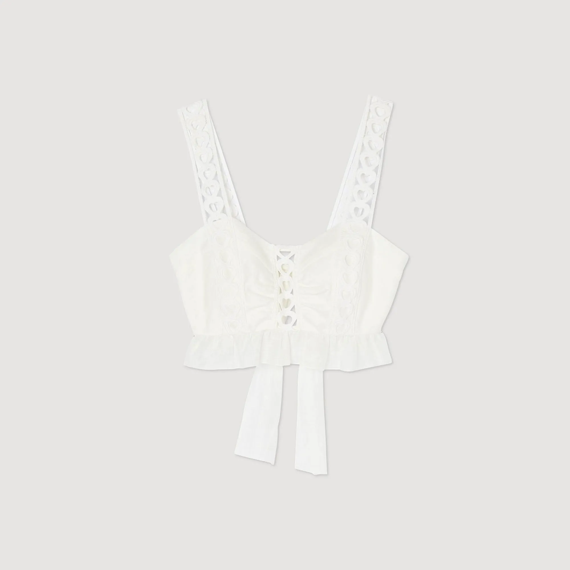Top Curto Em Mistura De Linho Com Acabamento Em Coração Vazado, Alças, Babado Sob O Busto E Alças Para Amarrar Nas Costas.