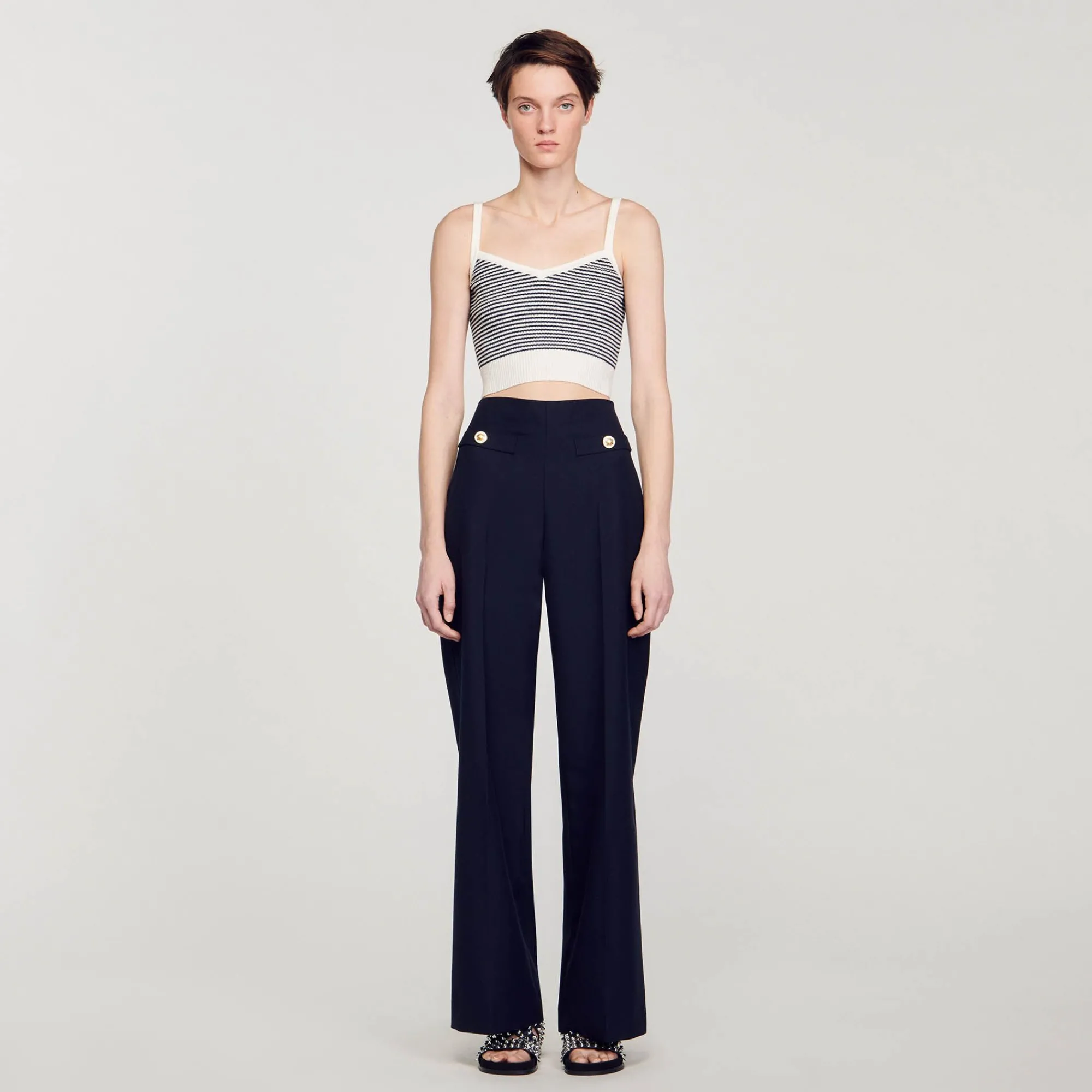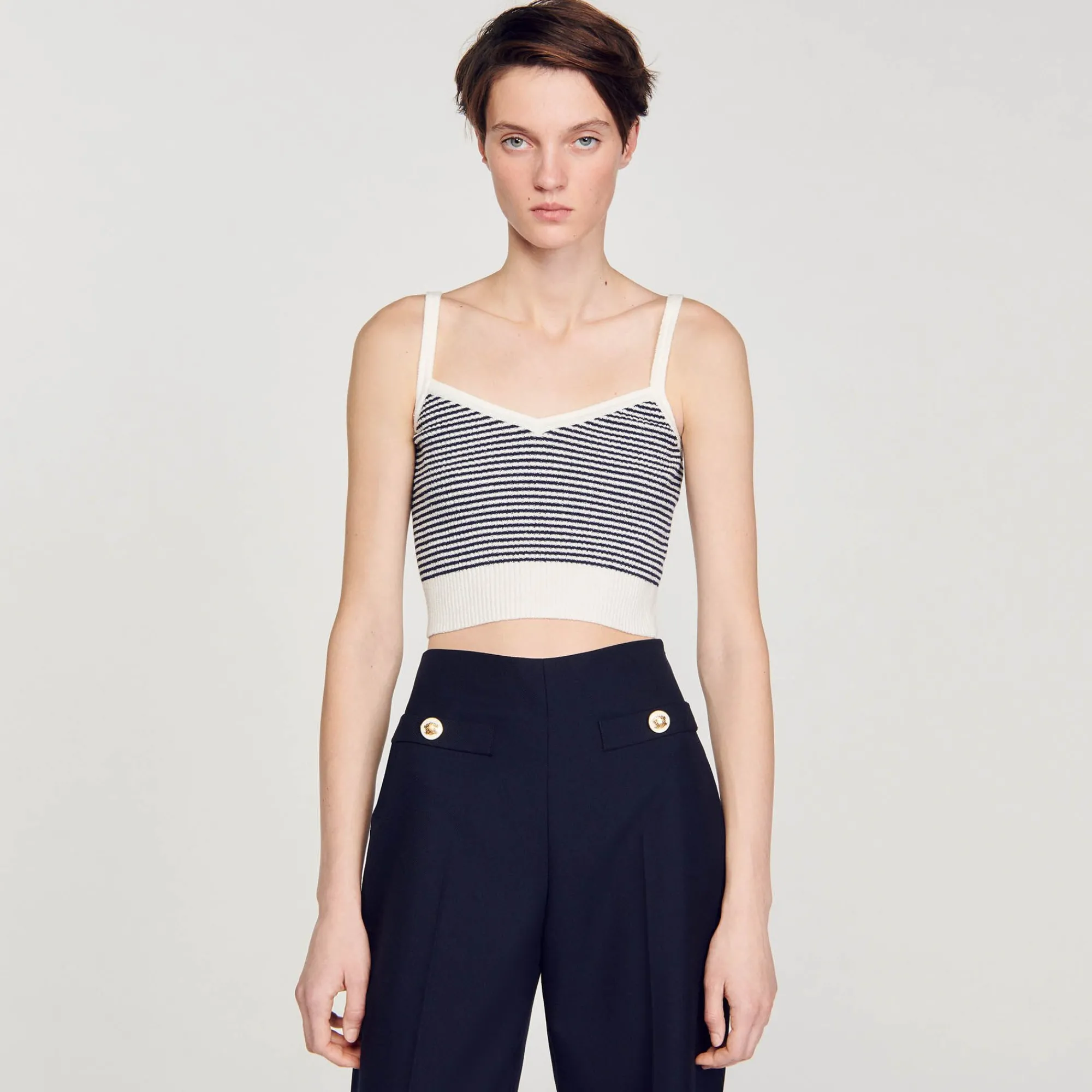 Top Cropped Em Malha Atoalhada Listrada, Com Alças Finas E Acabamento Canelado Contrastante.