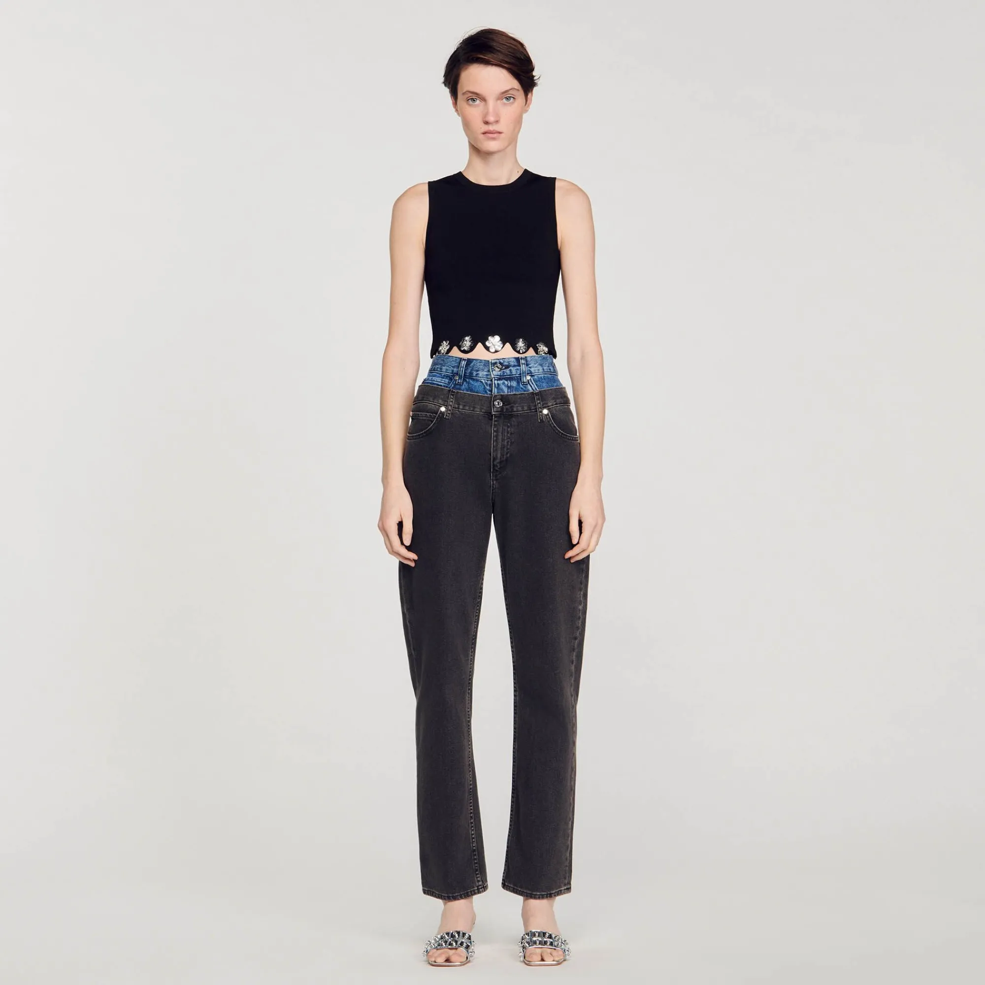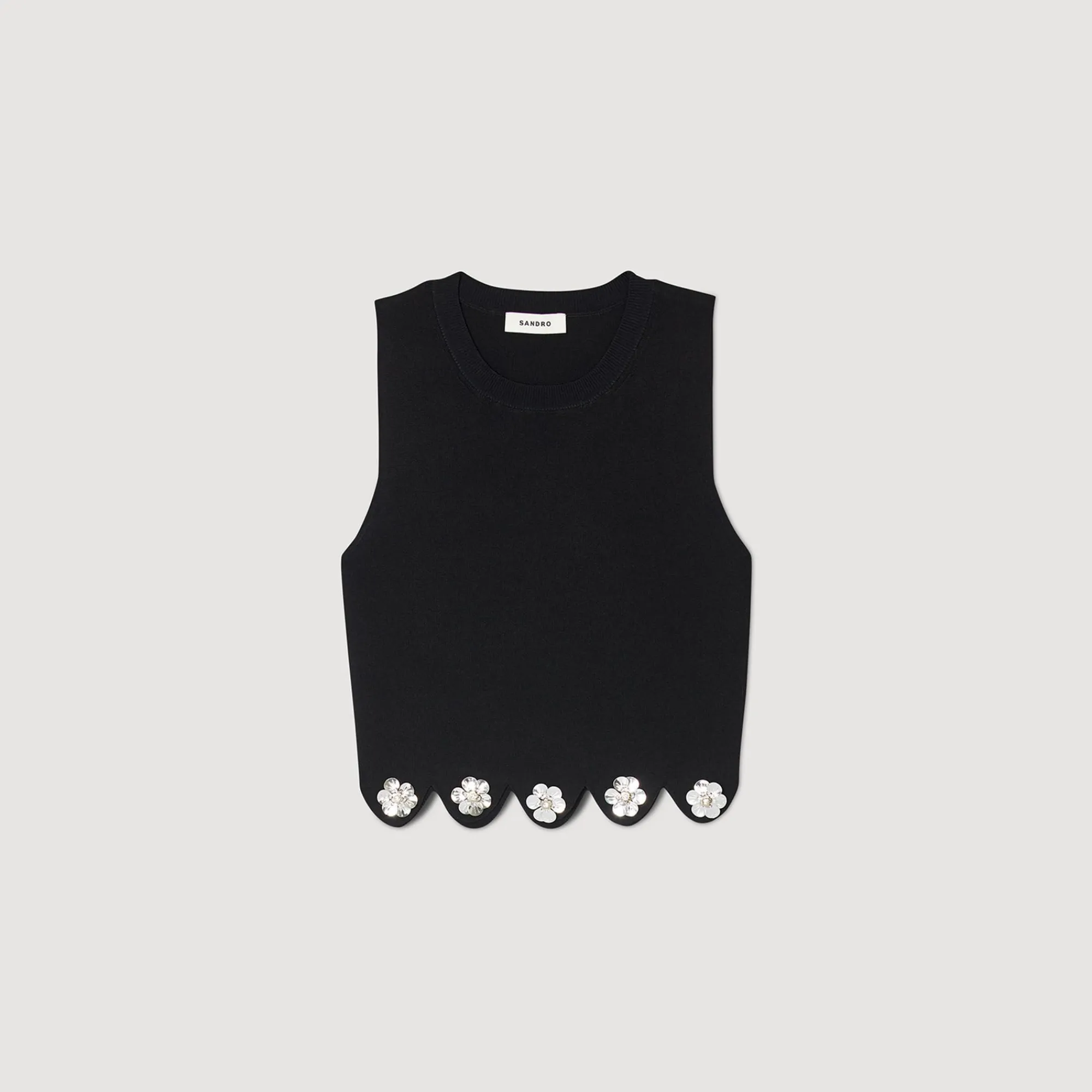 Top Curto De Malha Sem Mangas Com Decote Redondo E Bainha Recortada Decorada Com Flores De Lantejoulas.